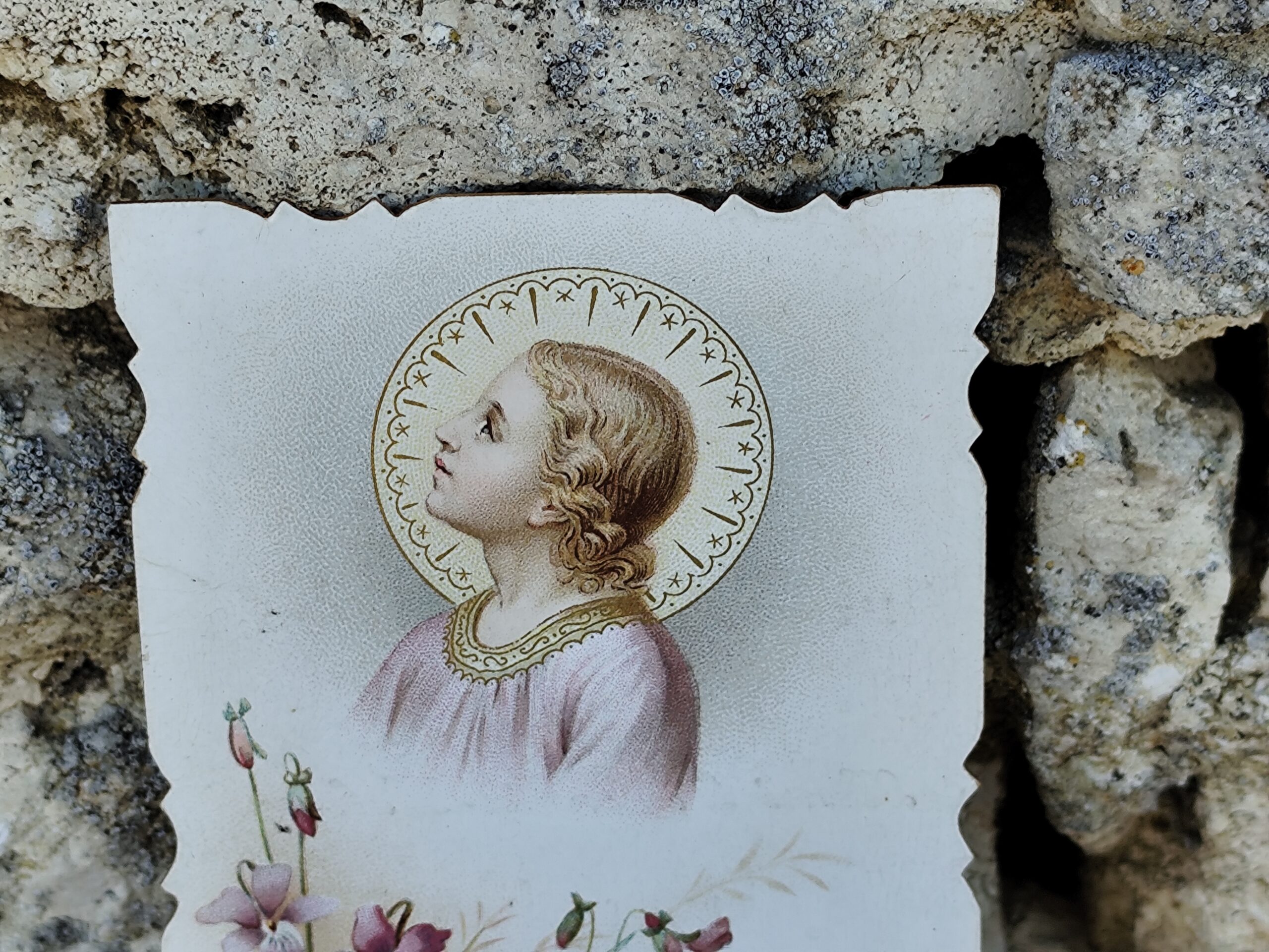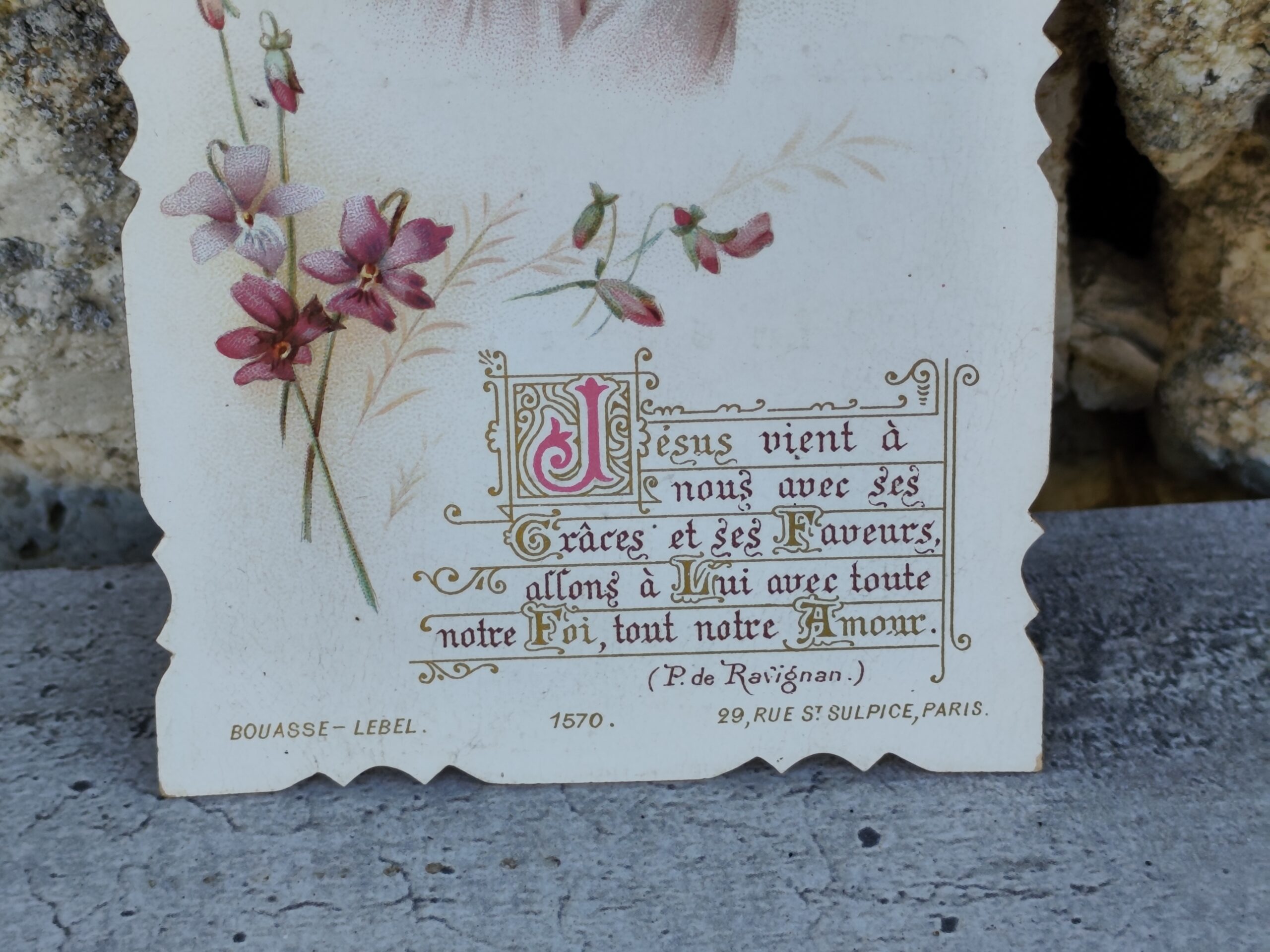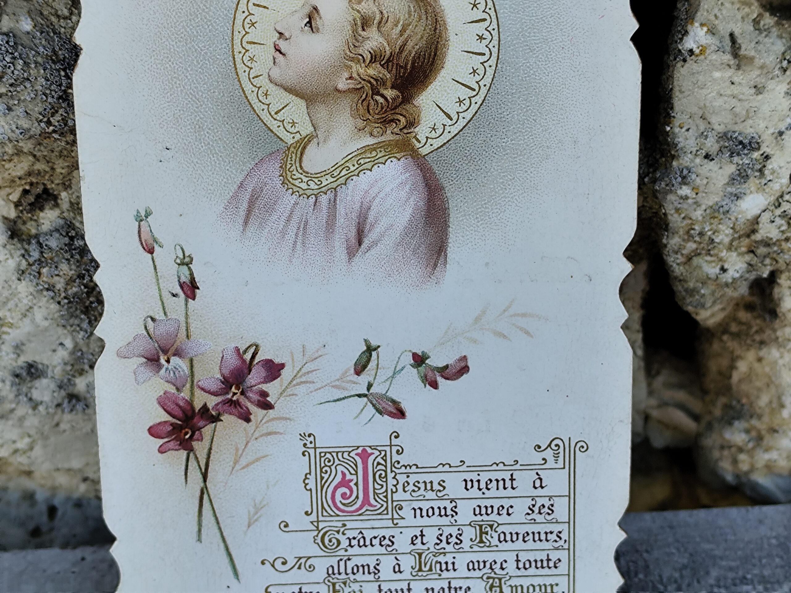 Le texte imprimé en bas, dans une typographie raffinée, évoque la grâce et l’amour divin, typique des éditions religieuses du XIXᵉ siècle. Les bords délicatement découpés ajoutent une touche de finesse et de charme ancien.