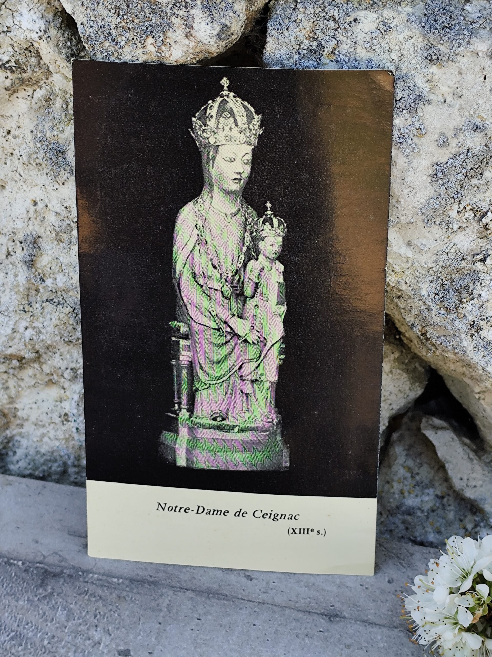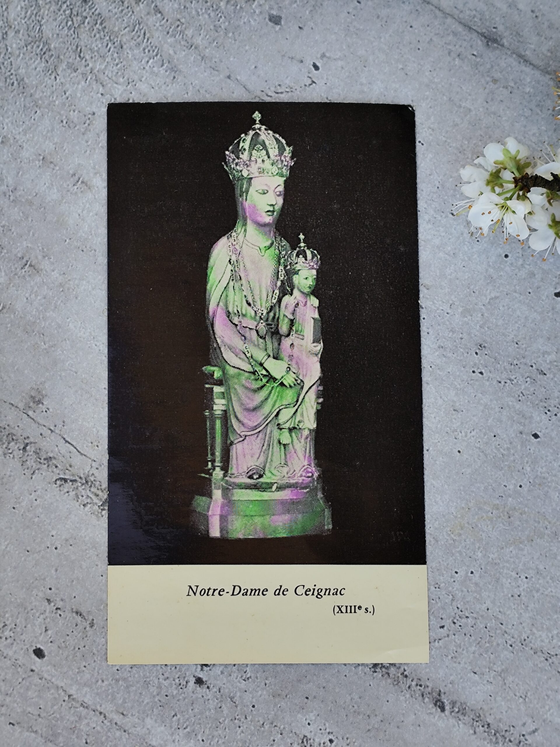 Carte religieuse représentant Notre‑Dame de Ceignac, statue mariale du XIIIᵉ siècle vénérée dans l’Aveyron.