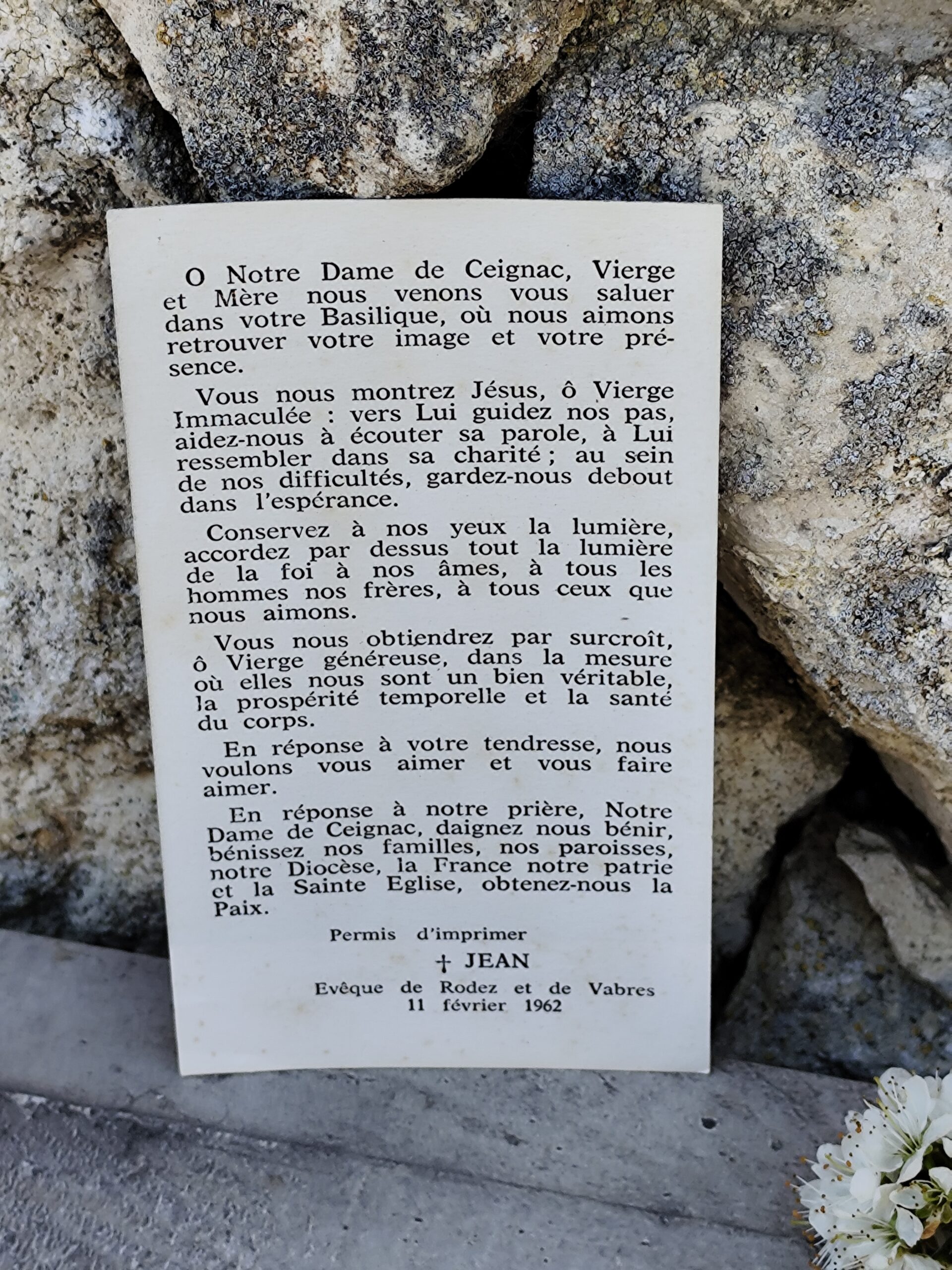 Carte religieuse Notre‑Dame de Ceignac (XIIIᵉ siècle) avec prière