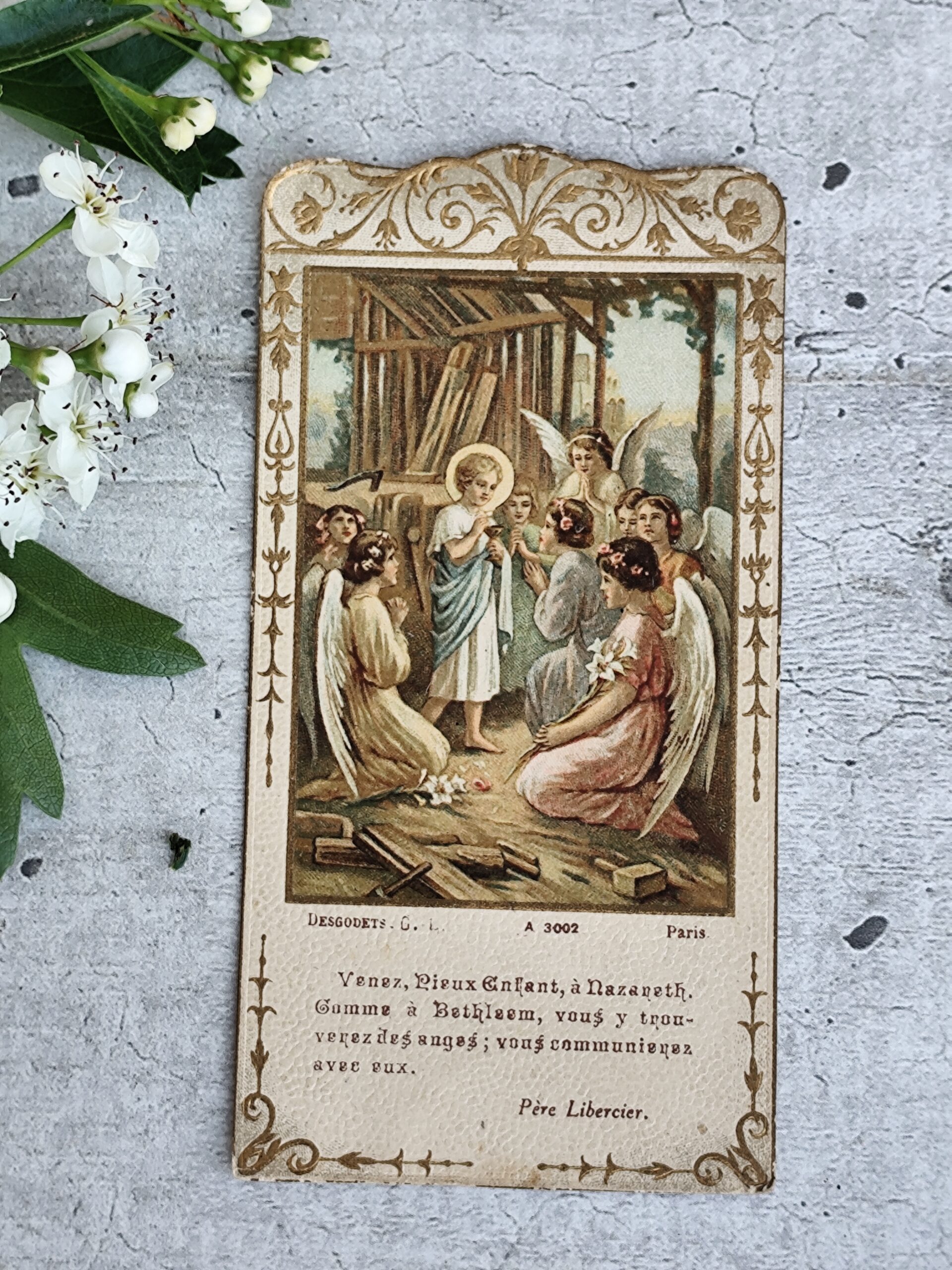 Texte imprimé : « Venez, Pieux Enfant, à Nazareth… Vous y trouverez des anges; vous communierez avec eux. – Père Libercier. »