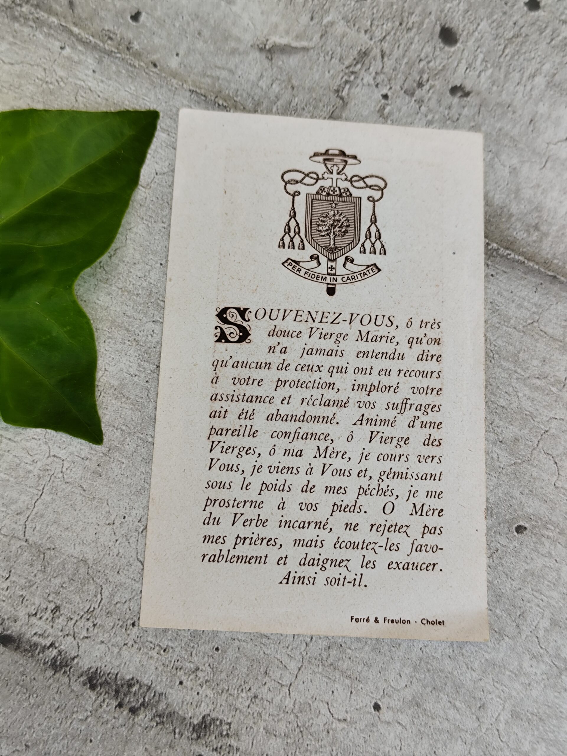Au verso, une prière à la Vierge Marie : Souvenez‑vous, ô très douce Vierge Marie…, symbole de confiance et de dévotion.