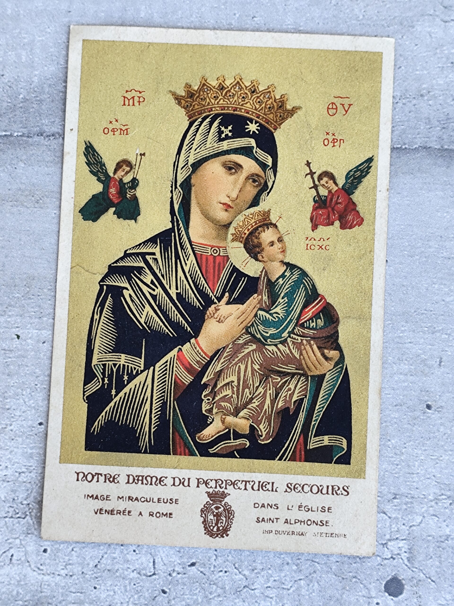 Carte religieuse ancienne – Notre‑Dame du Perpétuel‑Secours + prière (Duverjay, St‑Étienne).