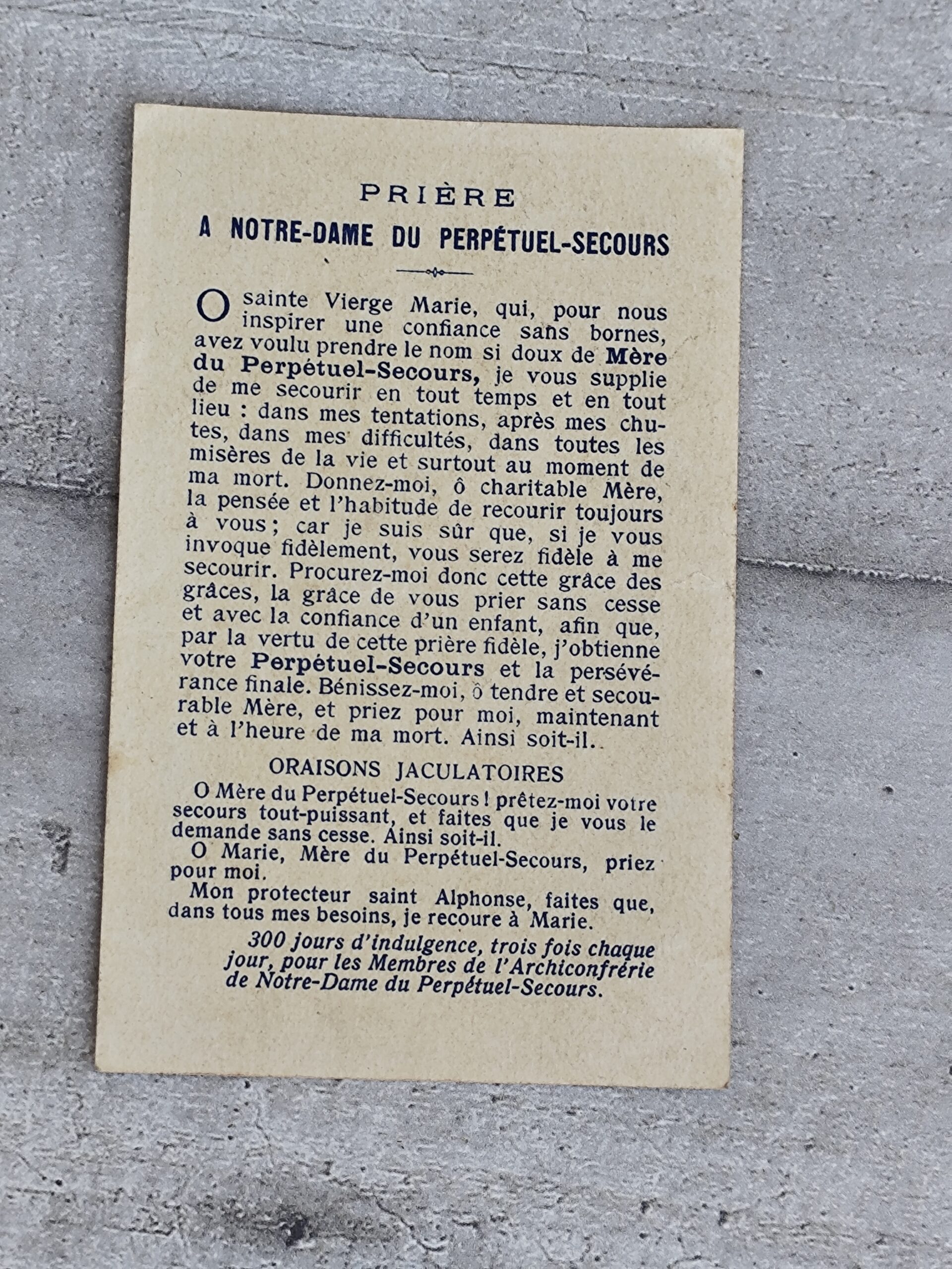 Au verso, une prière complète à Notre‑Dame du Perpétuel‑Secours, accompagnée d’oraisons jaculatoires et de la mention des indulgences accordées aux membres de l’Archiconfrérie.