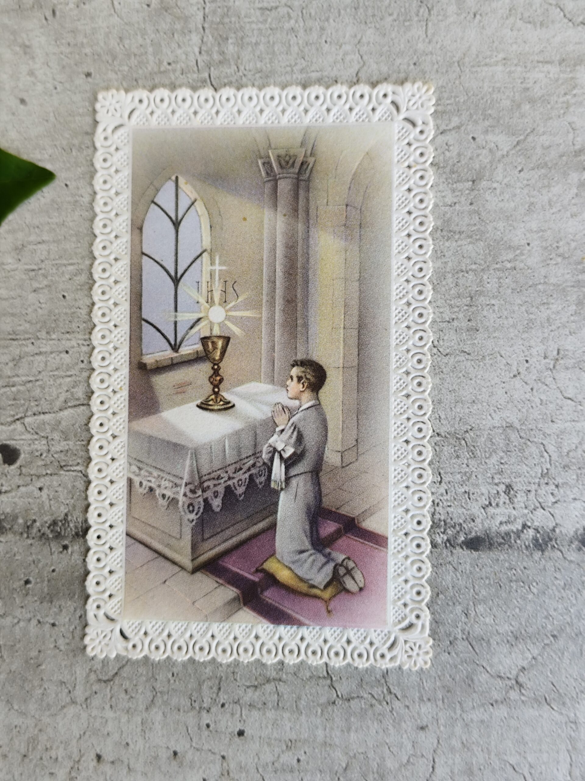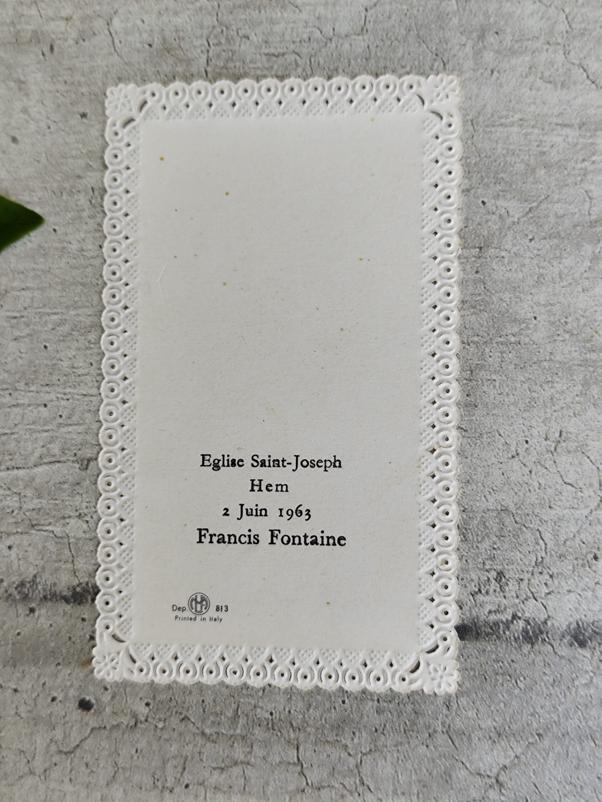 Élégante carte canivet religieuse italienne datée de 1963, finement ajourée, typique des productions dévotionnelles du milieu du XXᵉ siècle.