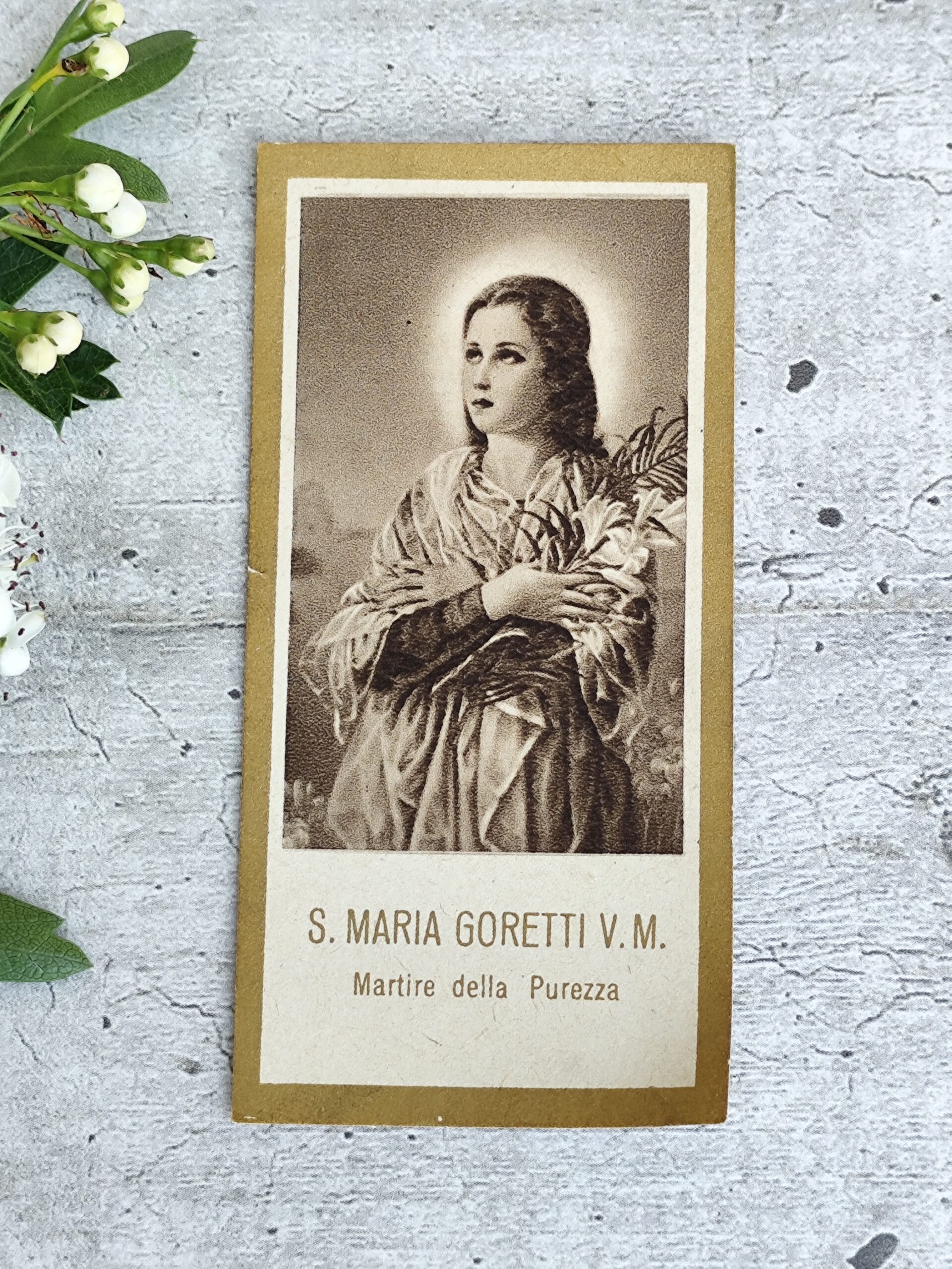 Cette carte religieuse Sainte Maria Goretti est une belle image pieuse ancienne dédiée à la jeune martyre italienne, symbole de pureté, de pardon et de force intérieure.