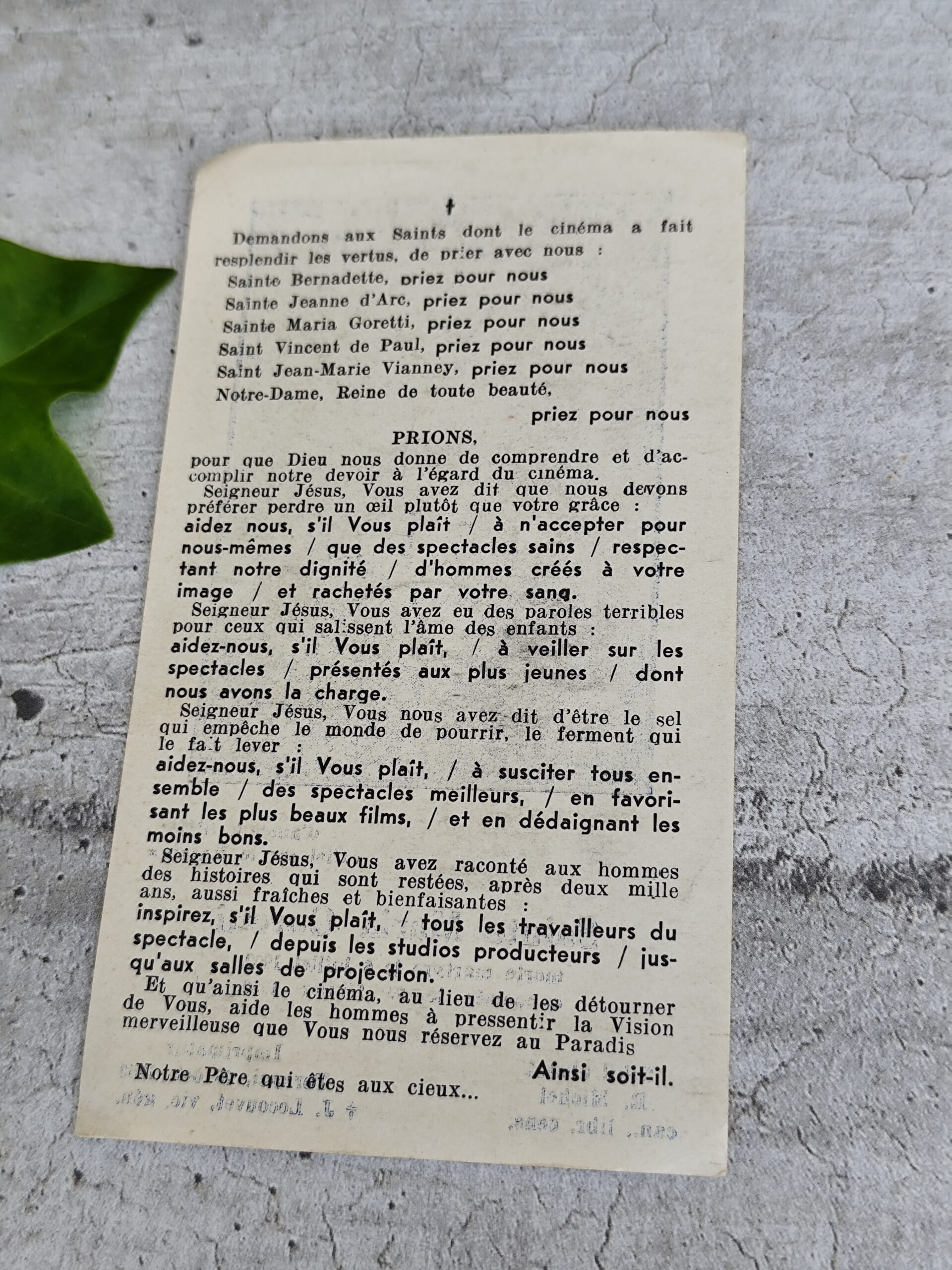 Au verso, une prière rare liée au cinéma, invoquant plusieurs saints pour guider les spectateurs vers des œuvres saines et édifiantes.