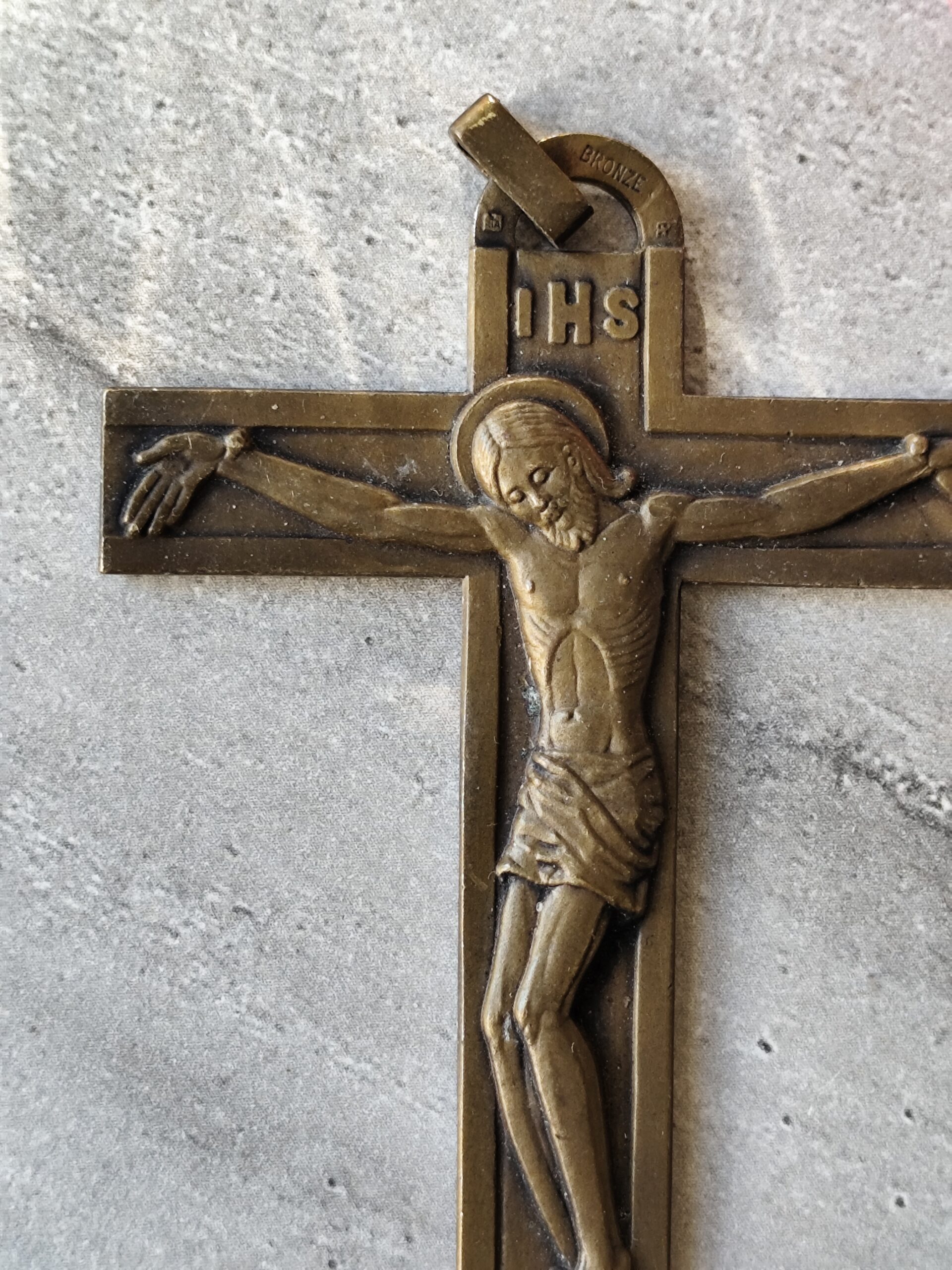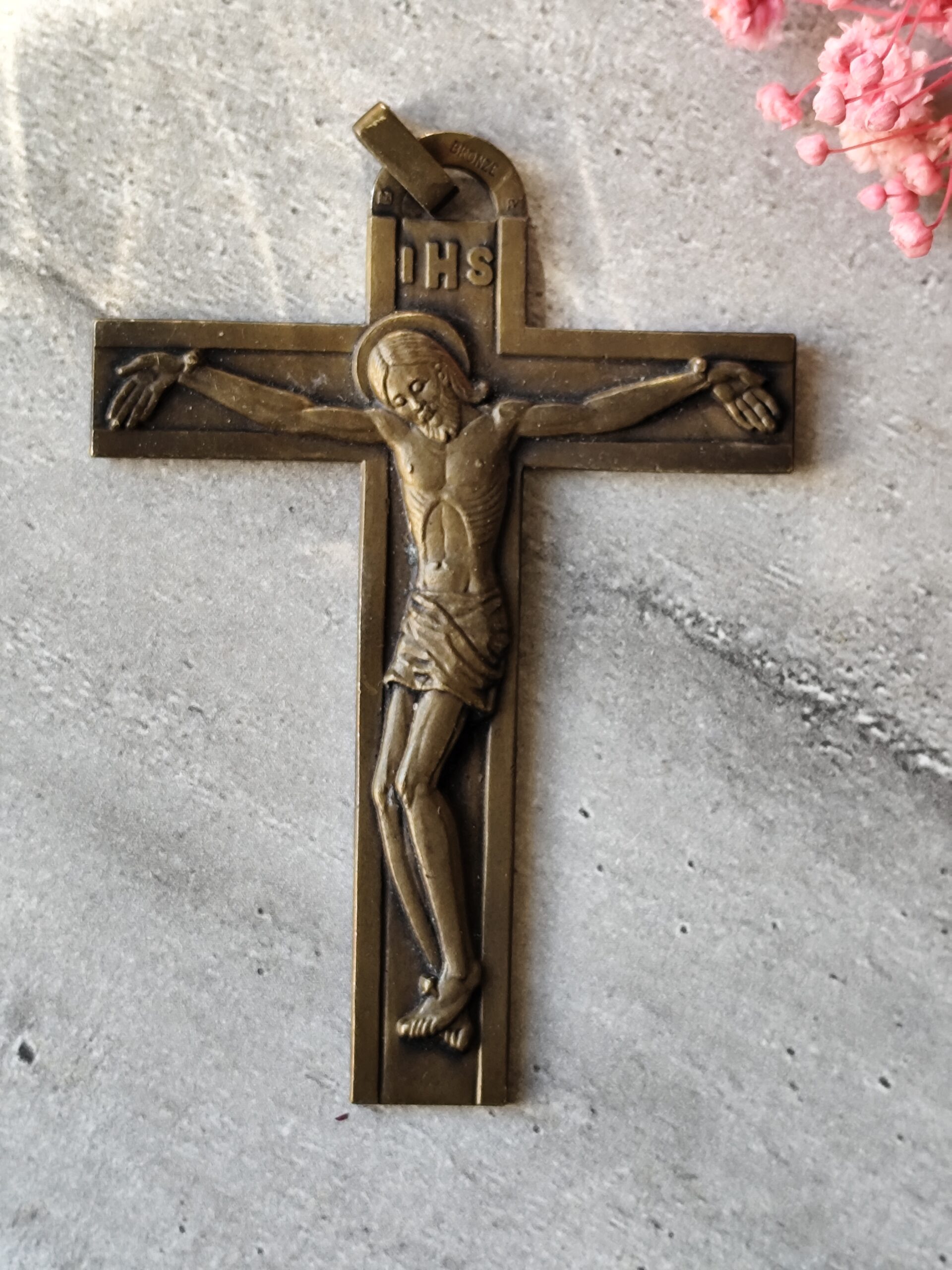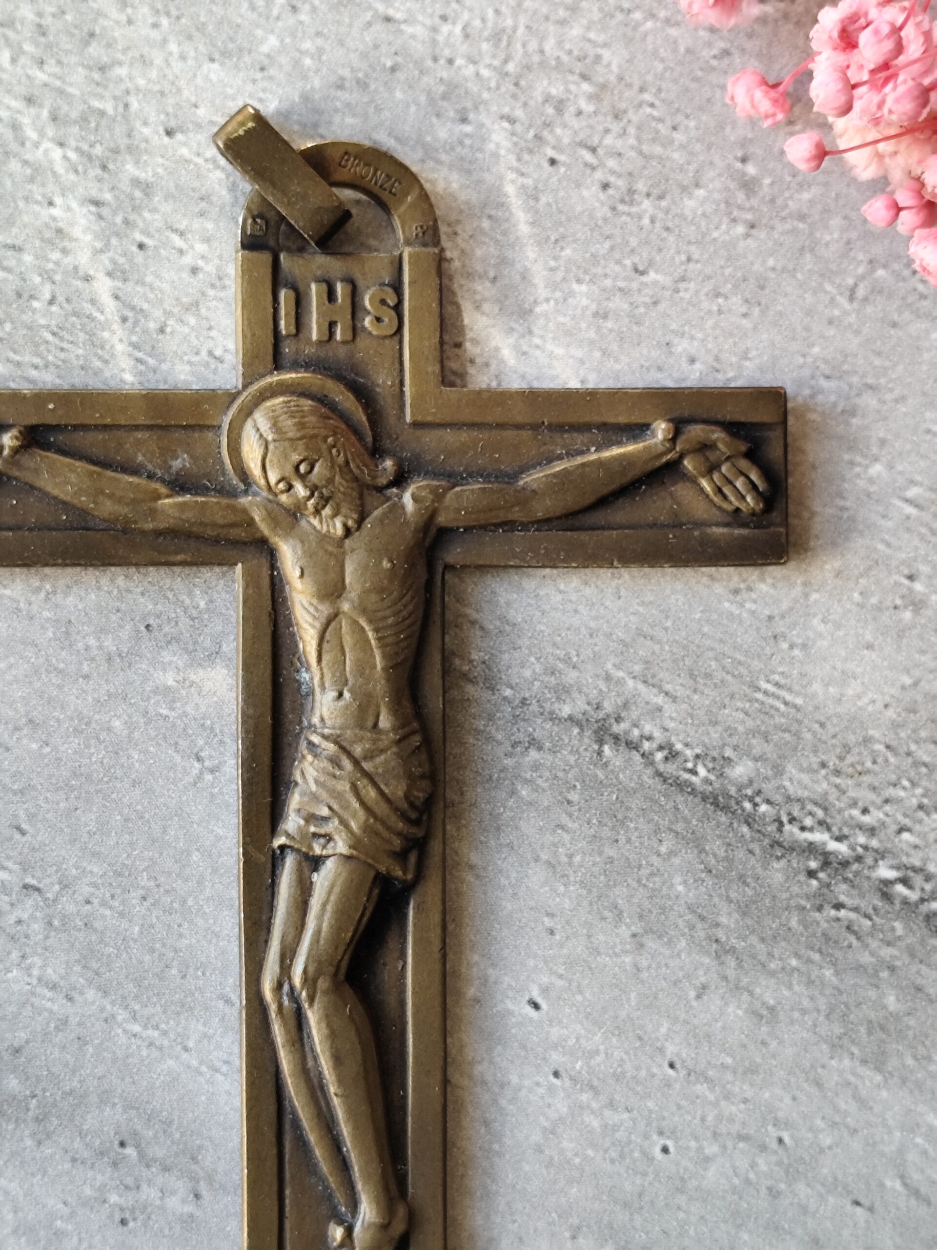 Crucifix ancien en bronze IHS • Croix chrétienne XIXe • Crucifix de dévotion • Art sacré ancien • Objet religieux vintage.