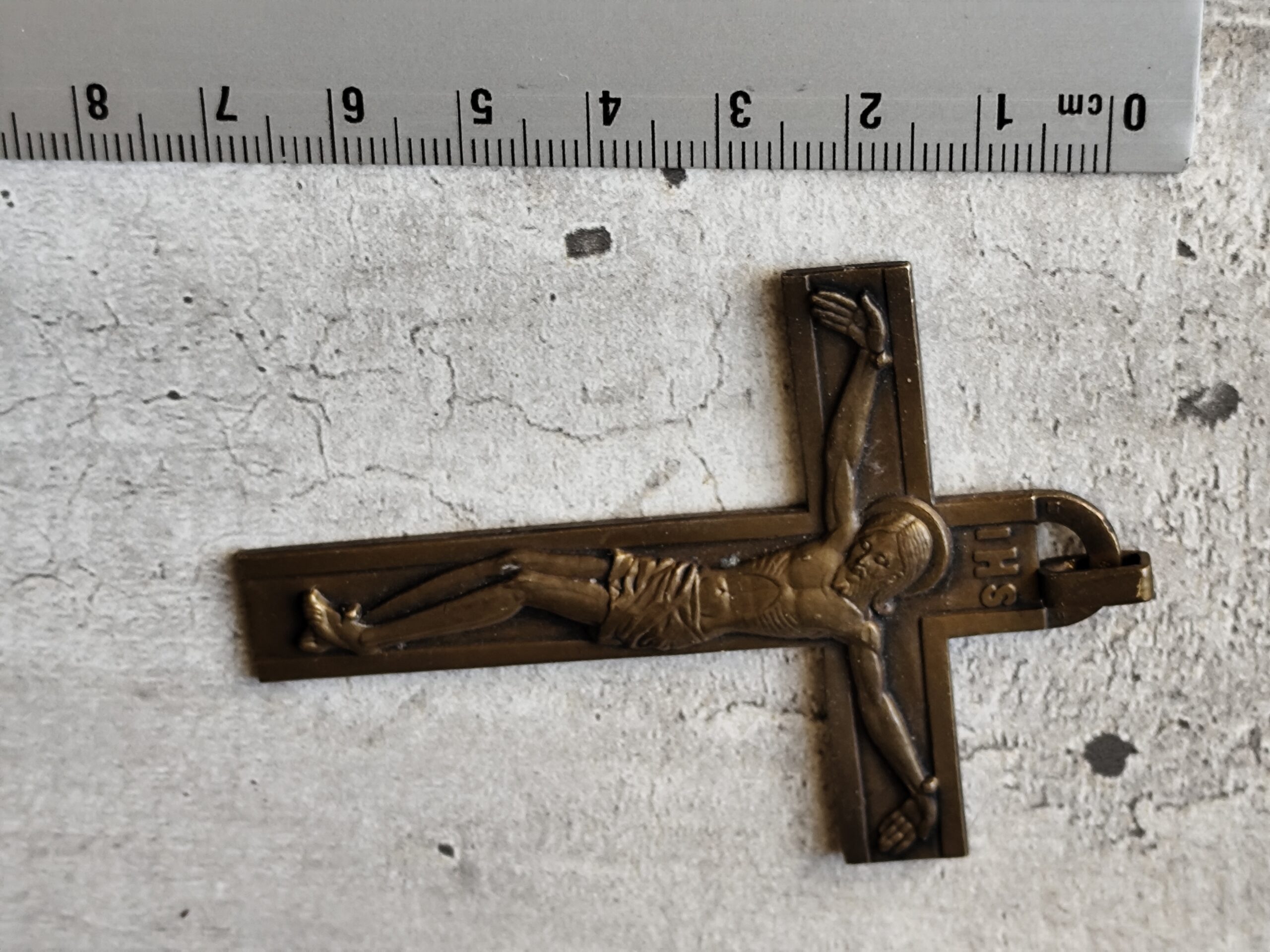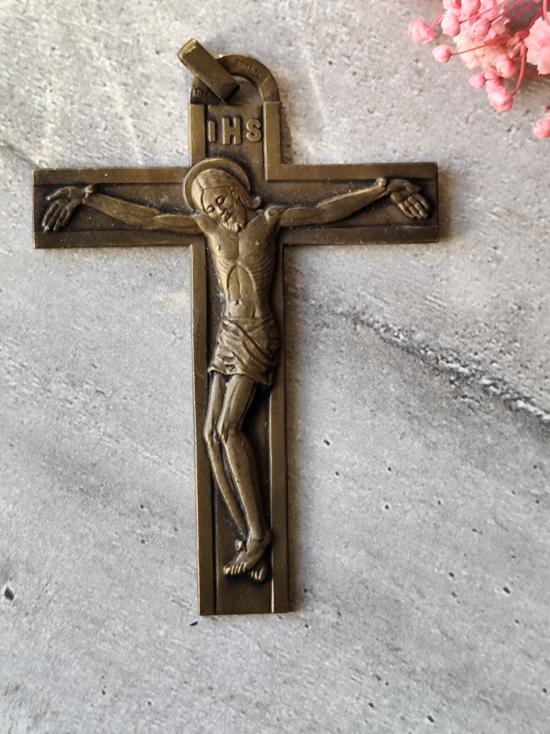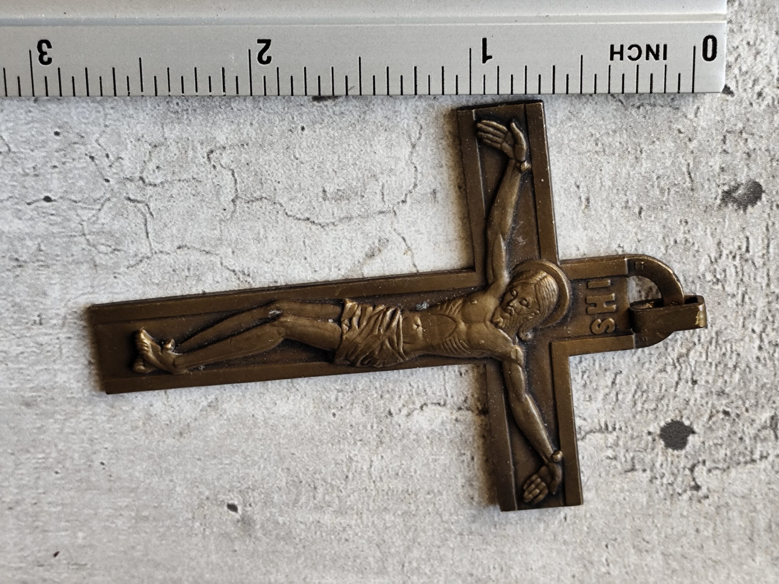 Crucifix ancien en bronze IHS • Croix chrétienne XIXe • Crucifix de dévotion • Art sacré ancien • Objet religieux vintage.