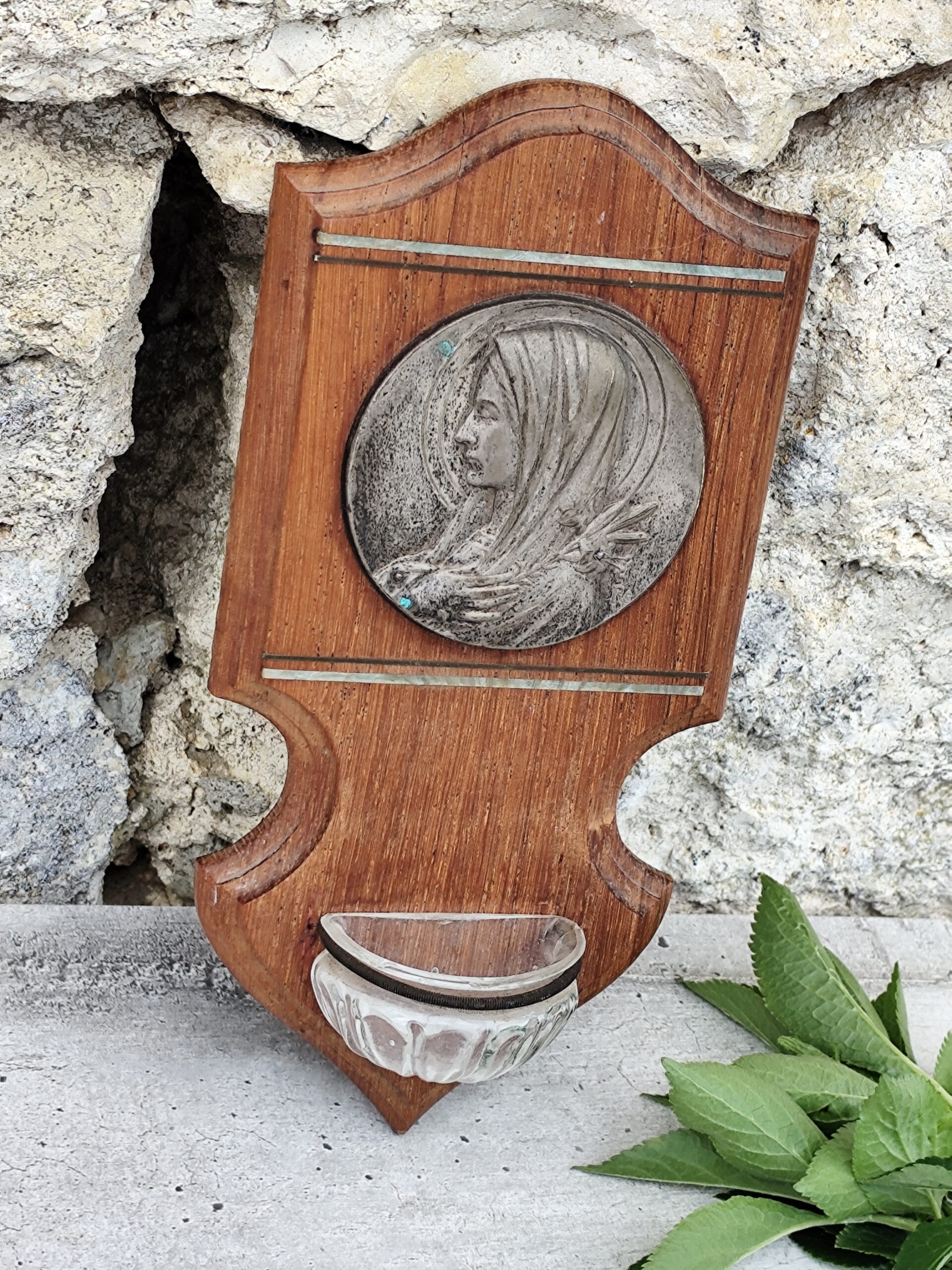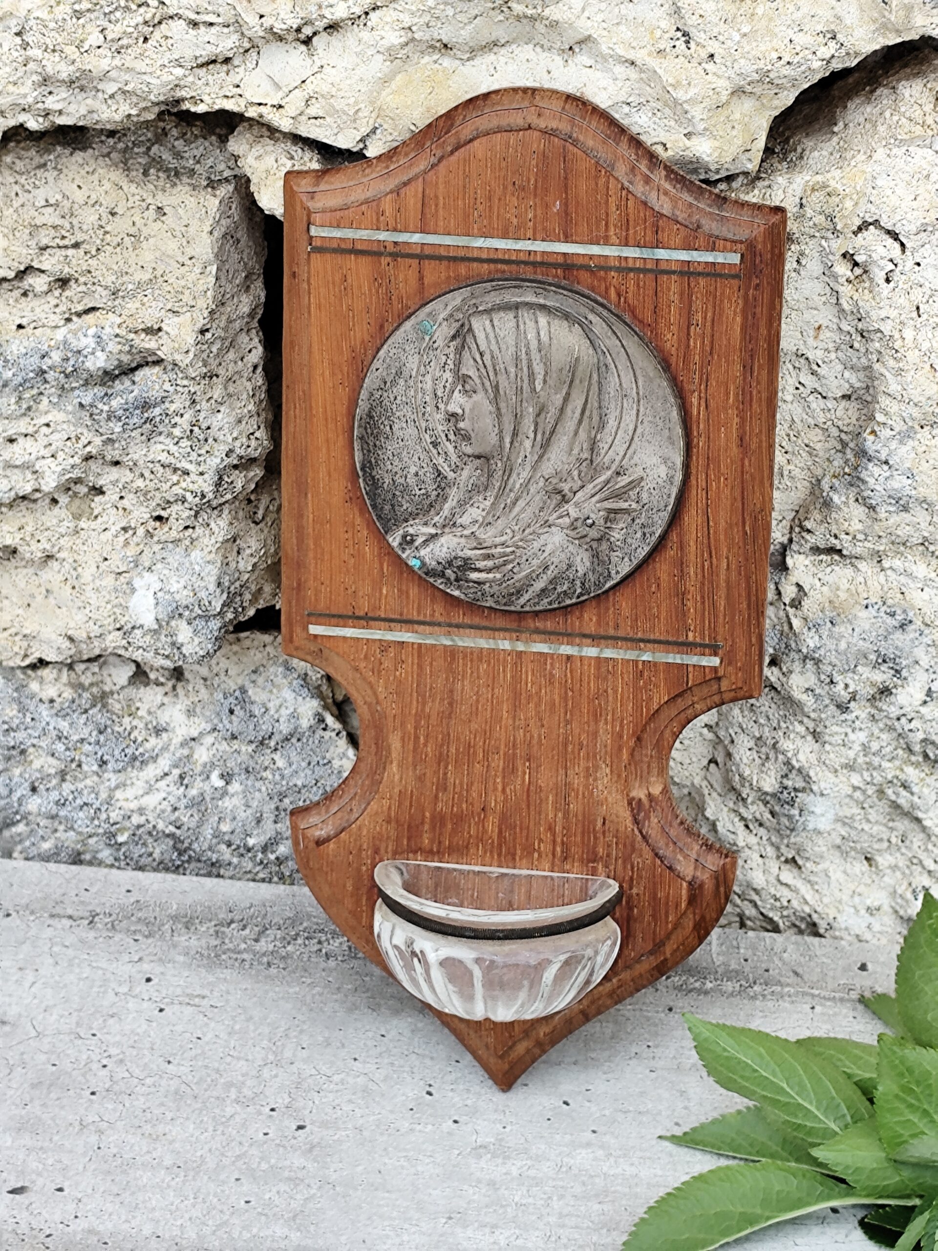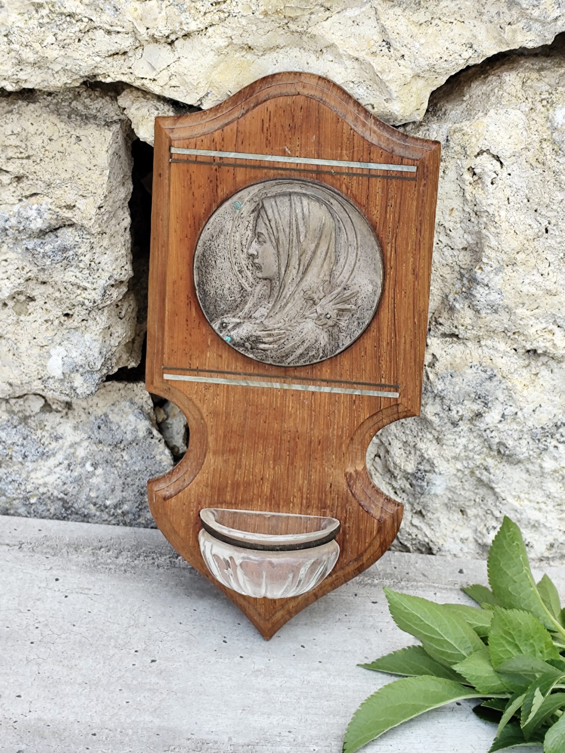 Ce bénitier mural associe la chaleur du bois sculpté à la délicatesse d’un médaillon métallique représentant une figure voilée, douce et recueillie — probablement une Vierge protectrice.
