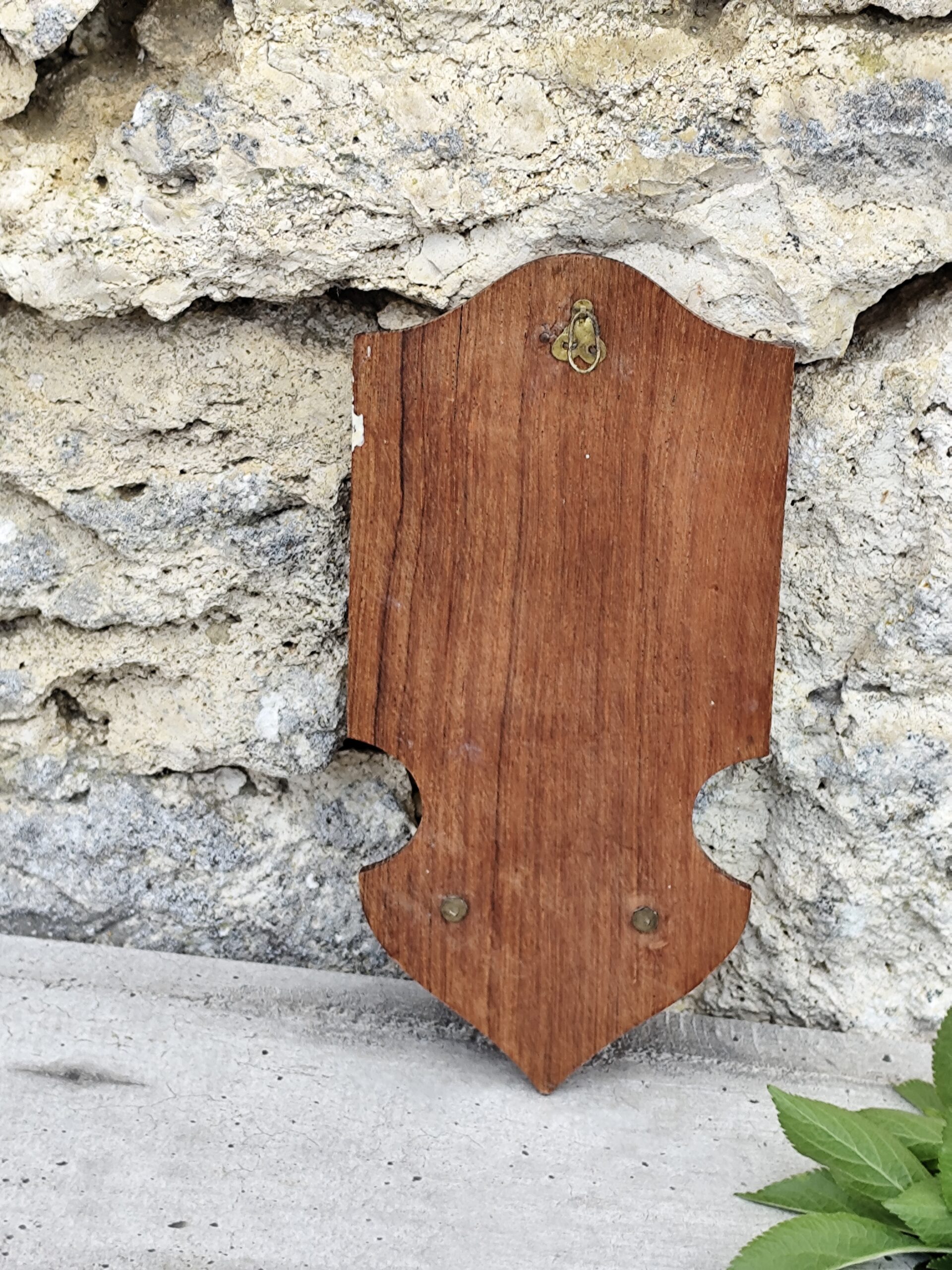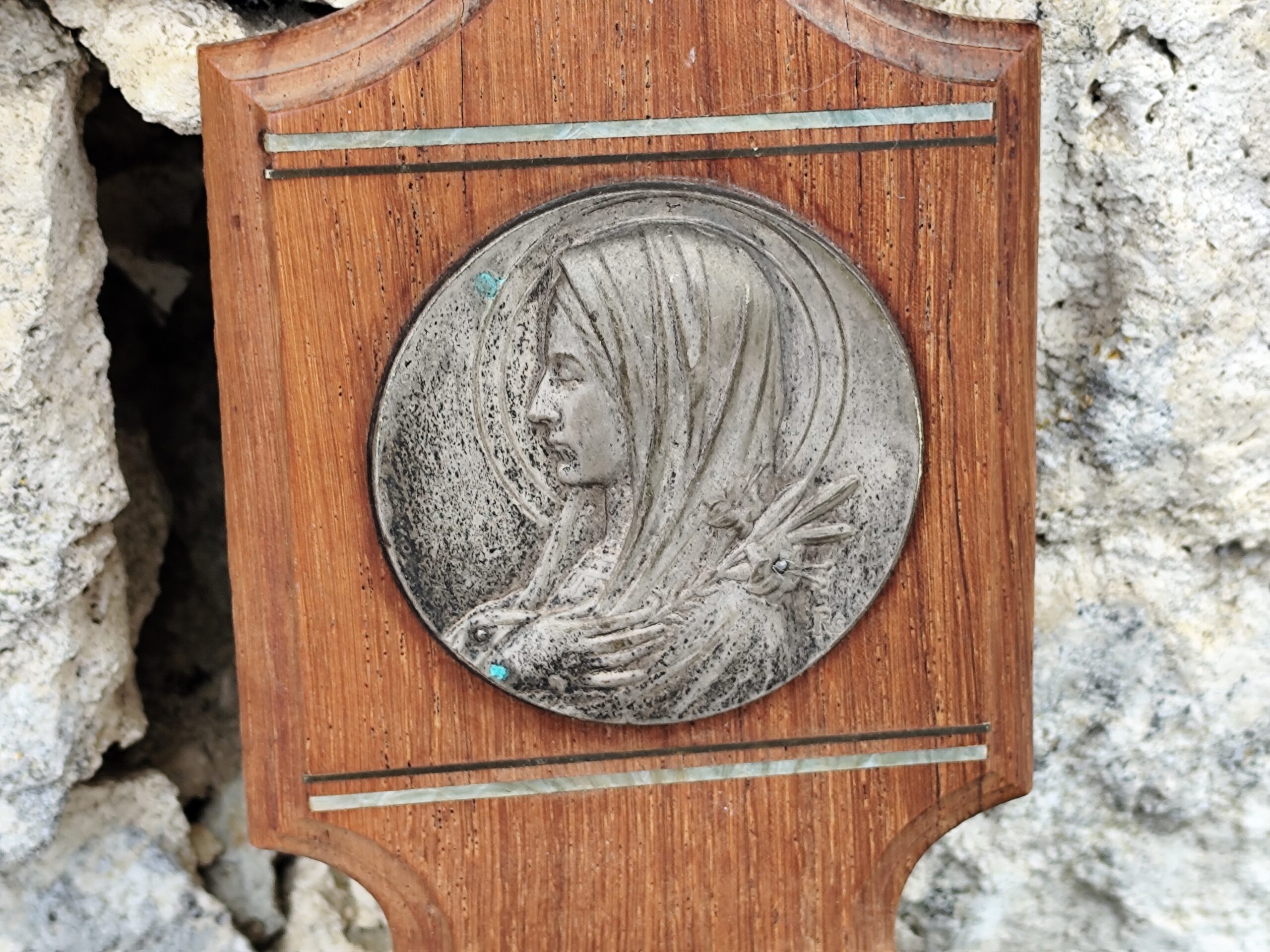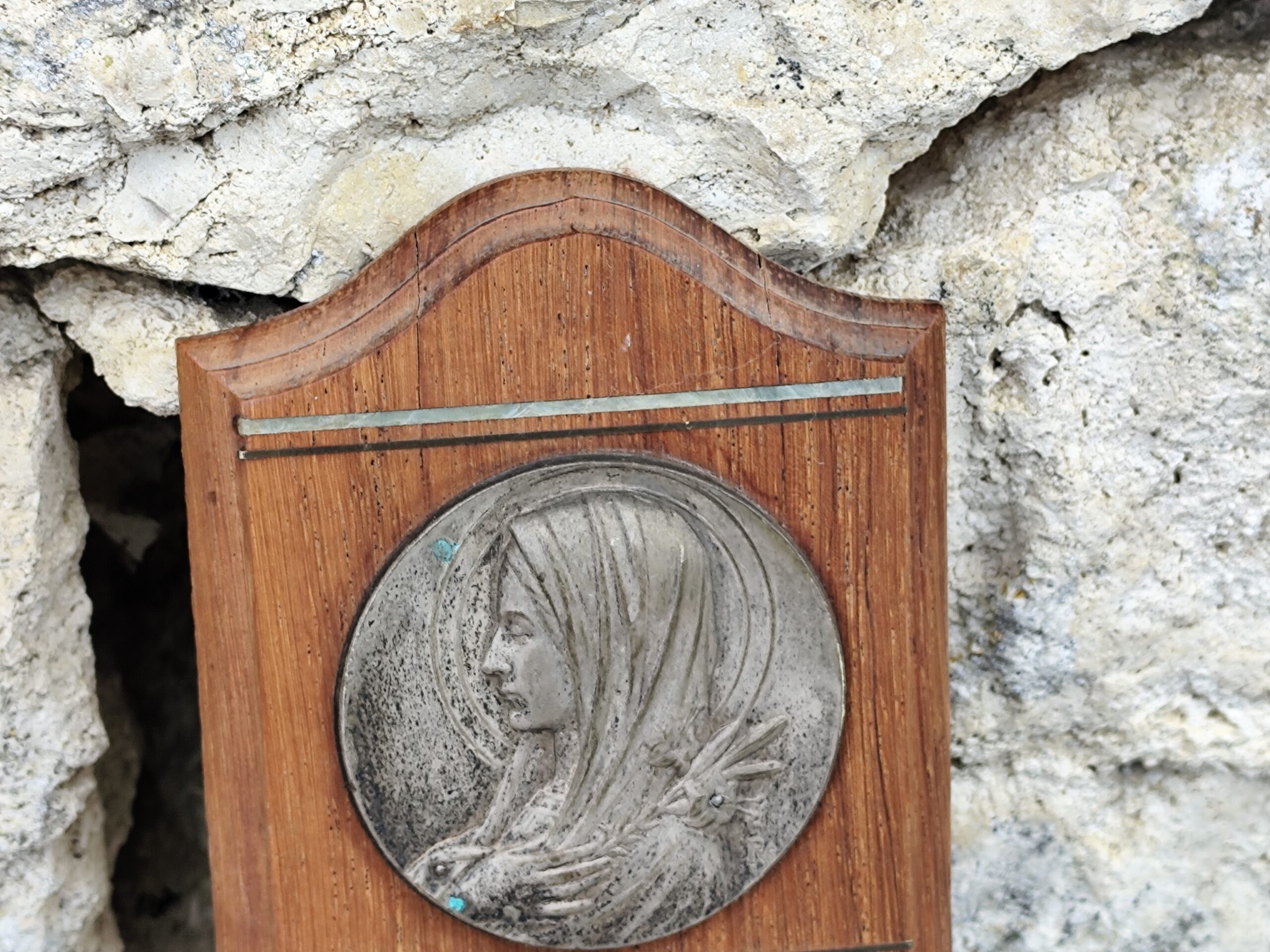 Ce bénitier mural associe la chaleur du bois sculpté à la délicatesse d’un médaillon métallique représentant une figure voilée, douce et recueillie — probablement une Vierge protectrice.
