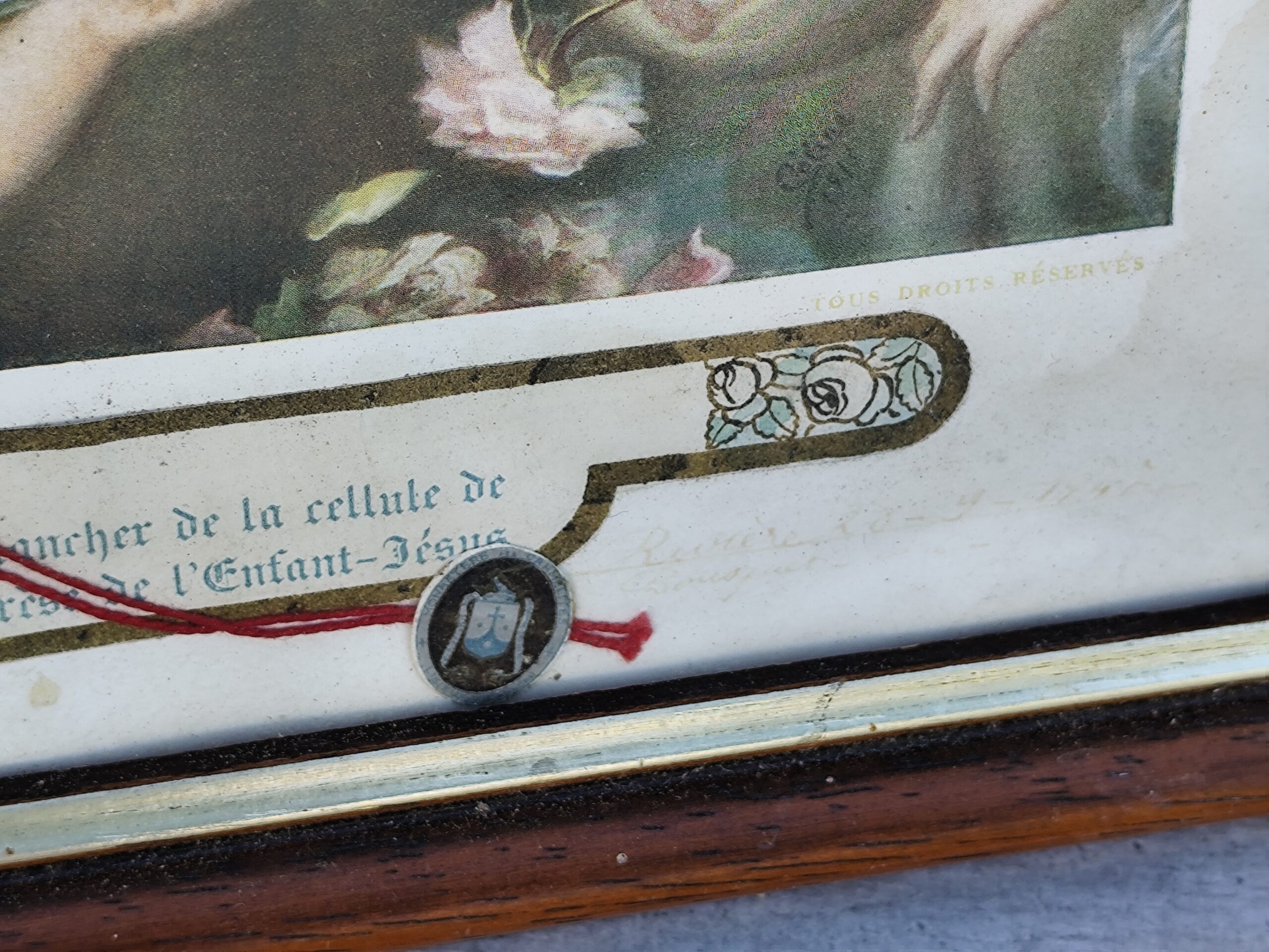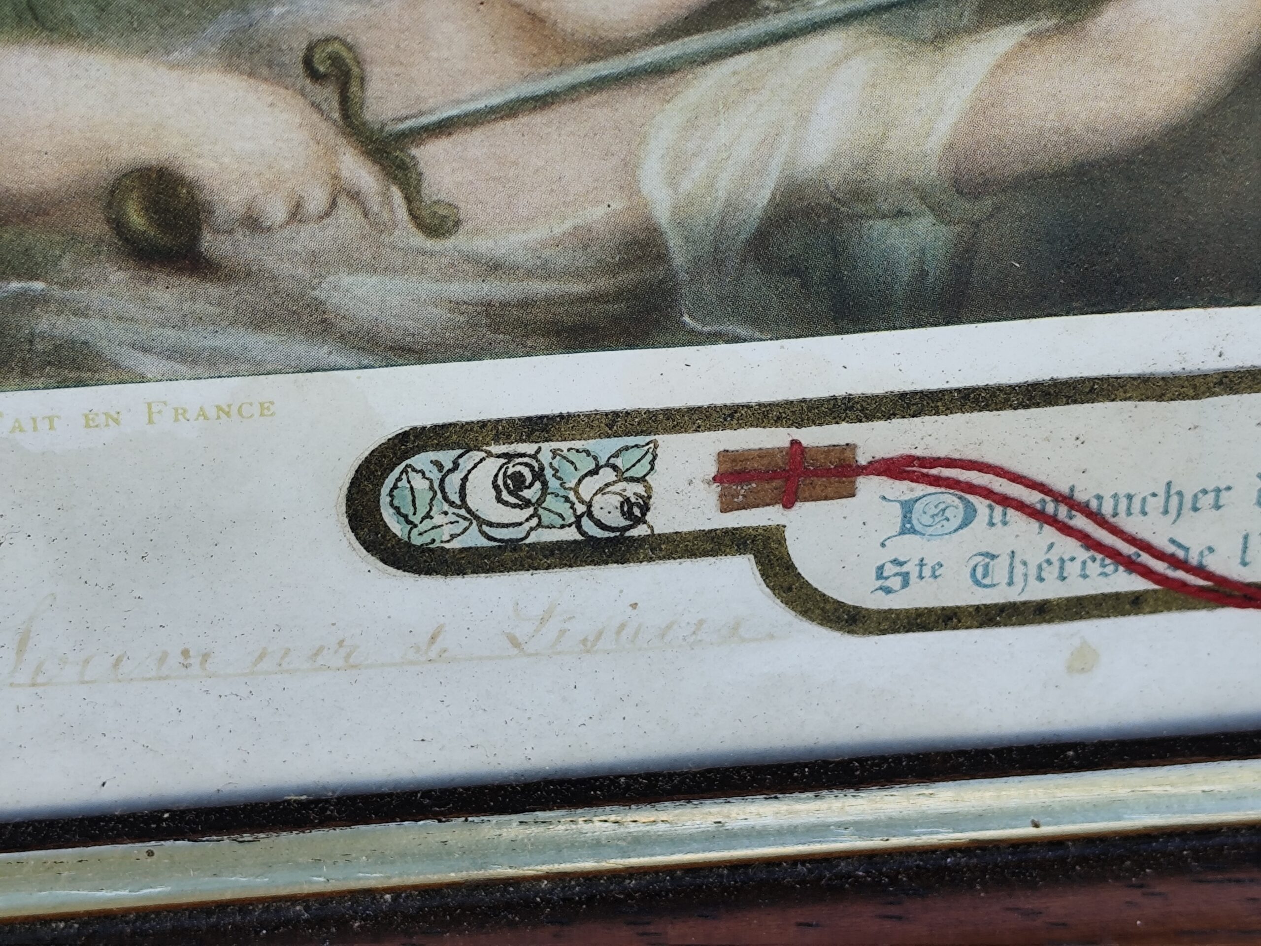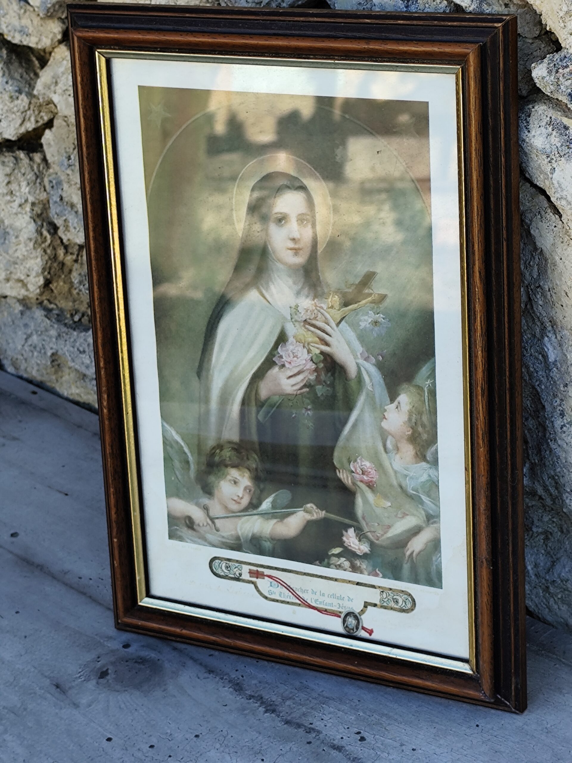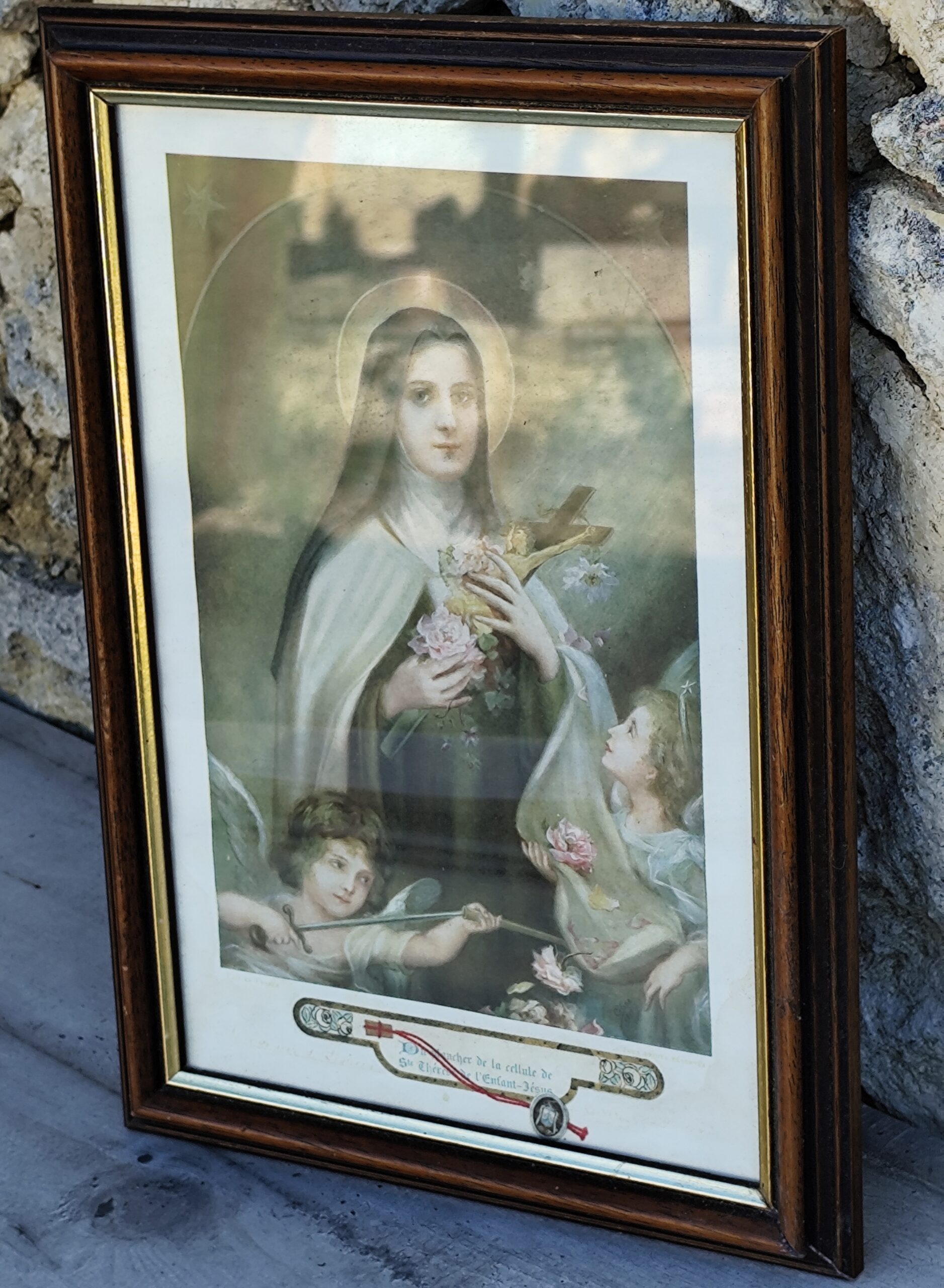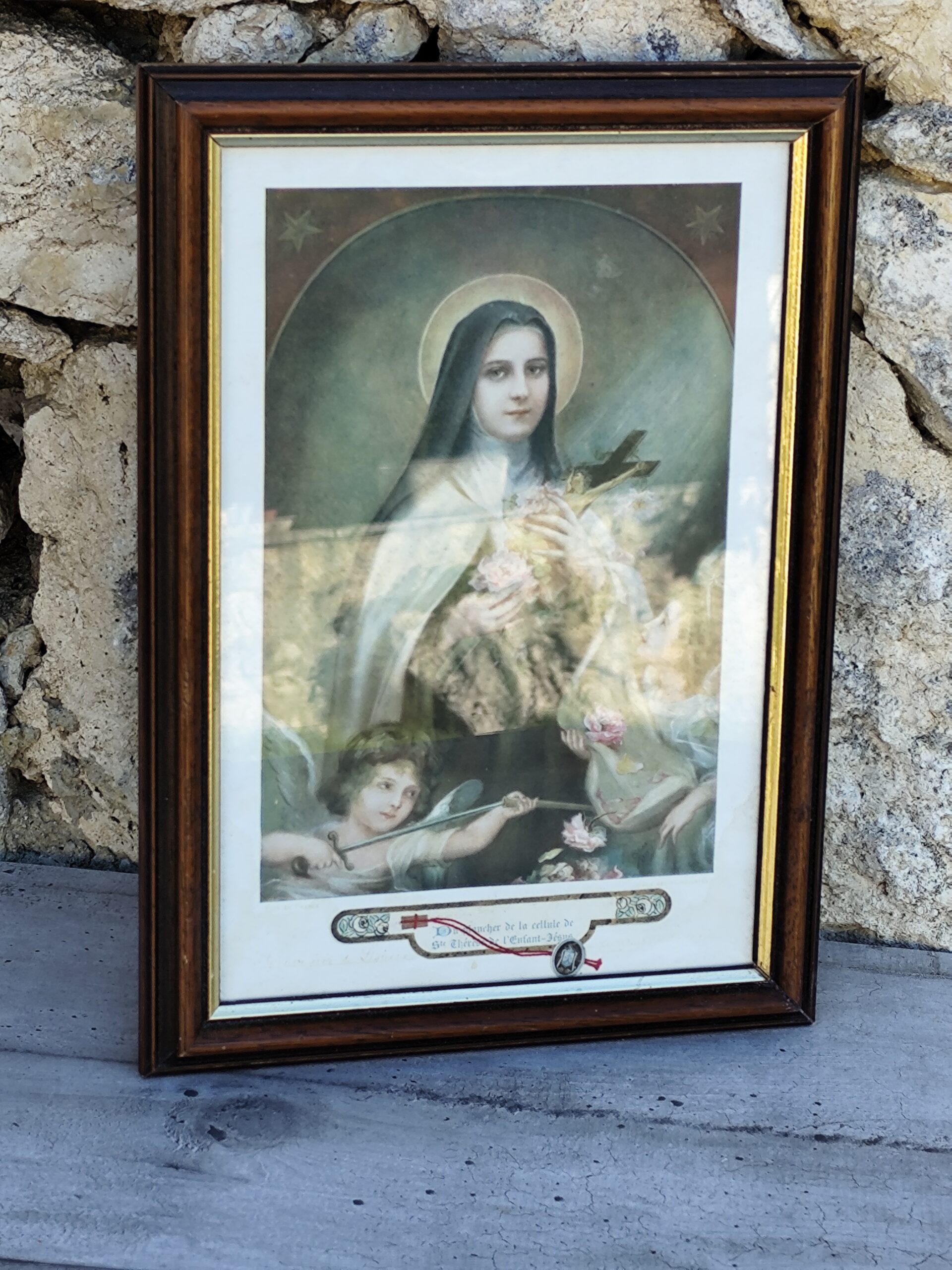 Ce cadre ancien met en lumière une représentation délicate de Sainte Thérèse de Lisieux, tenant la croix et les roses, symboles de son amour infini et de sa « petite voie ».