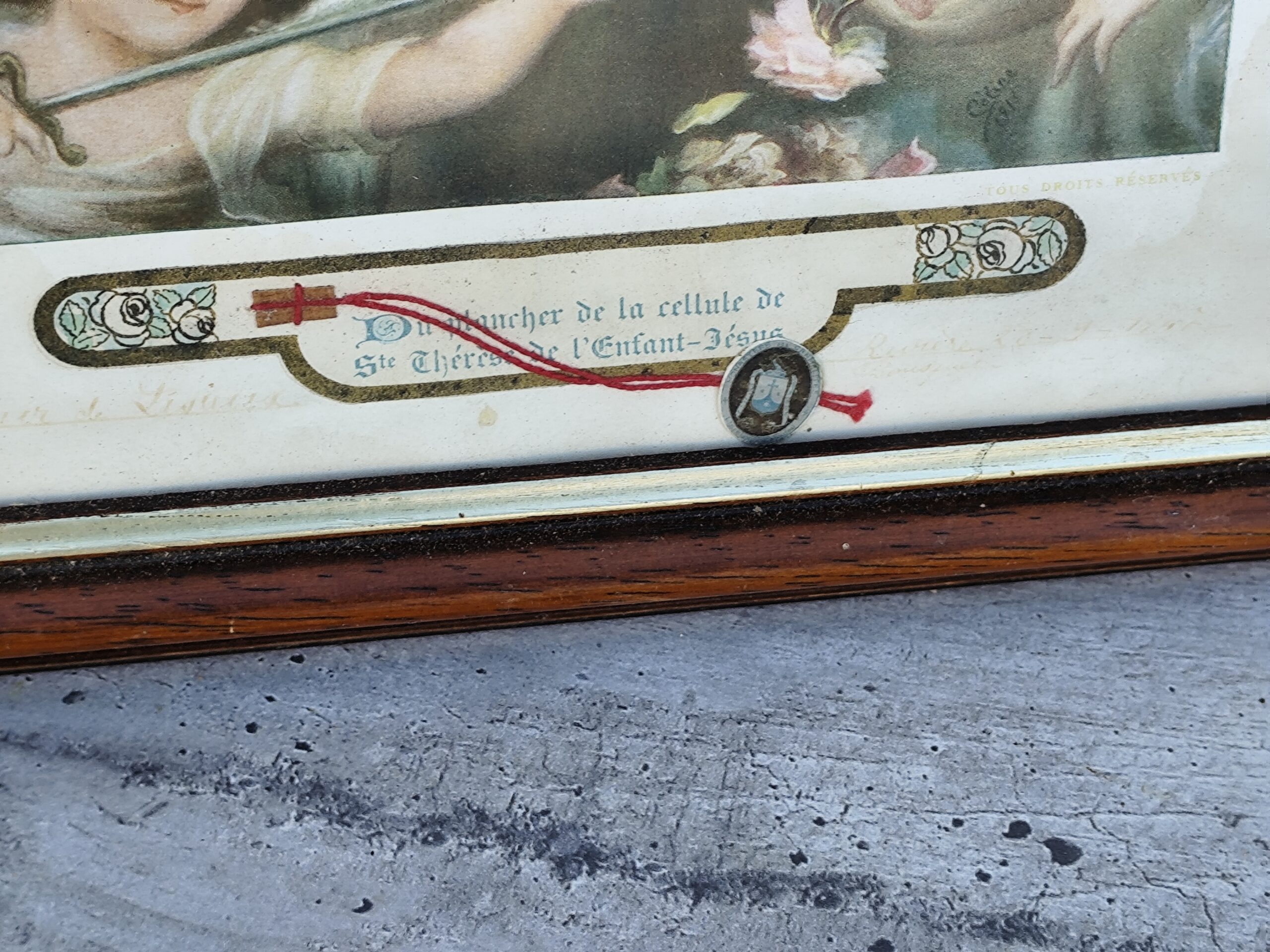Cadre ancien de Sainte Thérèse de Lisieux avec relique – Fragment authentique du plancher de sa cellule.