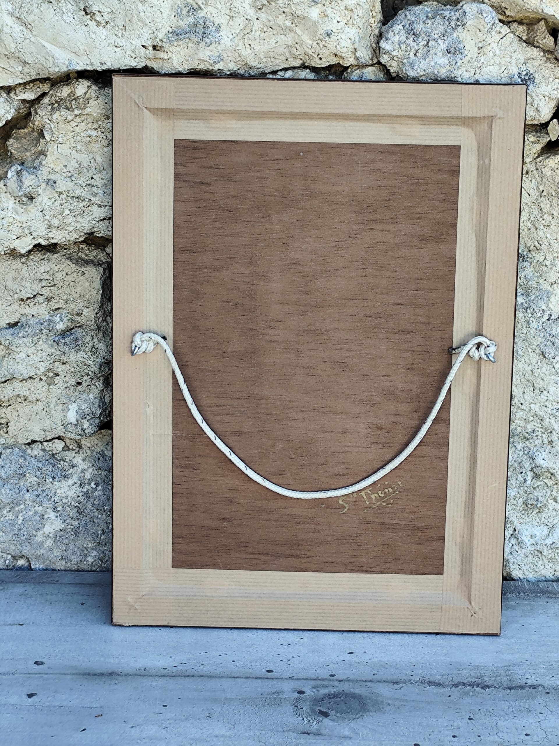 Le cadre en bois, souligné d’un liseré doré, protège l’image sous verre et confère à l’ensemble une présence douce et lumineuse.