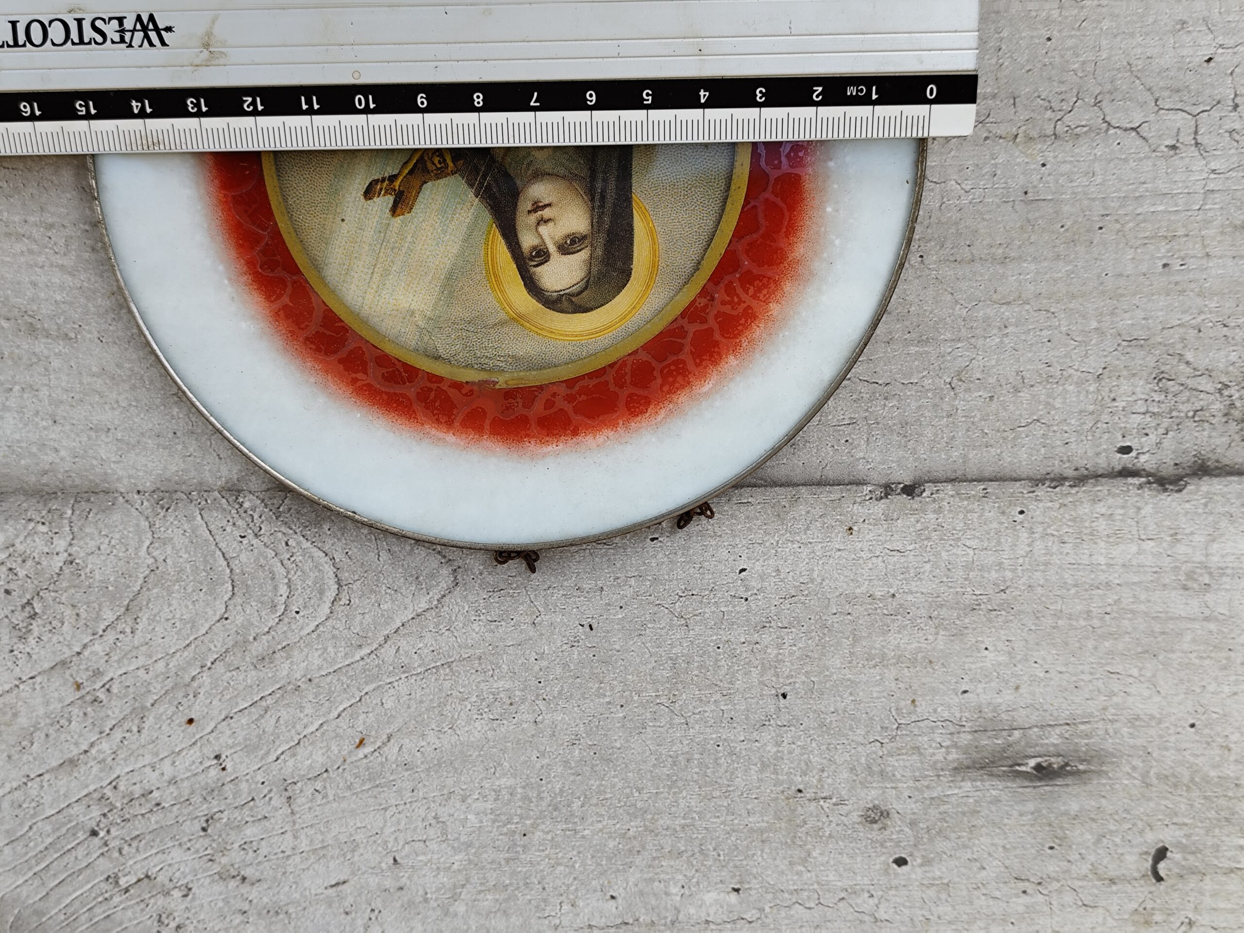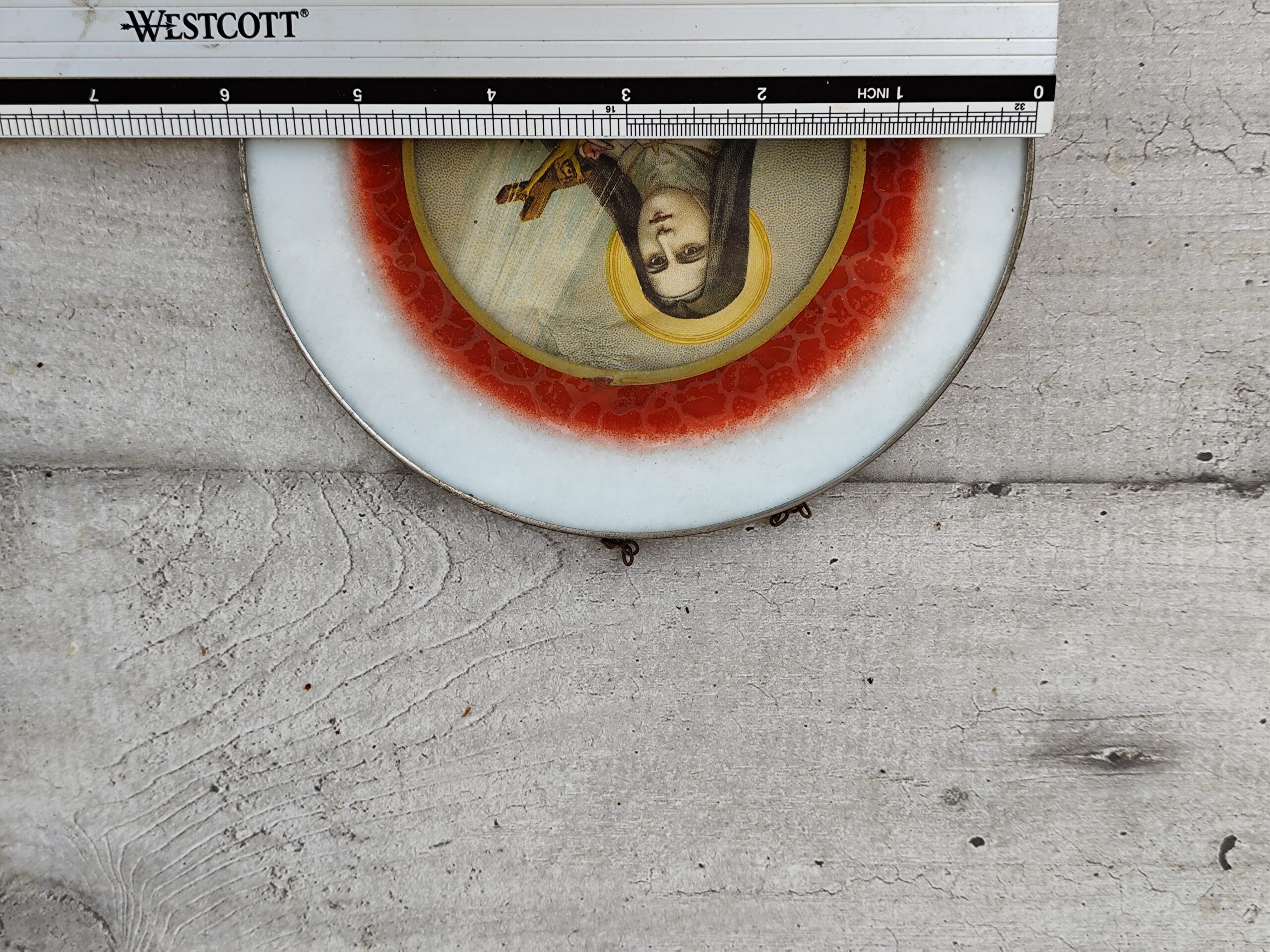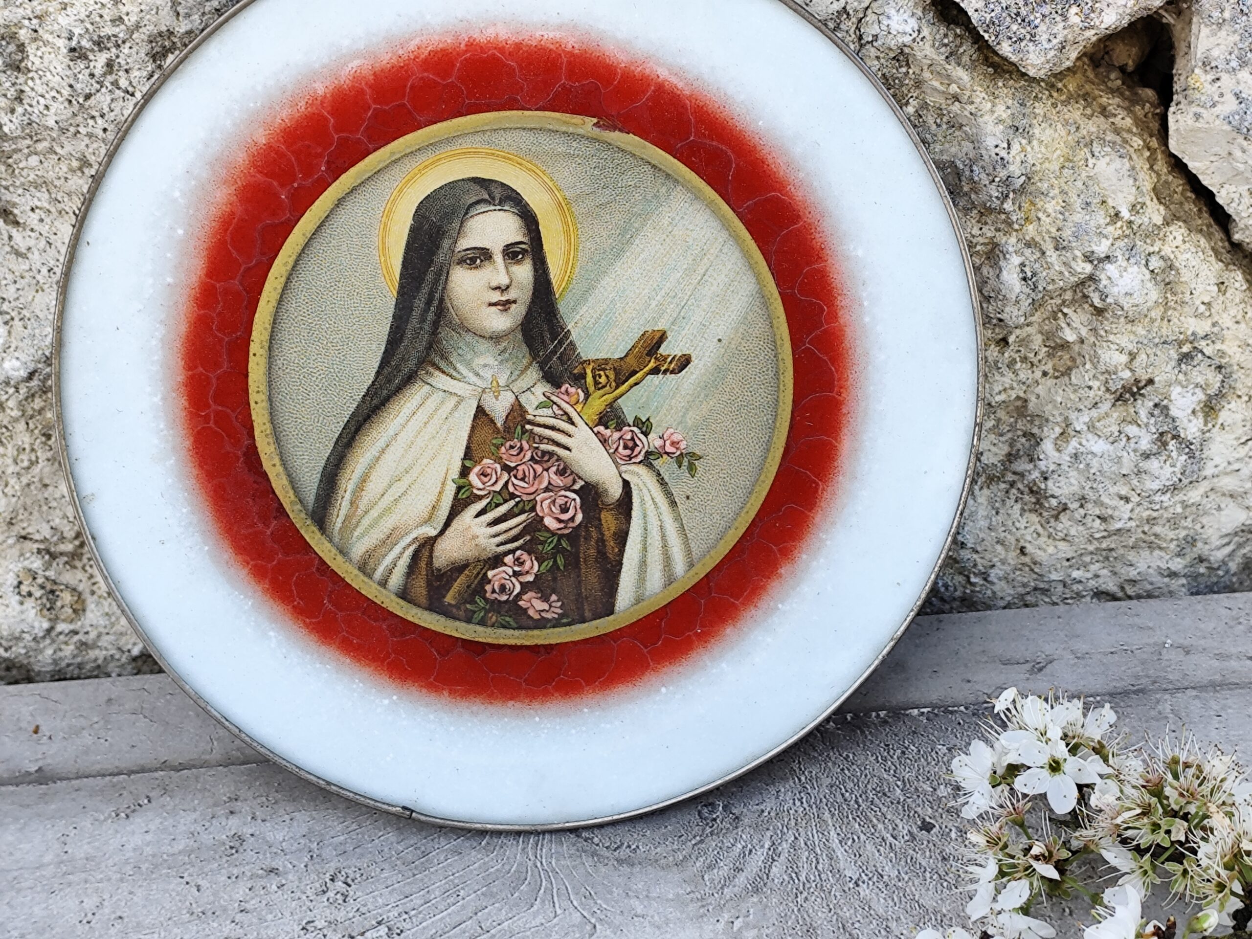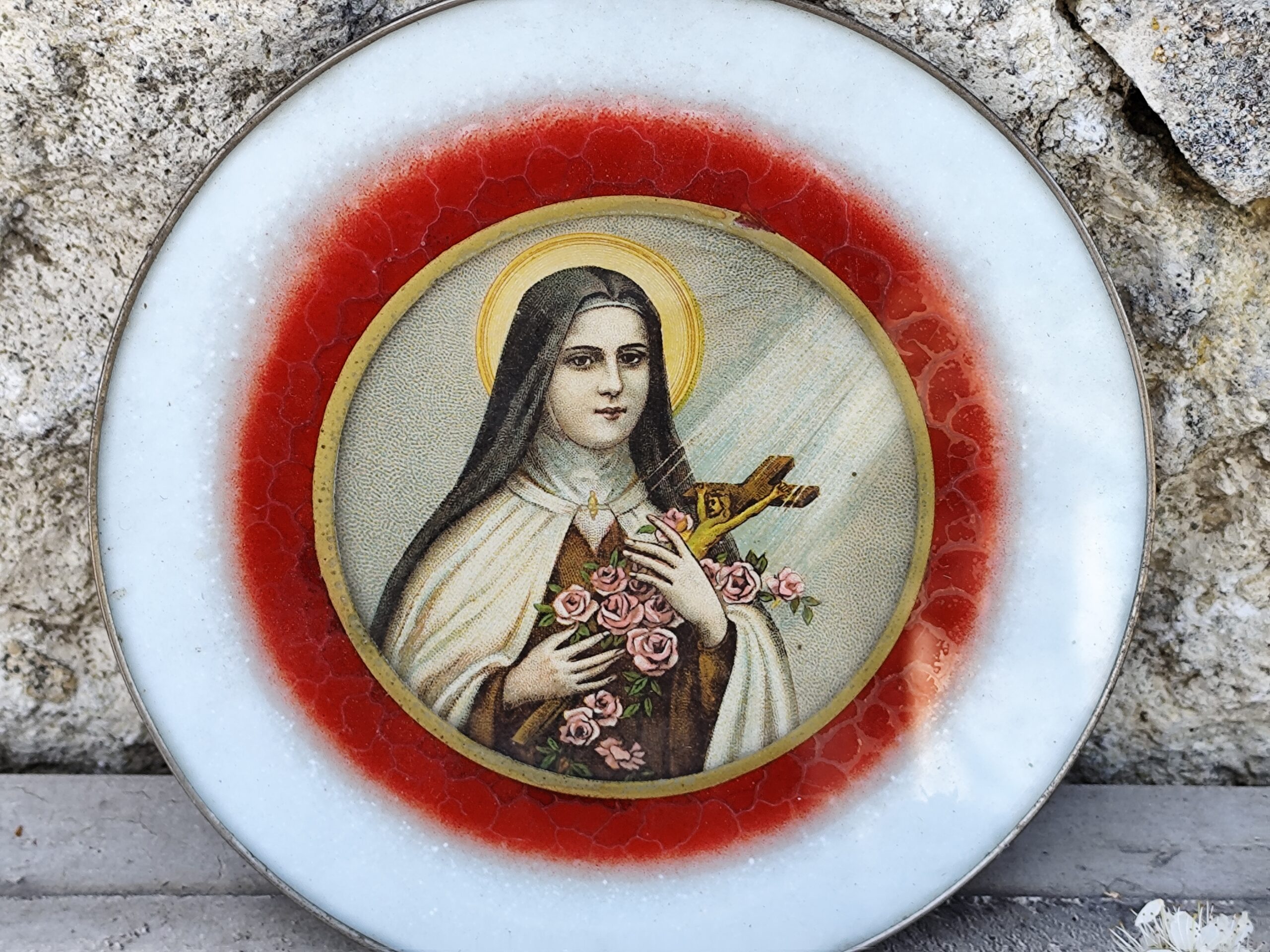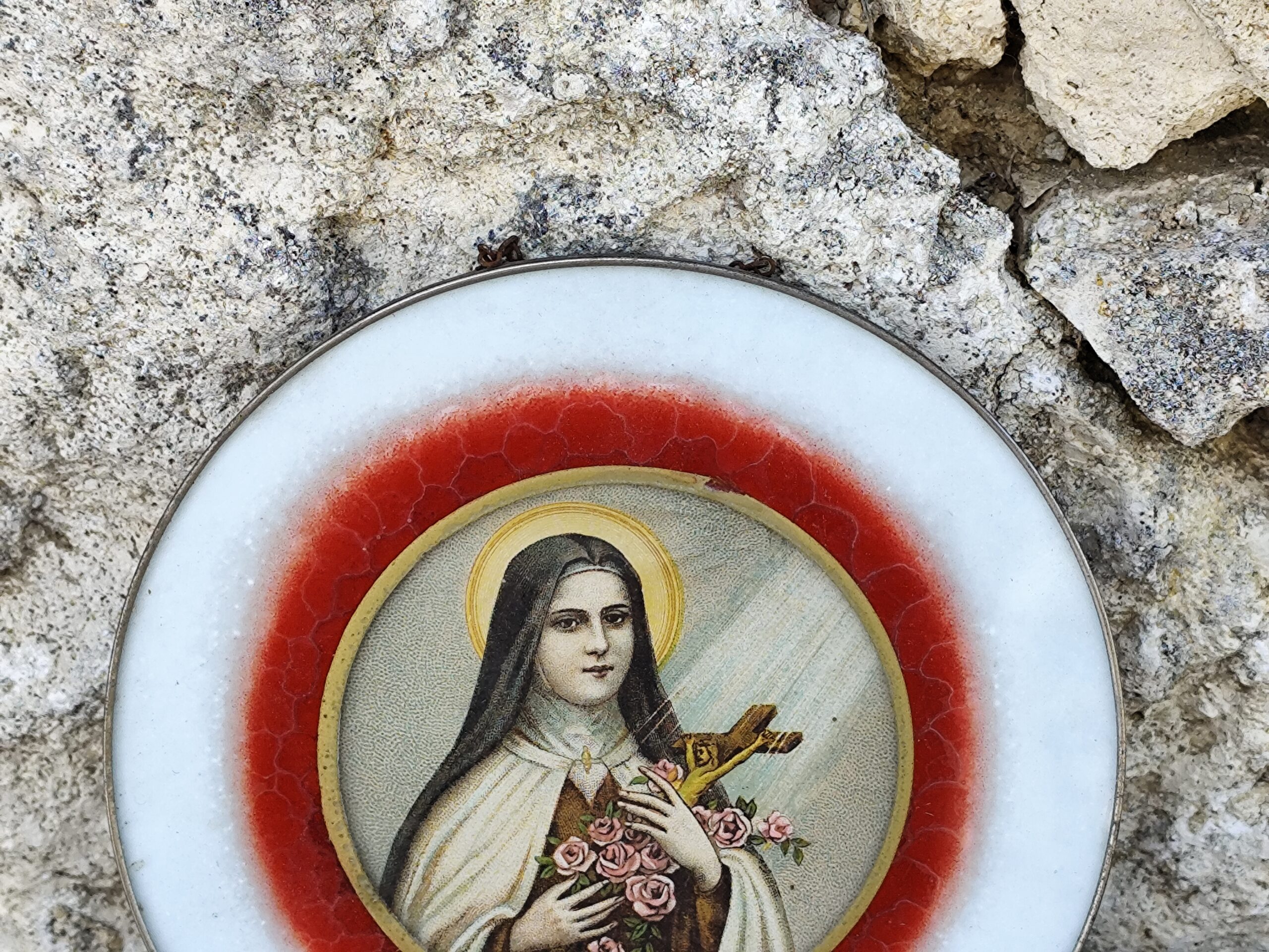La plaque en céramique, entourée d’un anneau rouge à l’effet craquelé, offre un contraste vibrant avec la pureté du visage auréolé. Sainte Thérèse y apparaît tenant une croix enlacée de roses, symbole de confiance, d’abandon et de grâces offertes.