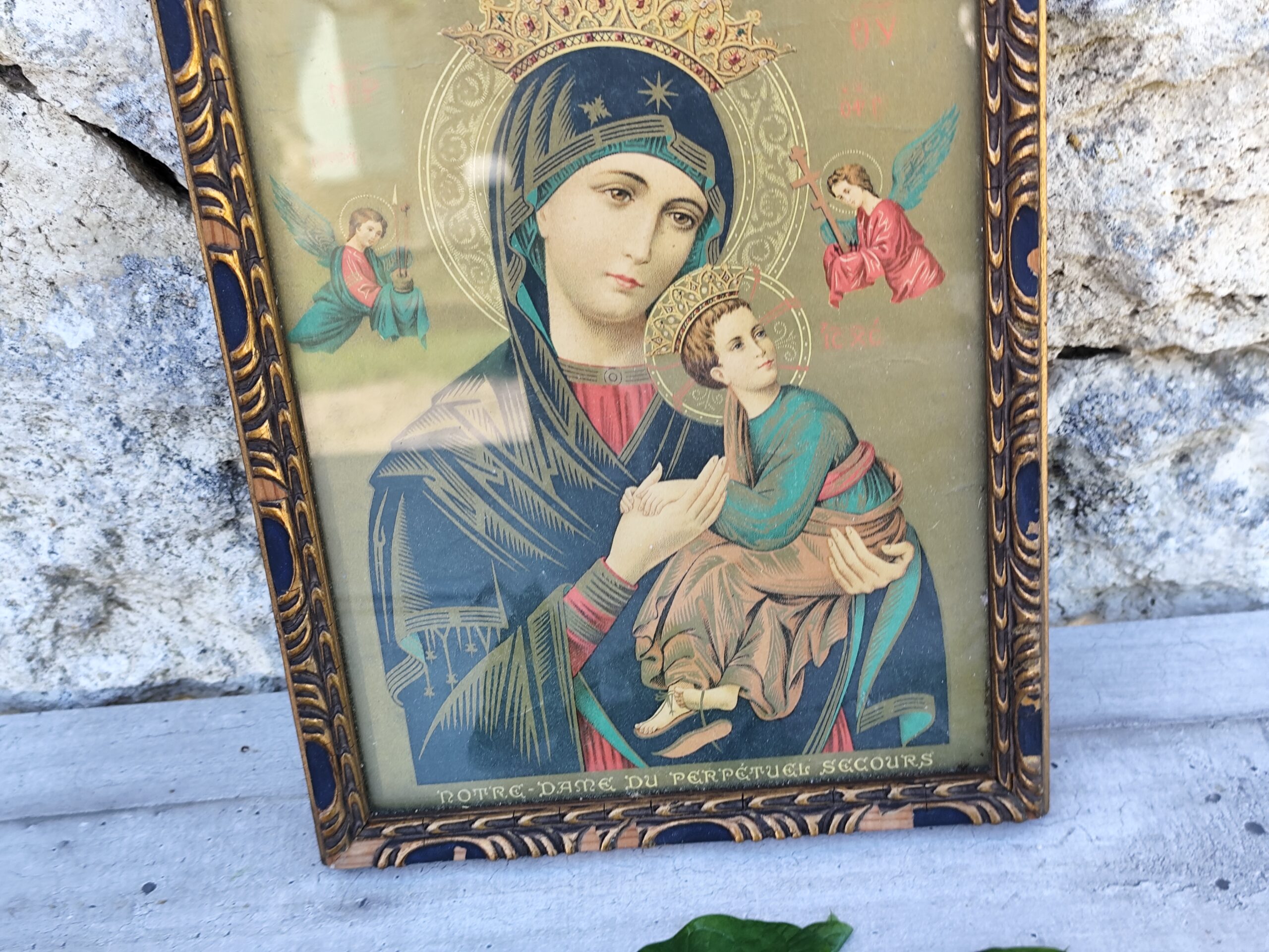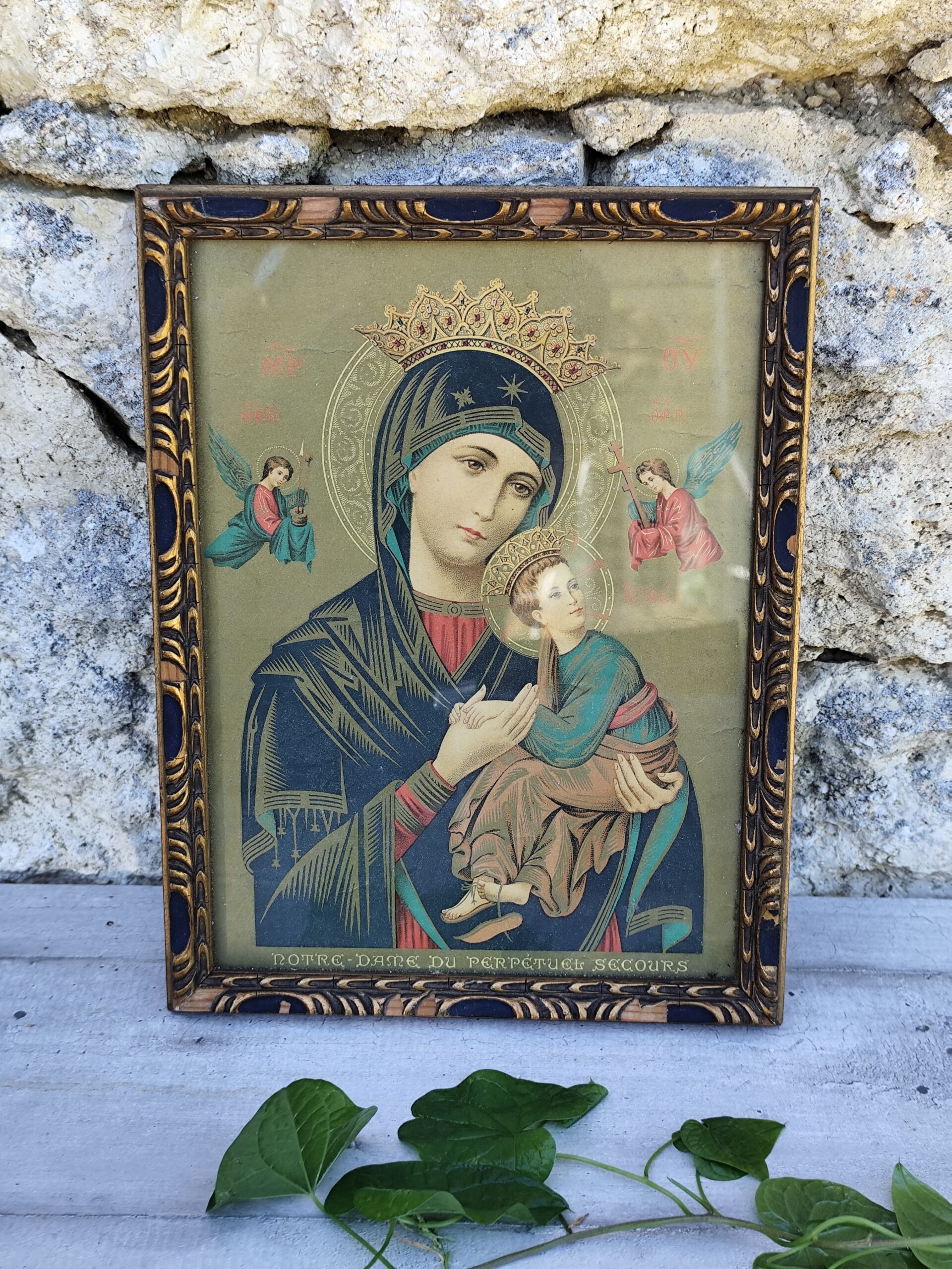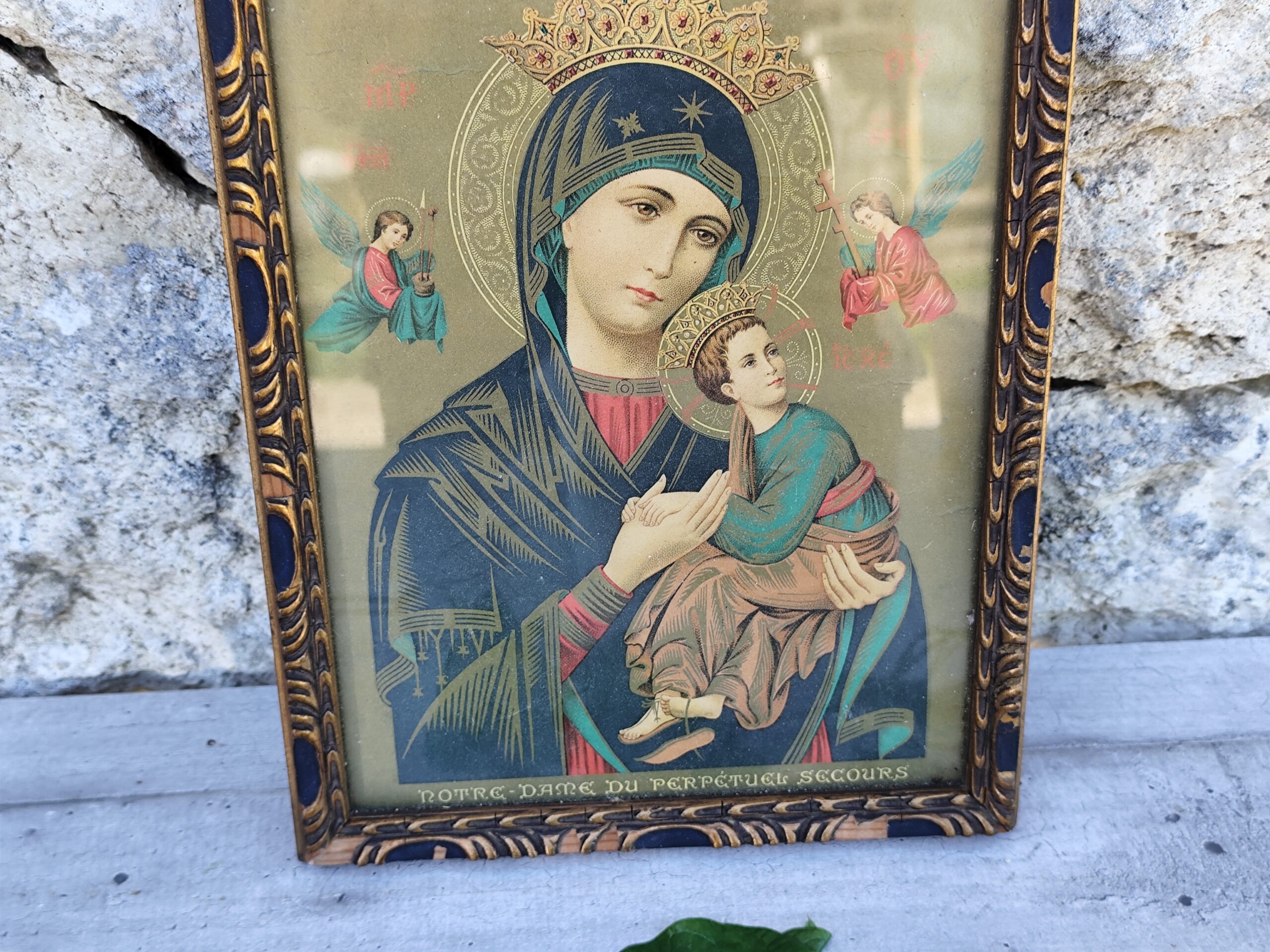Icône ancienne Notre‑Dame du Perpétuel Secours – cadre or & bleu – dédicace 1925.