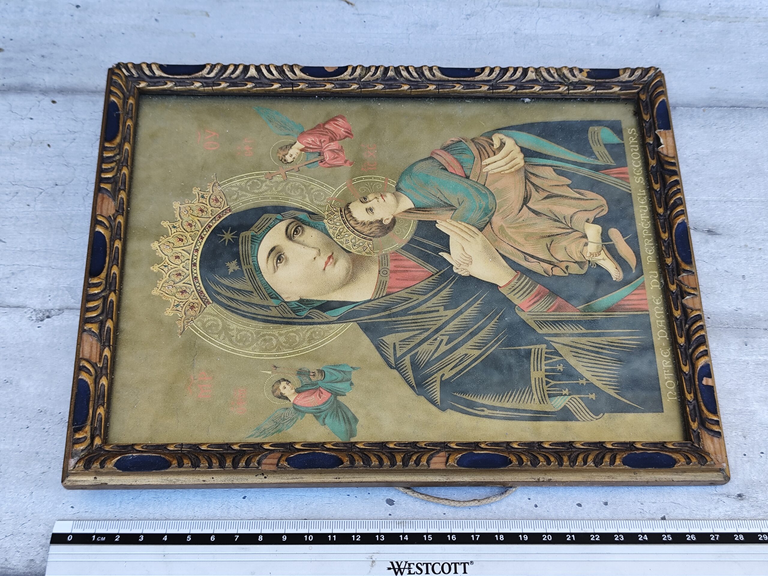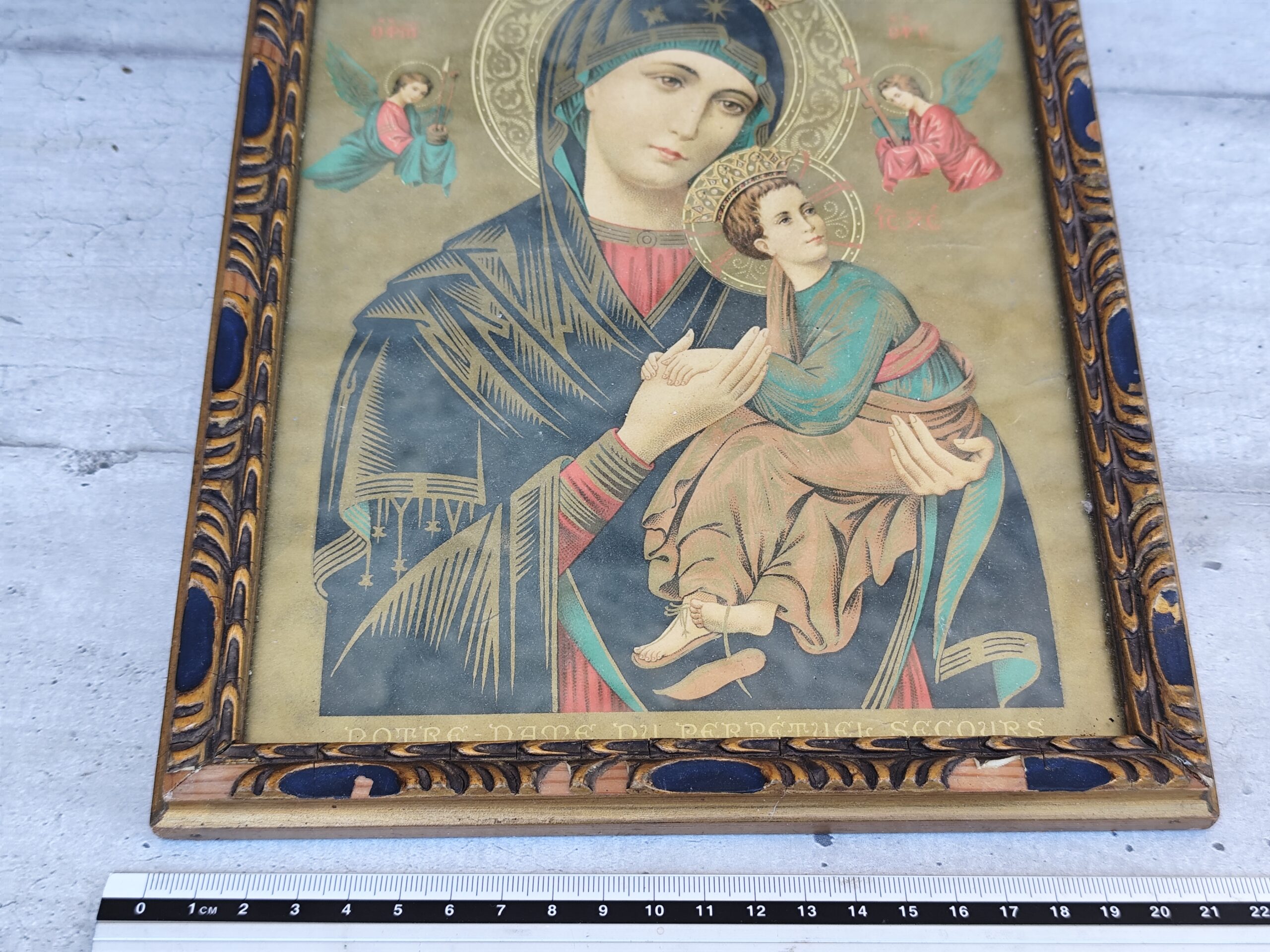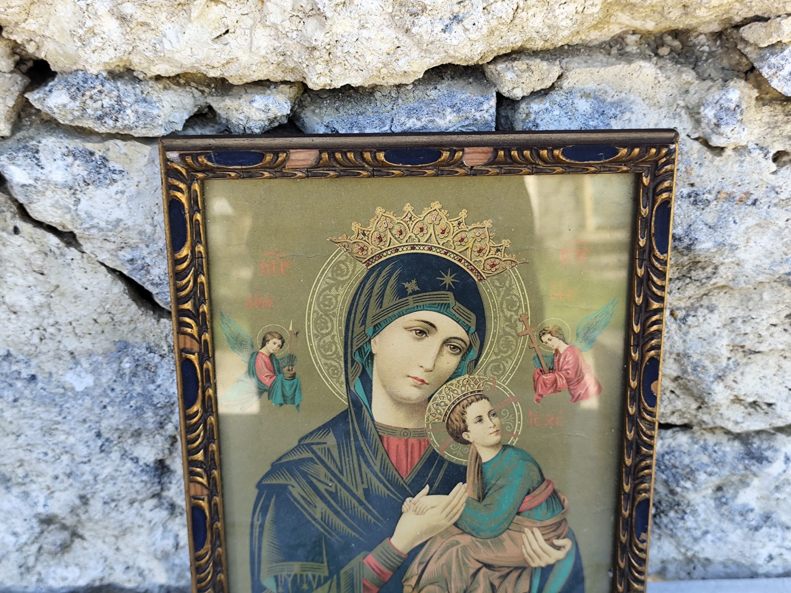 Icône ancienne Notre‑Dame du Perpétuel Secours – cadre or & bleu – dédicace 1925.