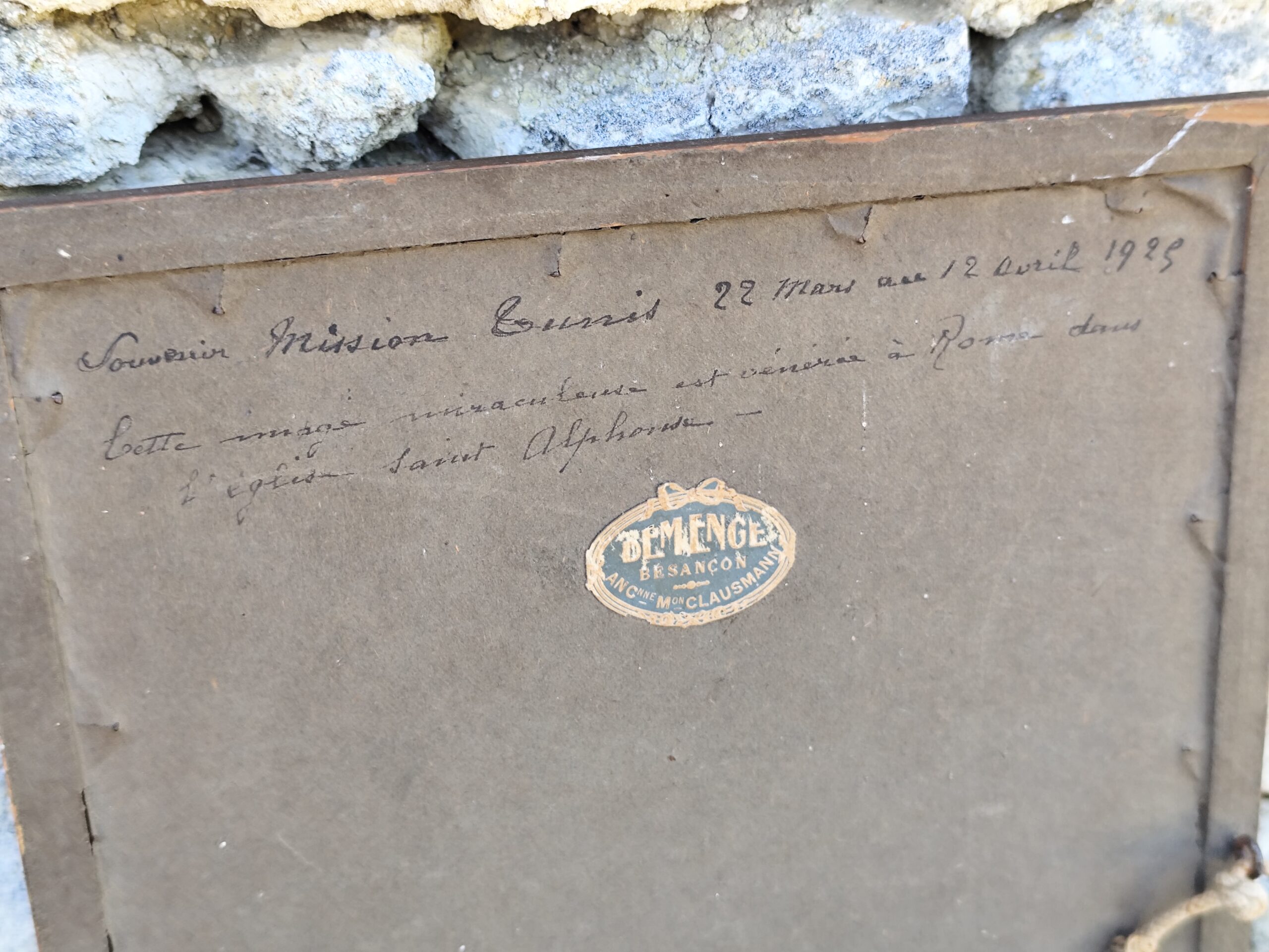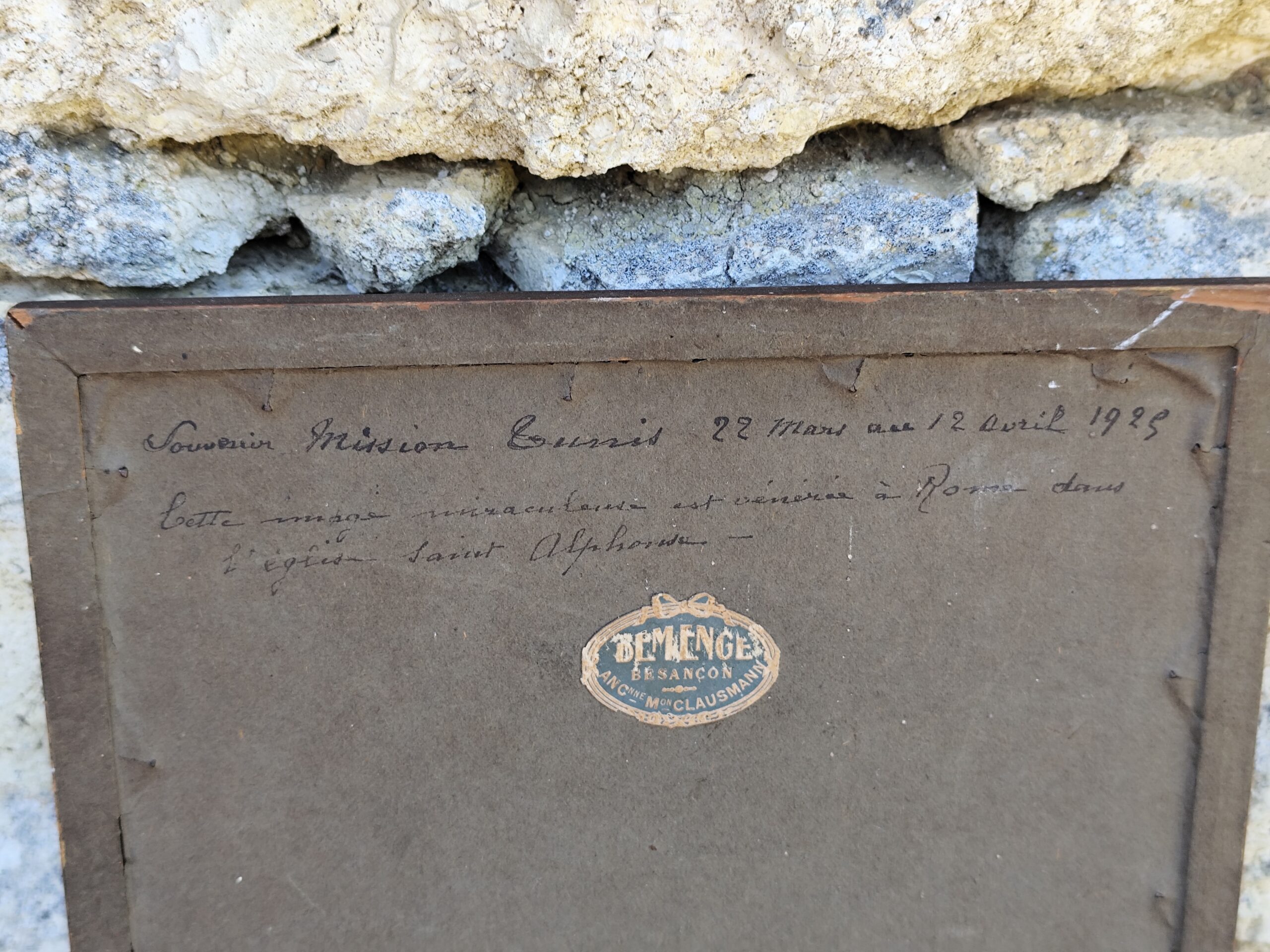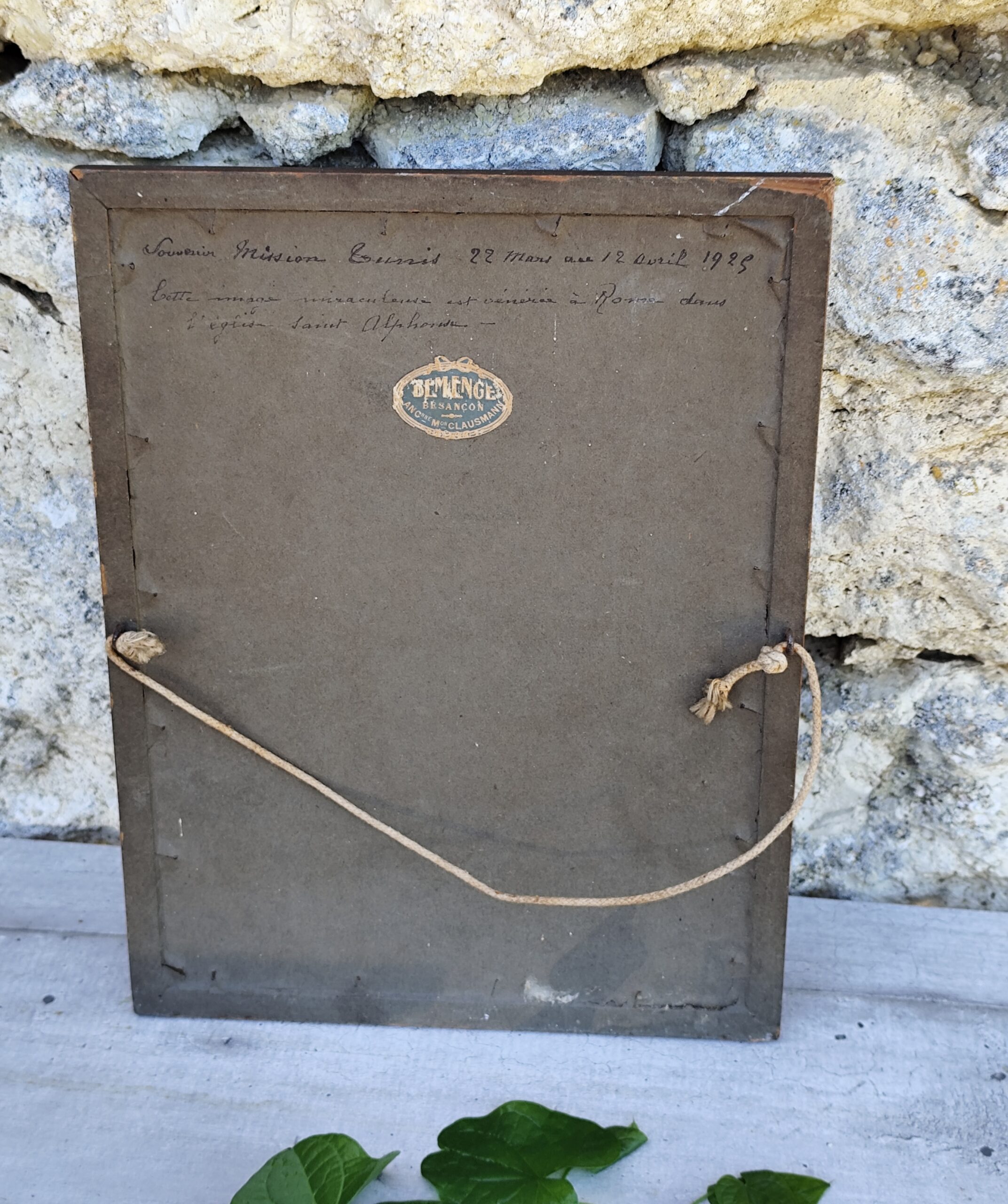 Au verso, une dédicace manuscrite datée du 22 mars au 12 avril 1925, mentionnant une mission religieuse à Rome dans l’église Saint‑Alphonse, apporte une dimension historique et spirituelle rare.