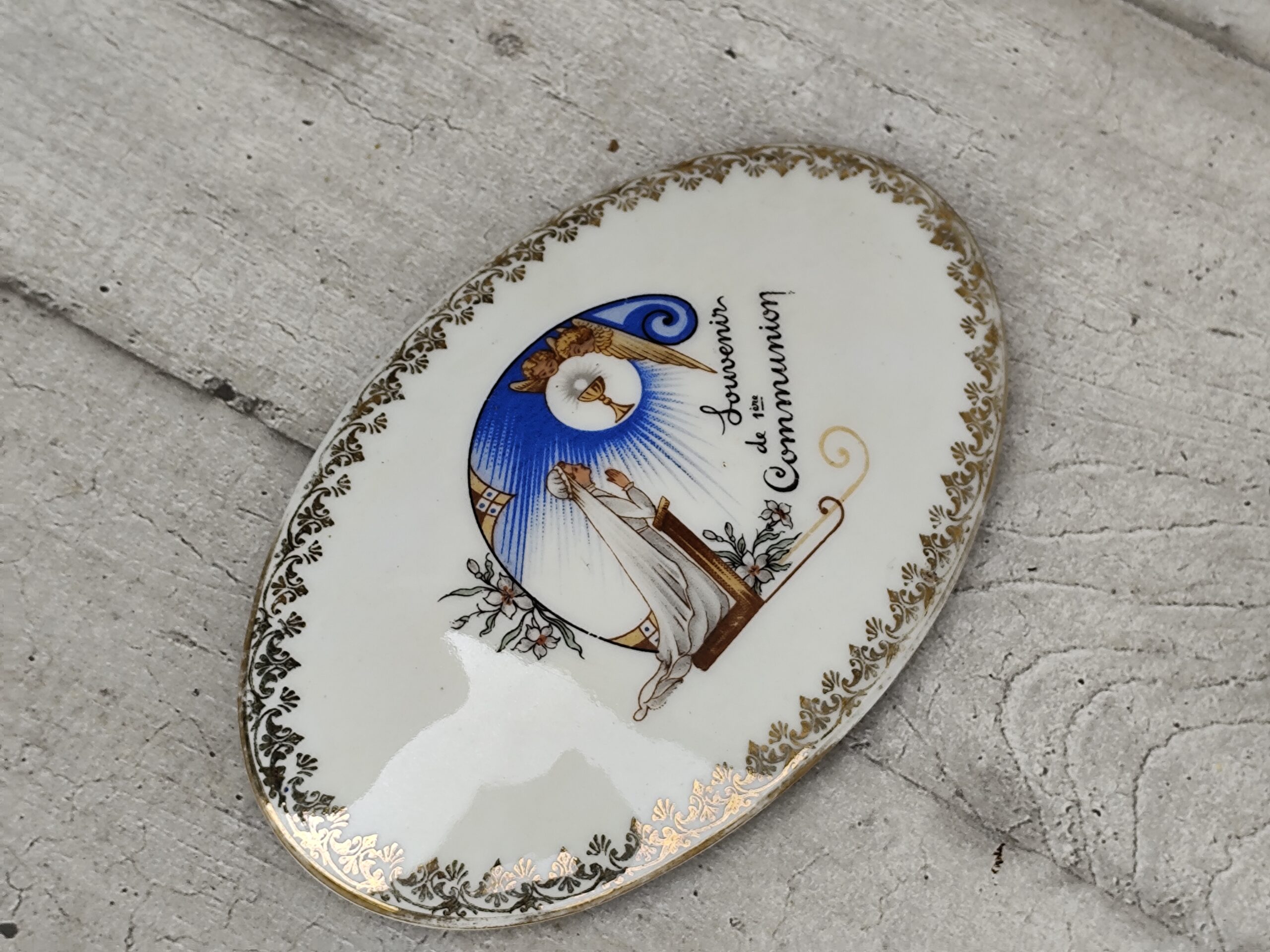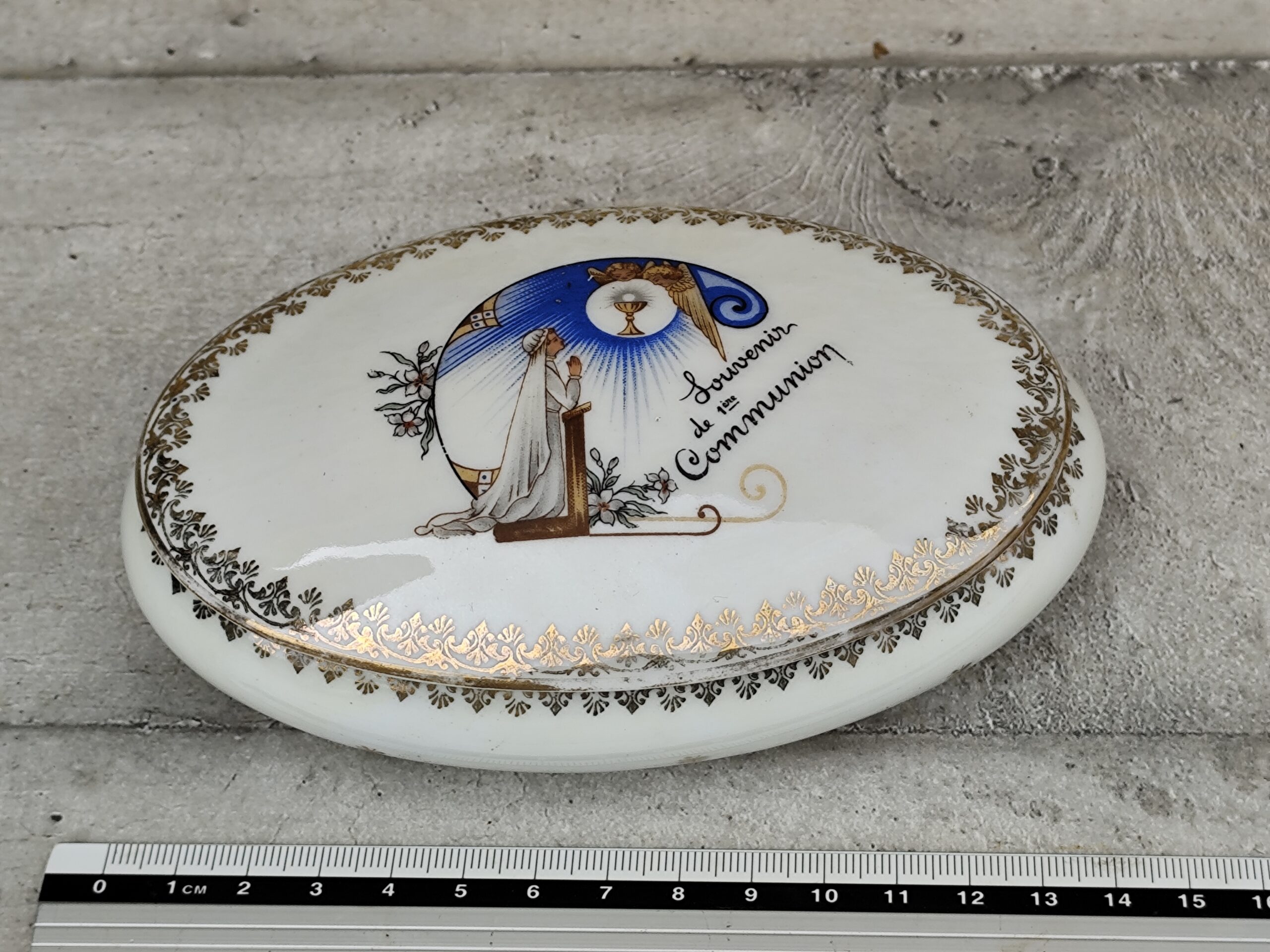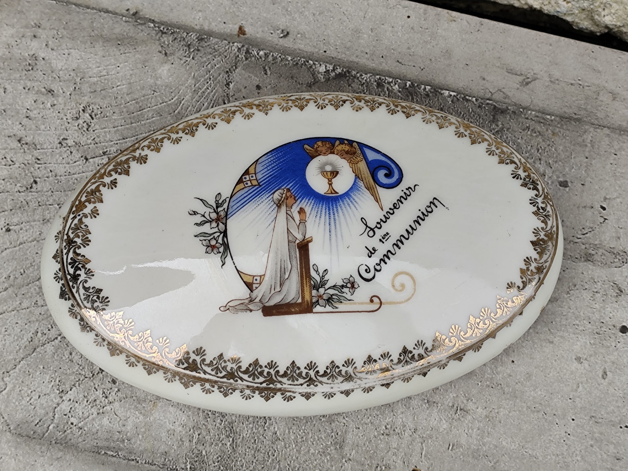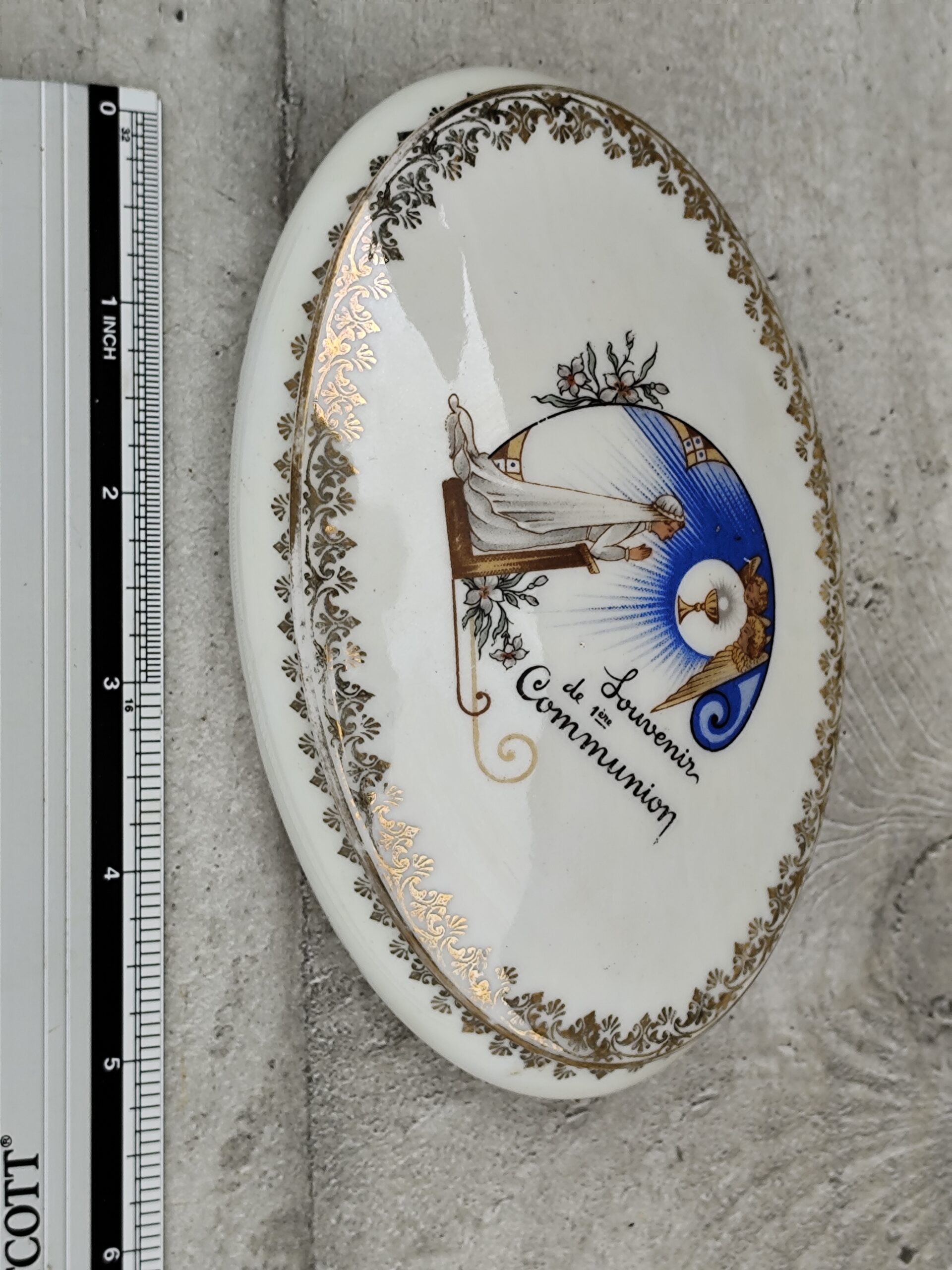Cette ancienne boîte de communion en porcelaine de Limoges est un délicat souvenir religieux, décoré d’une scène sacrée et d’un liseré doré raffiné.