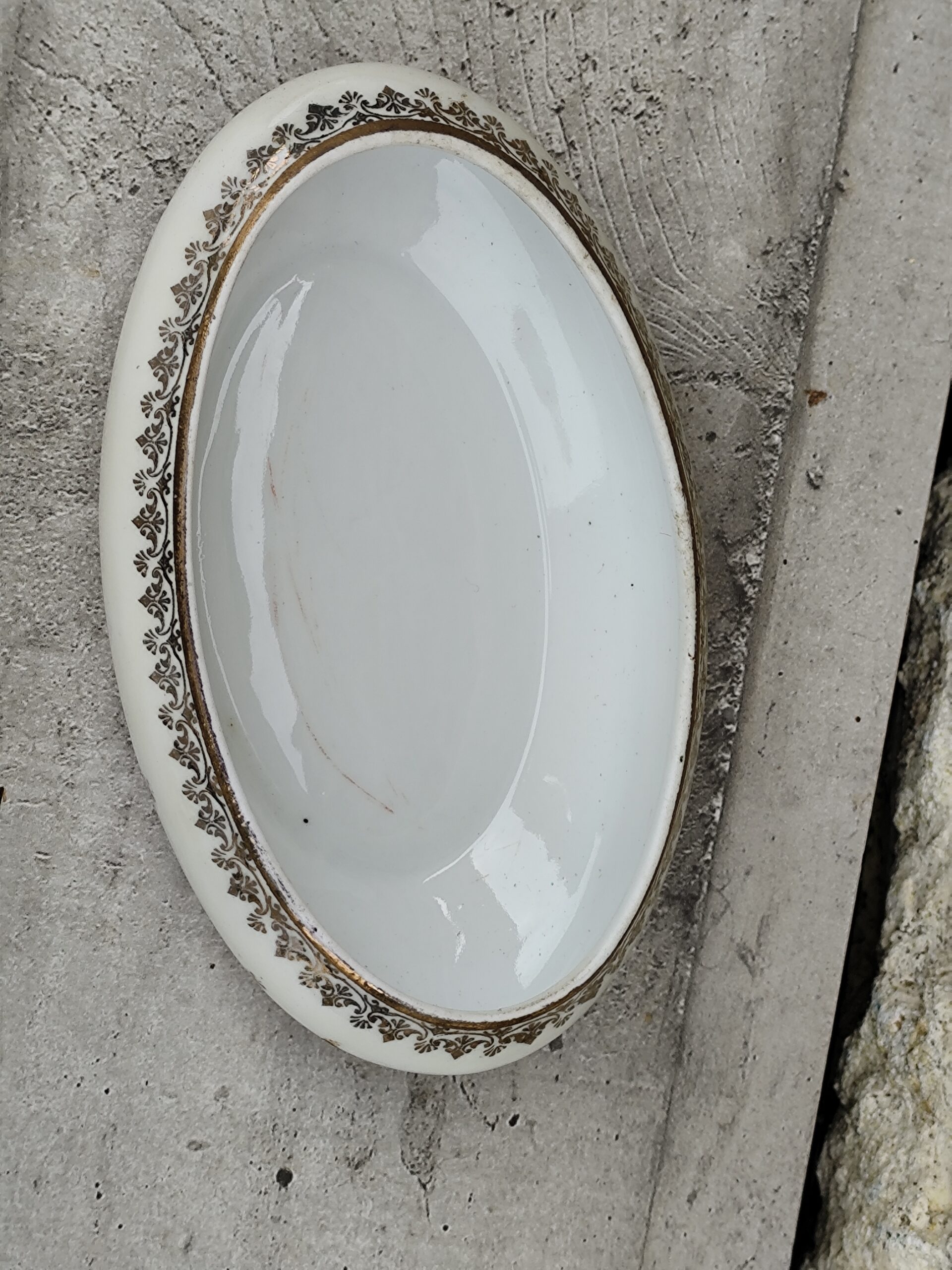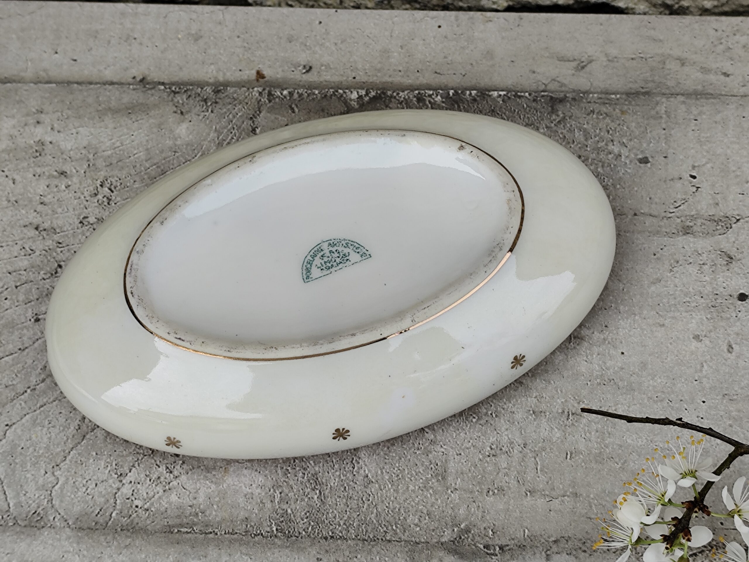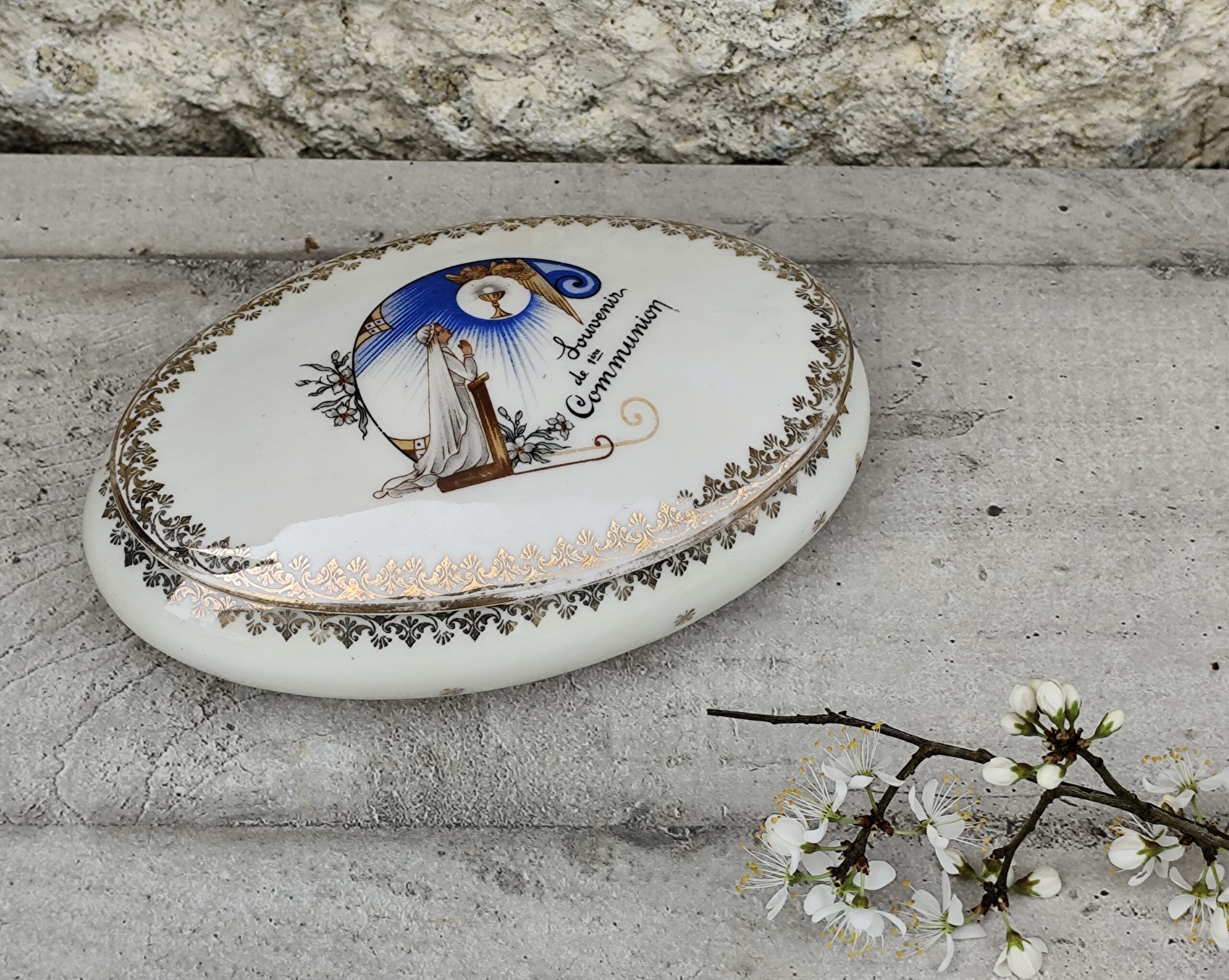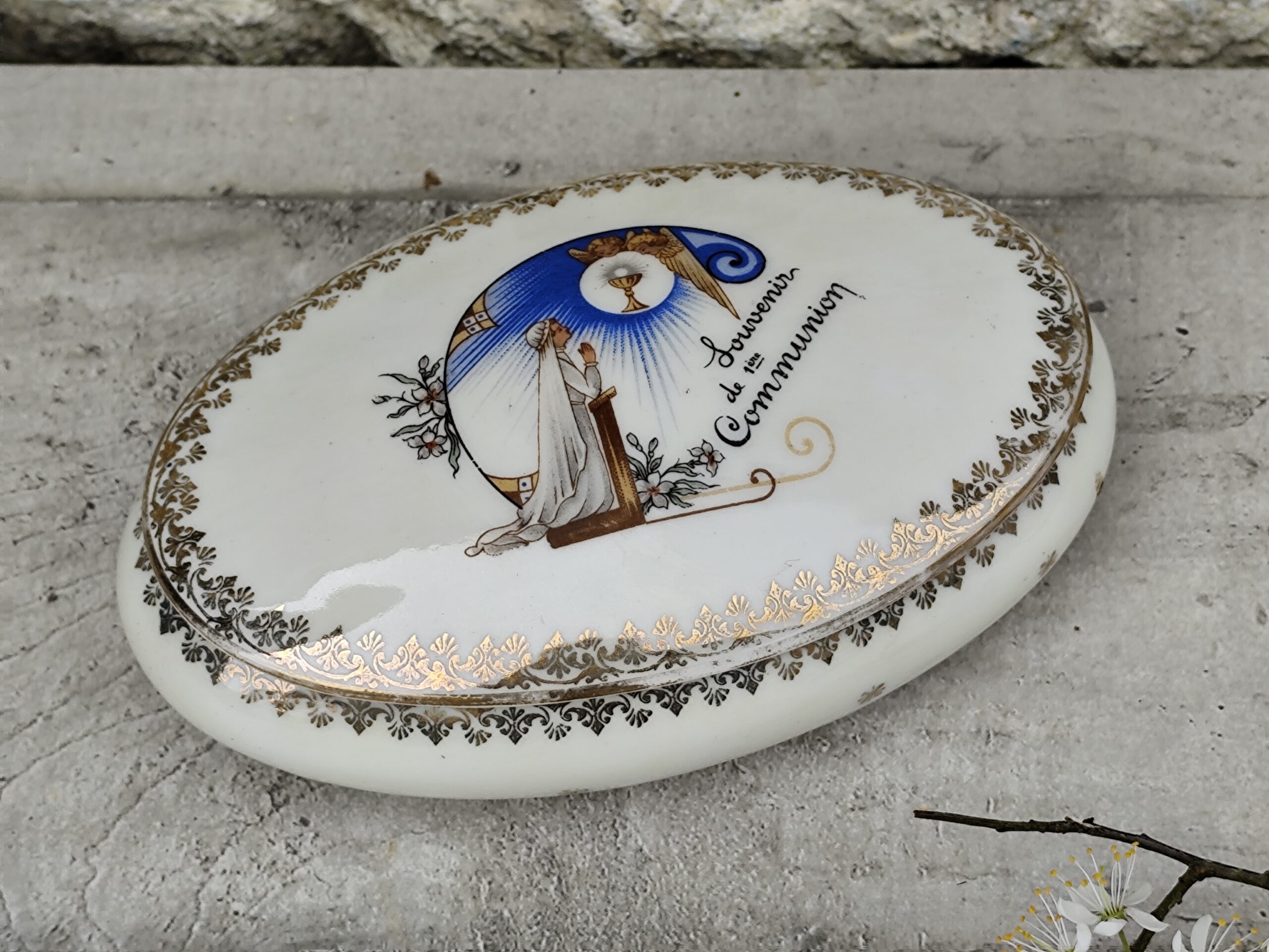 Cette ancienne boîte de communion en porcelaine de Limoges est un délicat souvenir religieux, décoré d’une scène sacrée et d’un liseré doré raffiné.