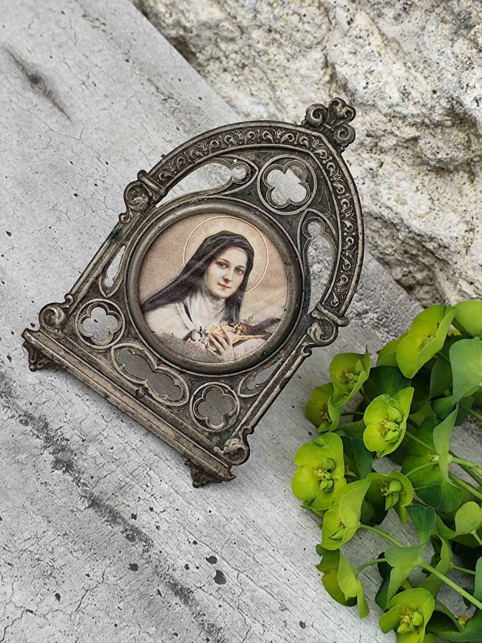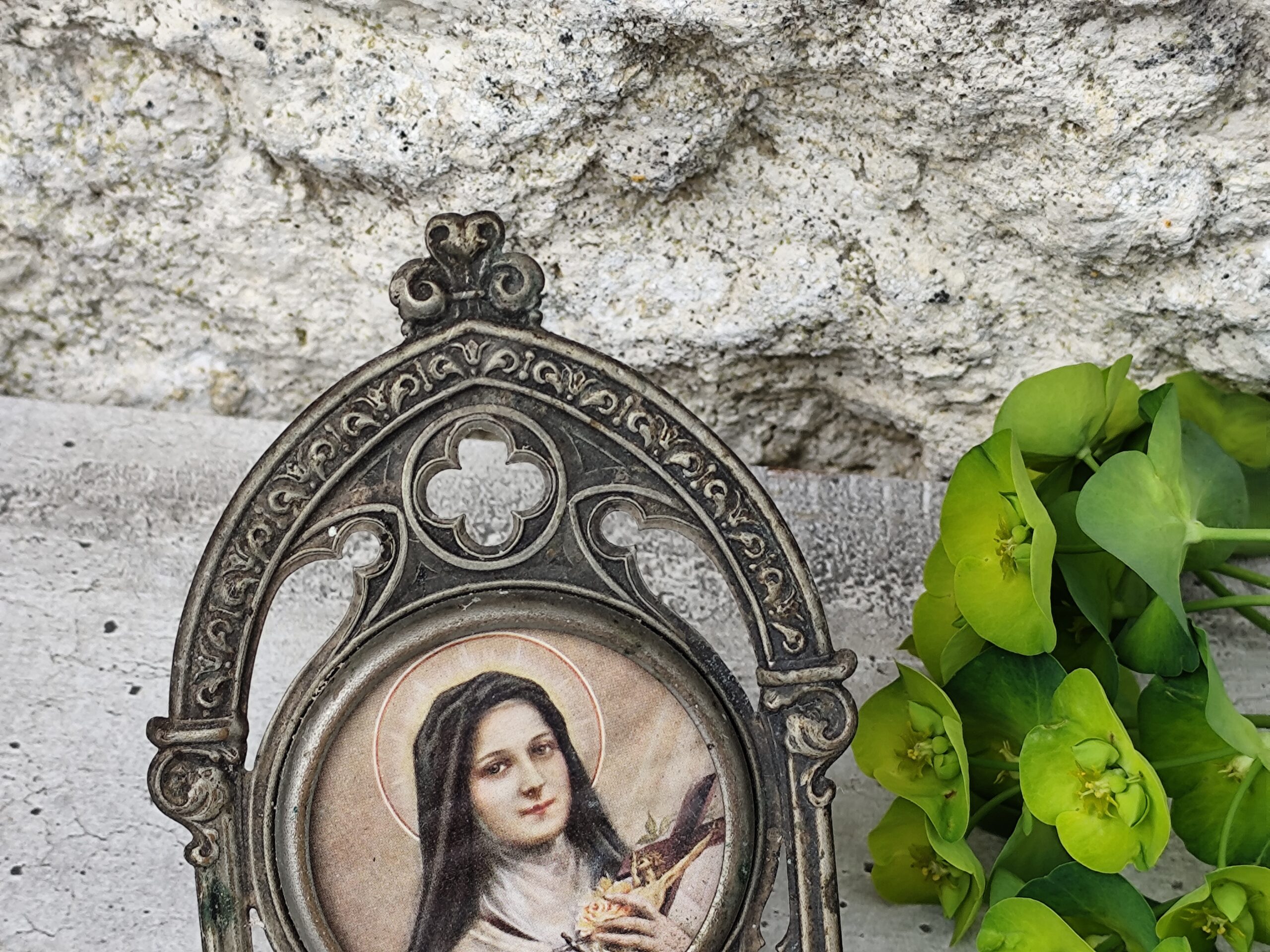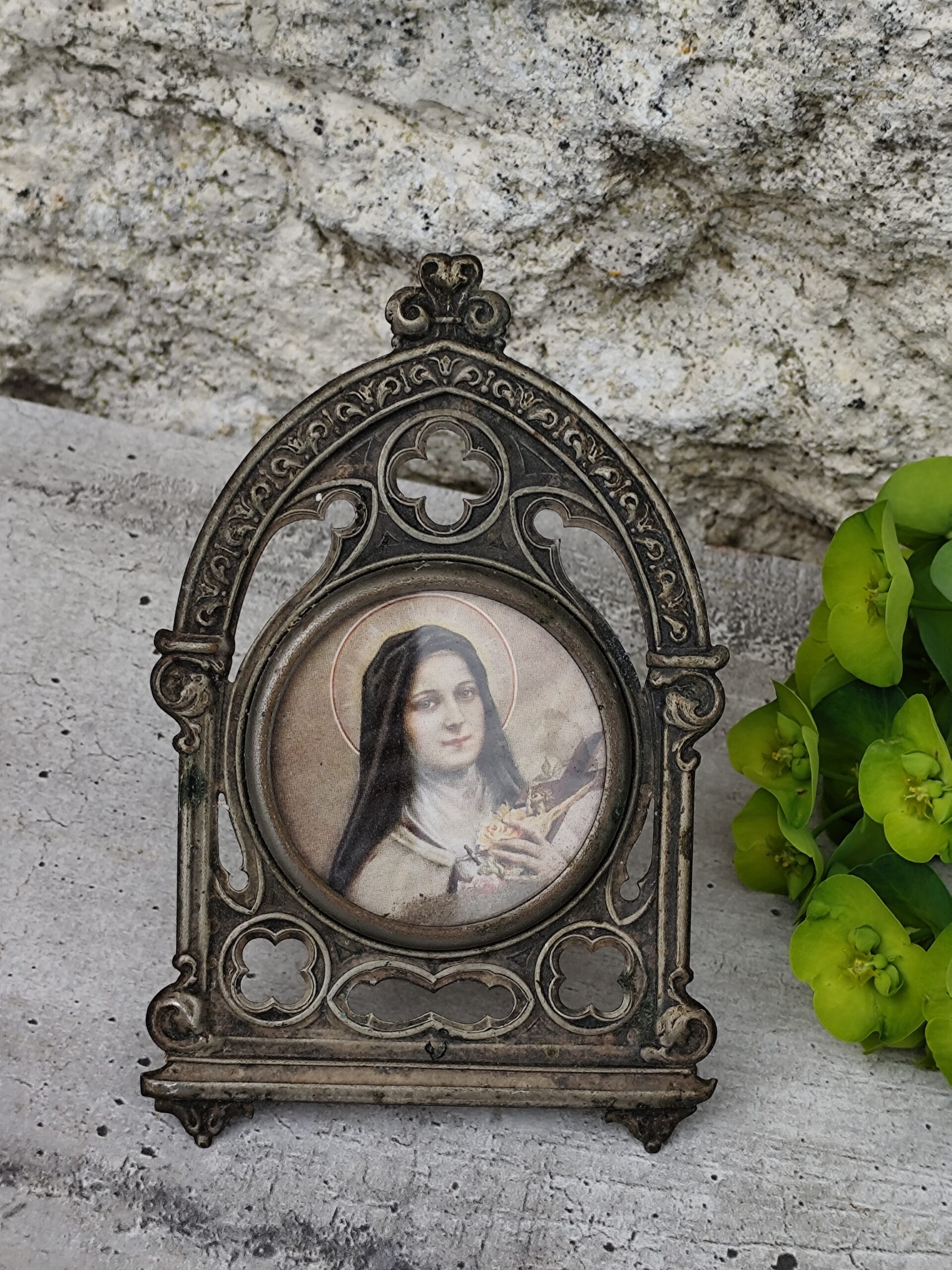 Cet ex-voto Sainte Thérèse est une pièce ancienne, chargée d’émotion et de spiritualité. Sainte Thérèse, figure de tendresse et de confiance, y apparaît comme une présence lumineuse, entourée de symboles de roses et de grâce. L’ex-voto, traditionnellement offert en remerciement ou en demande de protection, porte ici une vibration douce et profonde.