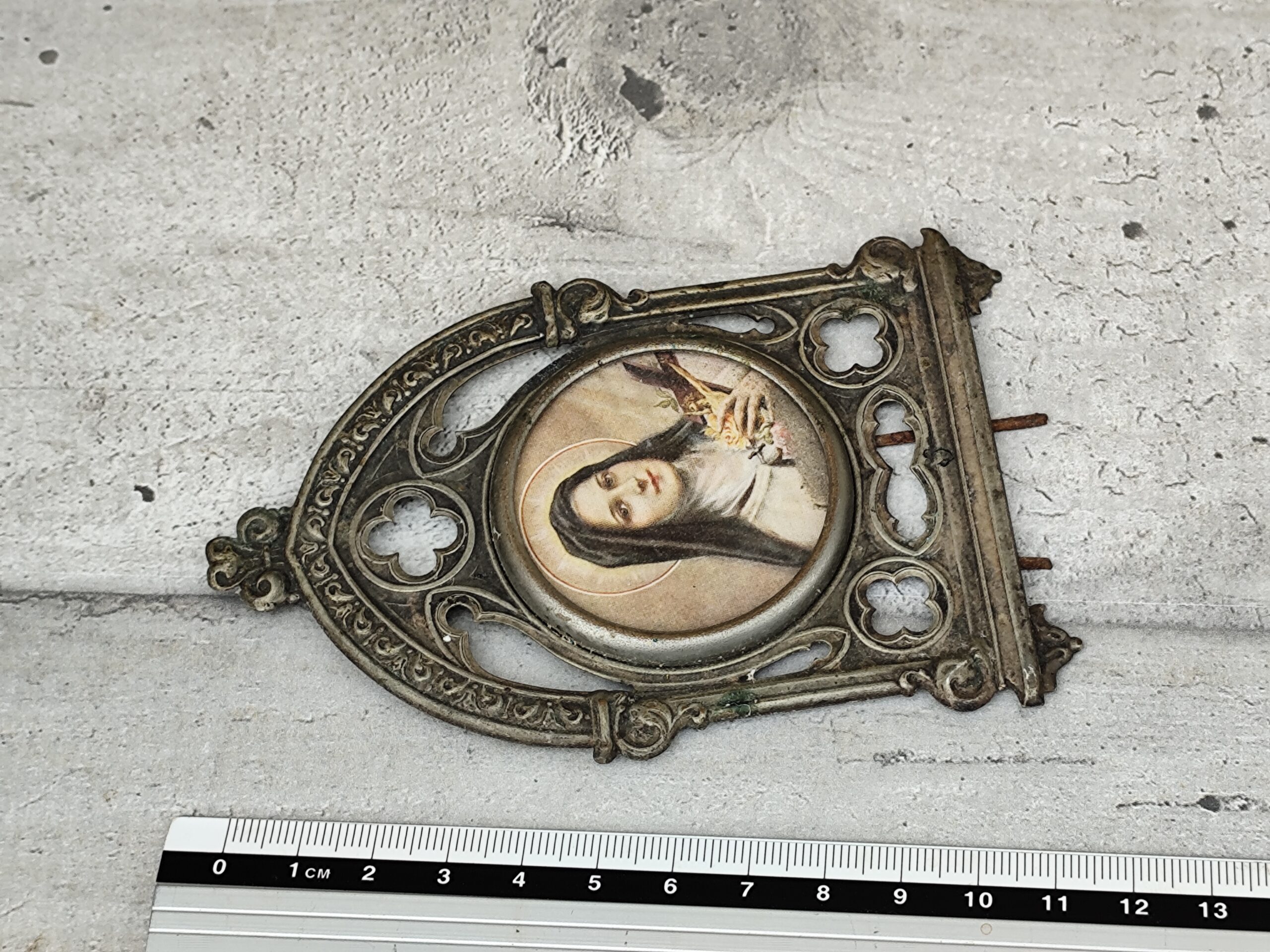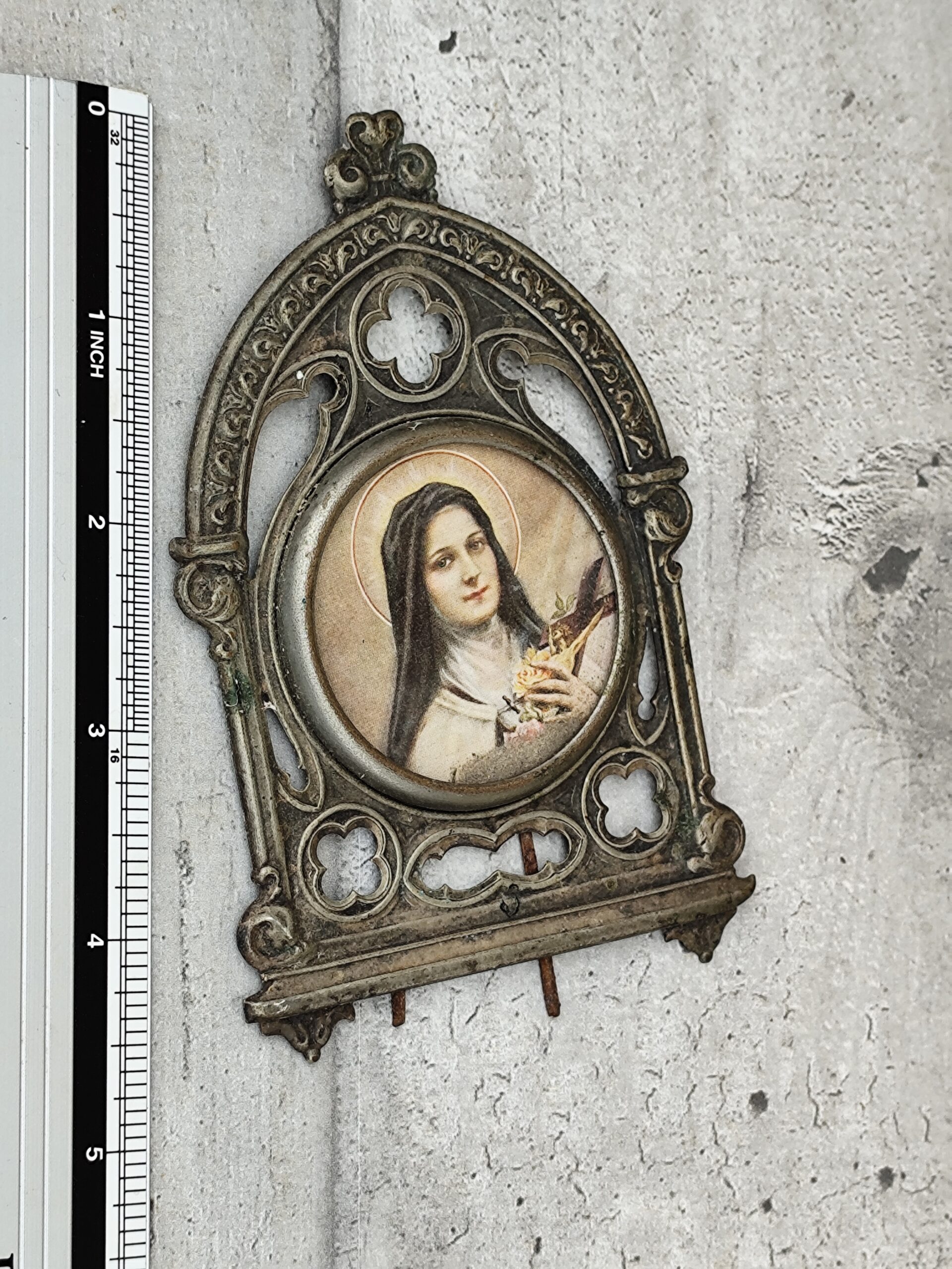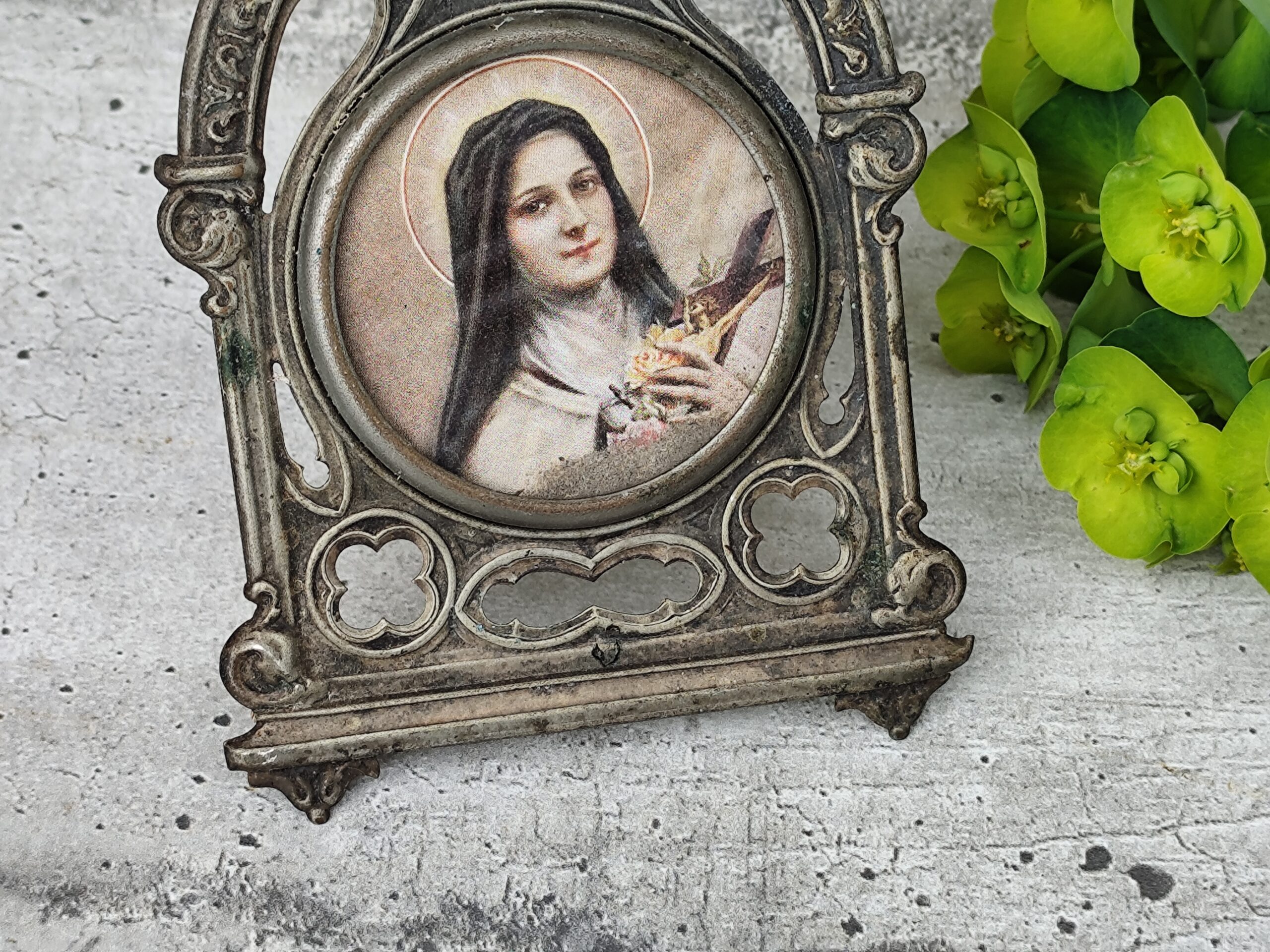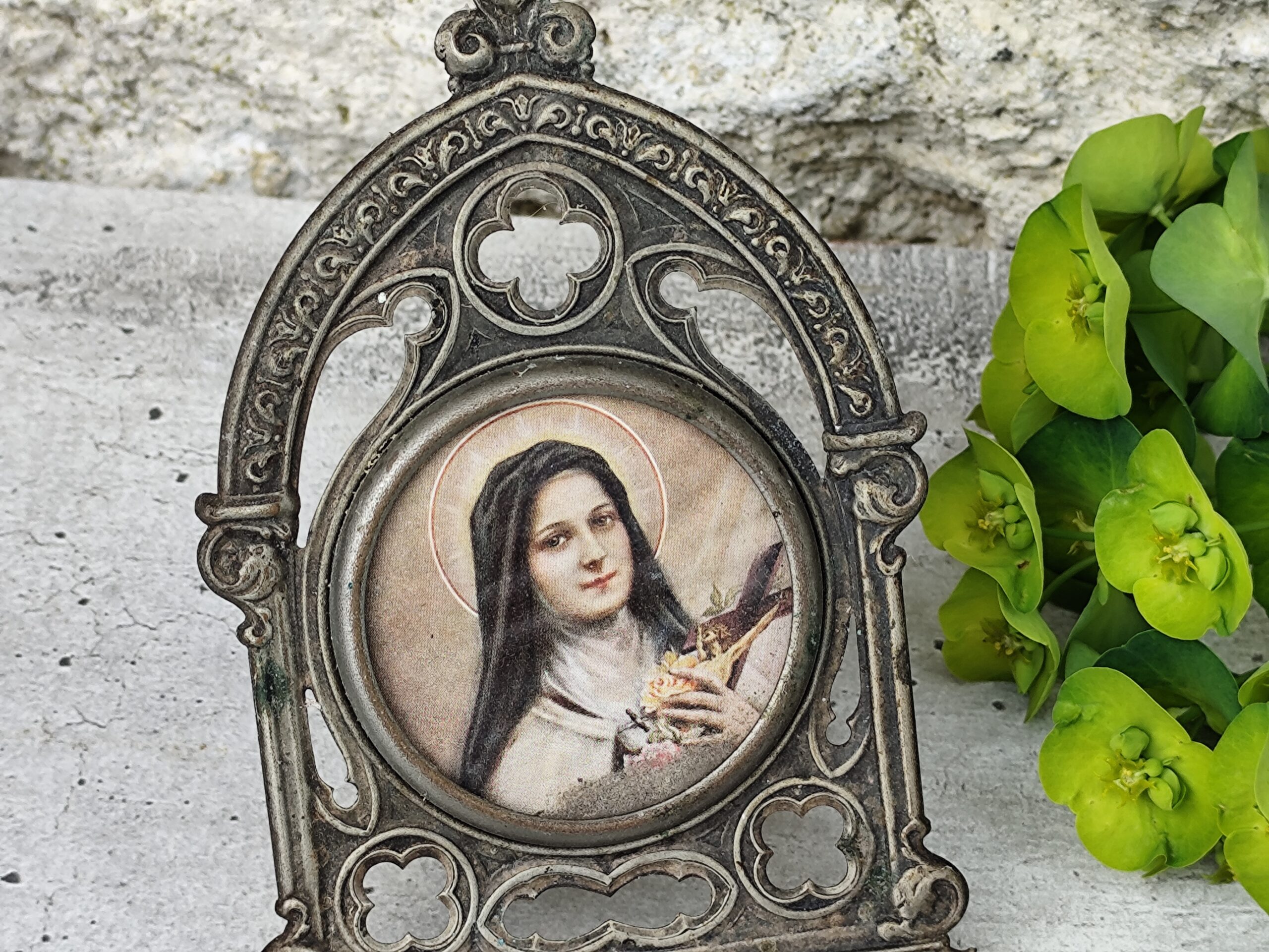 Cet ex-voto Sainte Thérèse est une pièce ancienne, chargée d’émotion et de spiritualité. Sainte Thérèse, figure de tendresse et de confiance, y apparaît comme une présence lumineuse, entourée de symboles de roses et de grâce. L’ex-voto, traditionnellement offert en remerciement ou en demande de protection, porte ici une vibration douce et profonde.