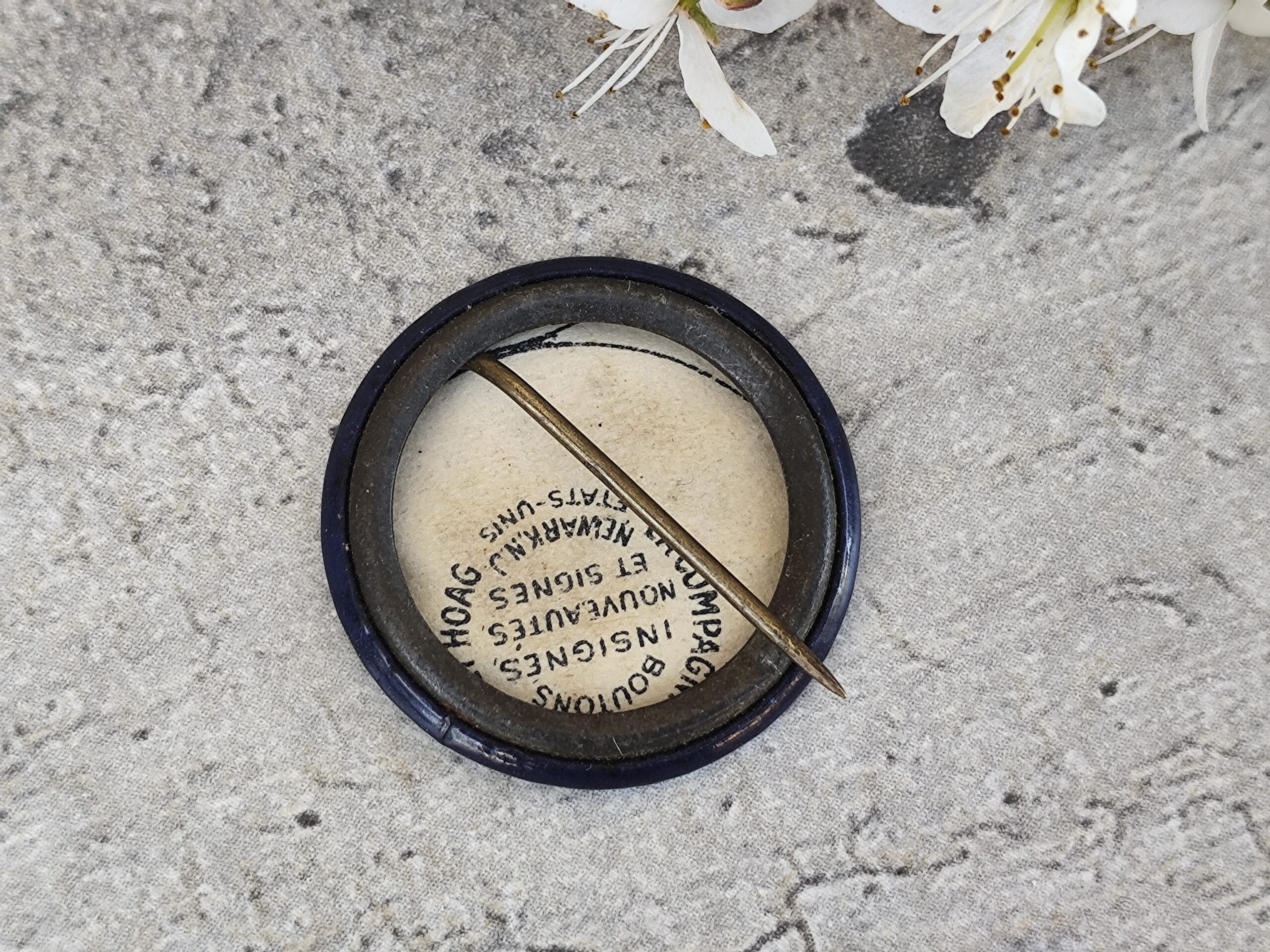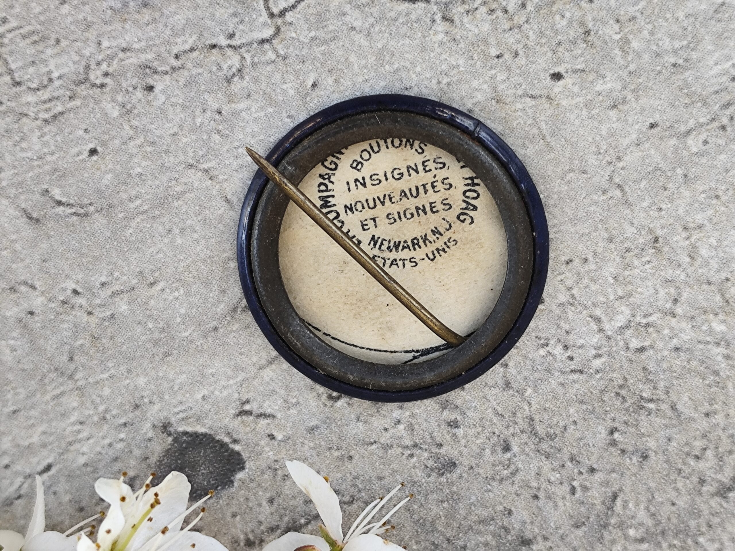 Le revers révèle un système d’attache d’origine, accompagné d’une mention de fabrication américaine, signe d’une diffusion internationale de ces symboles spirituels et patriotiques.