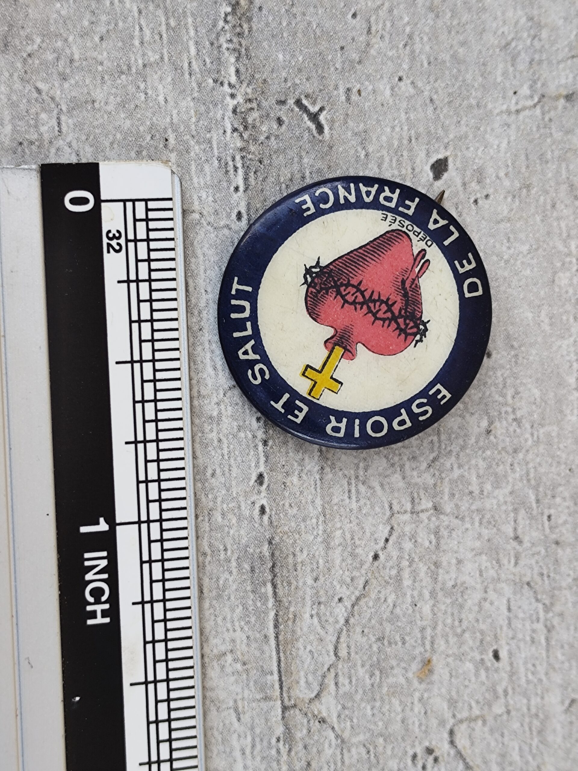 Insigne ancien circulaire représentant le Sacré‑Cœur enflammé, entouré d’une couronne d’épines et surmonté d’une croix rayonnante.