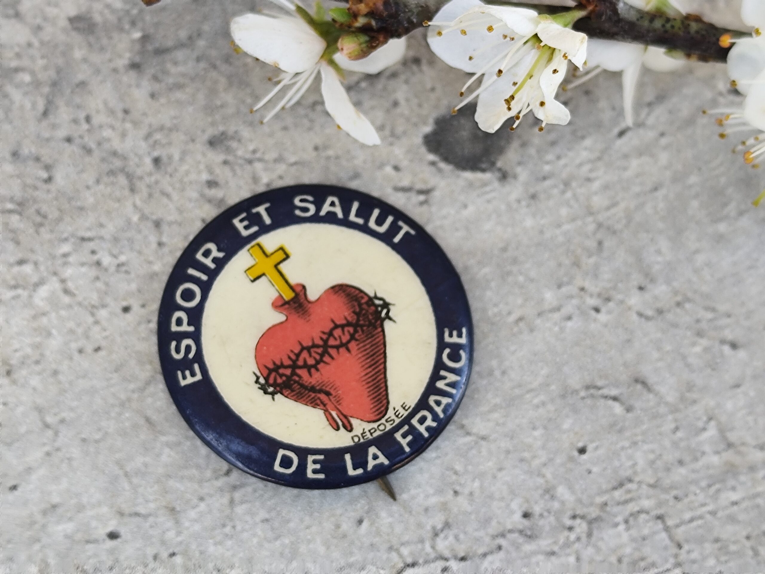 Son fond bleu profond met en valeur l’inscription « Espoir et Salut de la France », témoignage d’une époque où foi et identité nationale se mêlaient dans un même élan de protection et d’espérance.