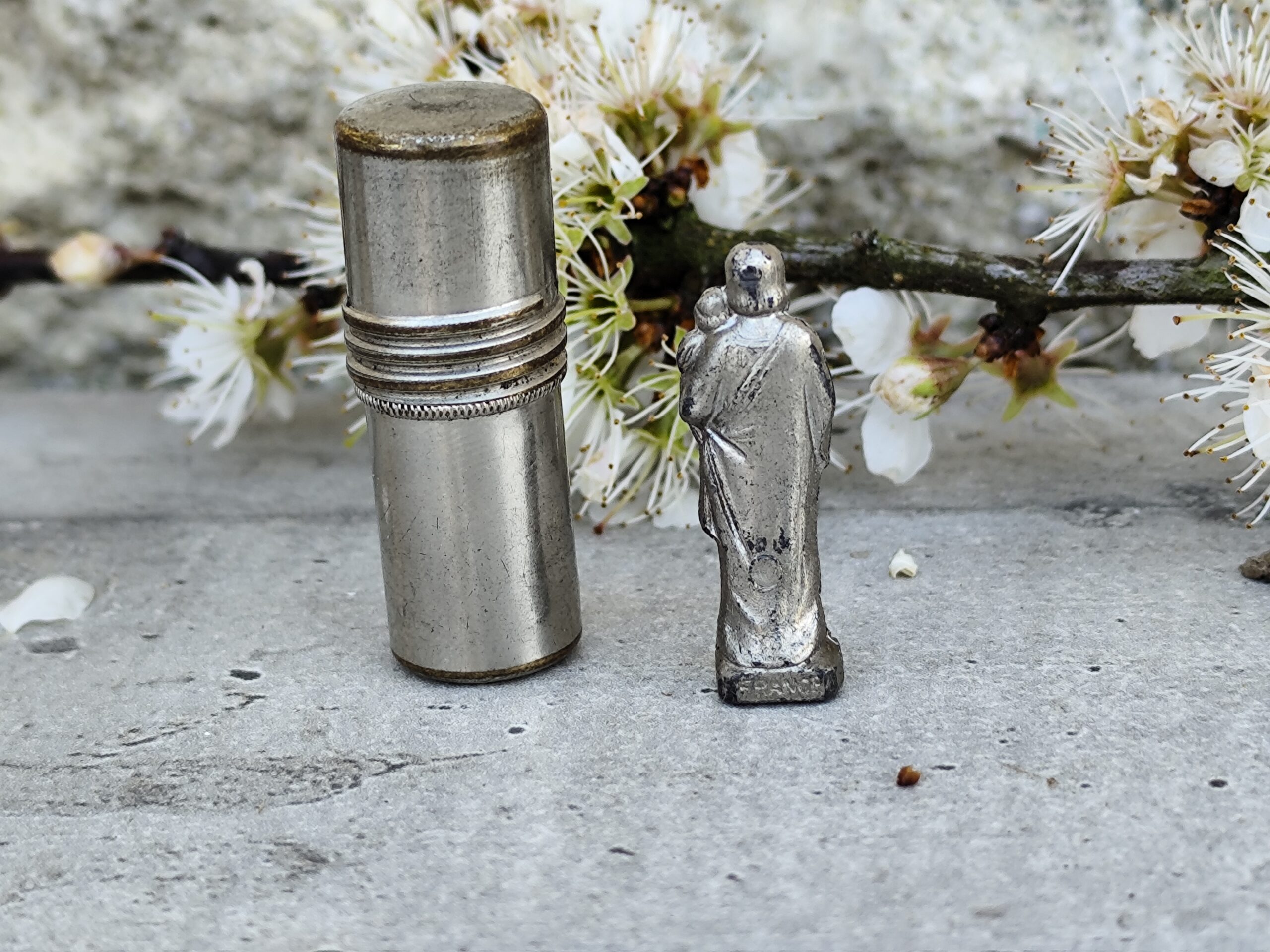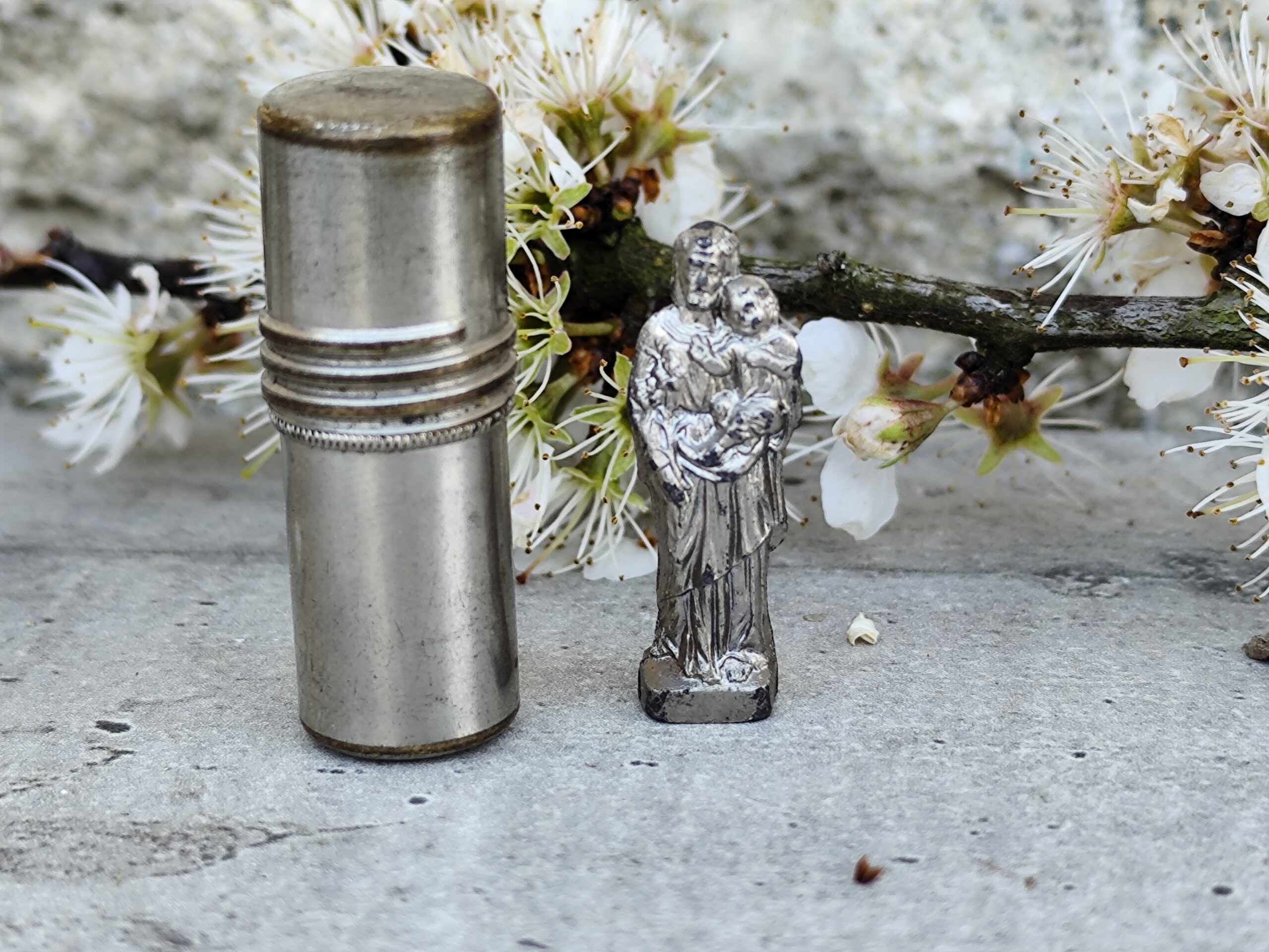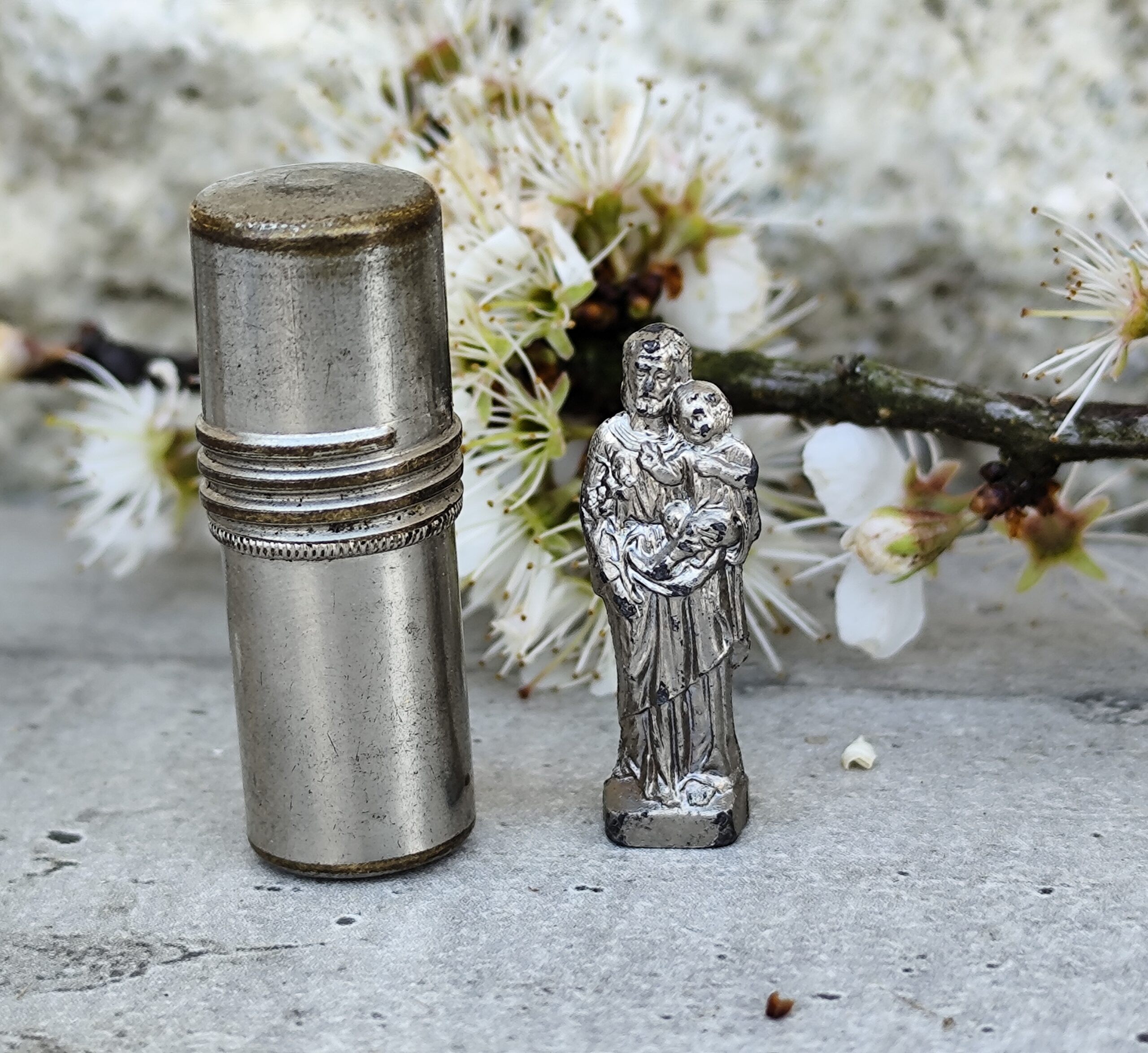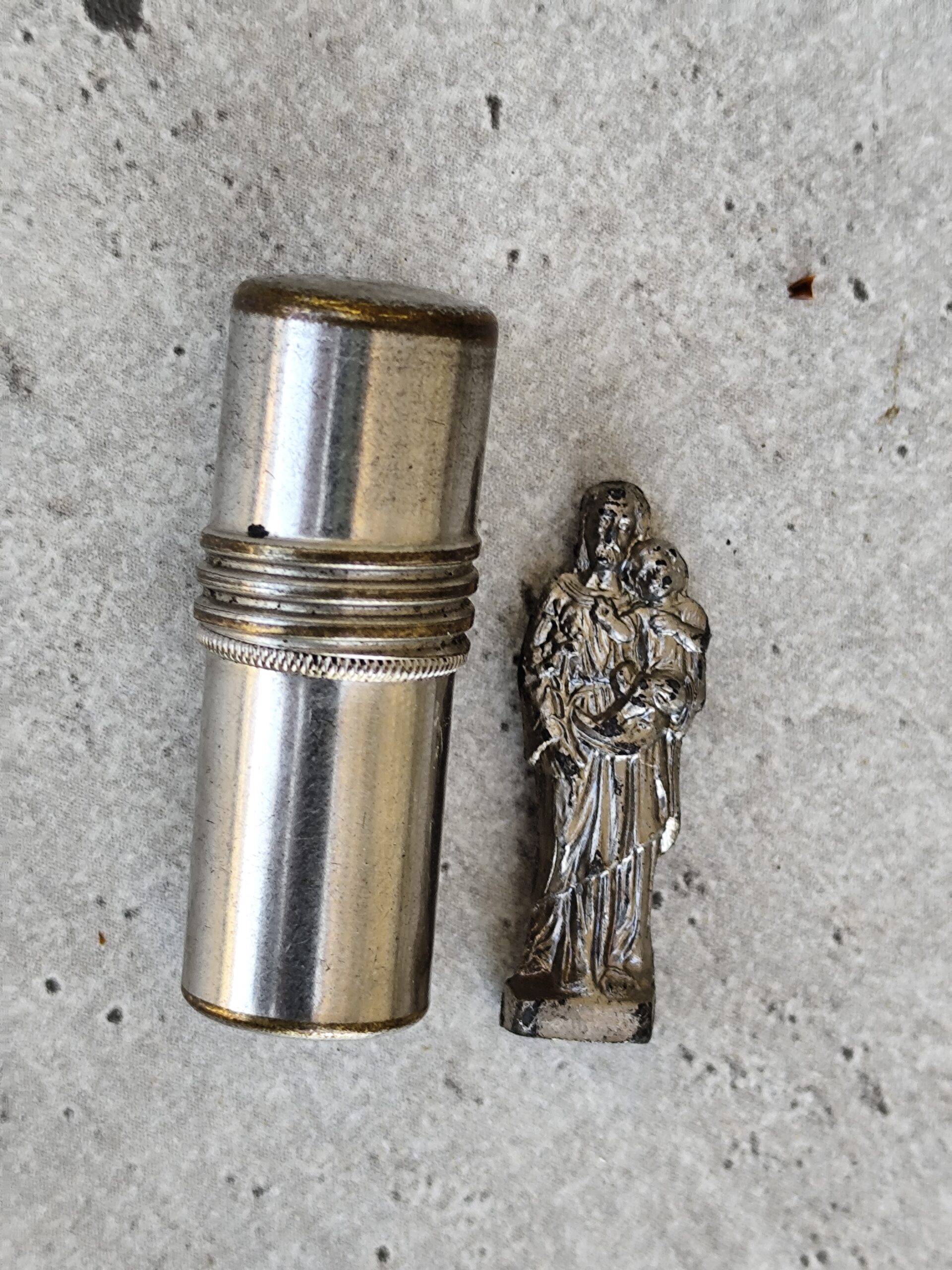 Reliquaire de voyage ancien représentant Saint Joseph portant l’Enfant Jésus, accompagné de son petit étui. Un objet sacré, chargé d’histoire et de douceur, idéal pour la protection, la prière et la dévotion quotidienne.