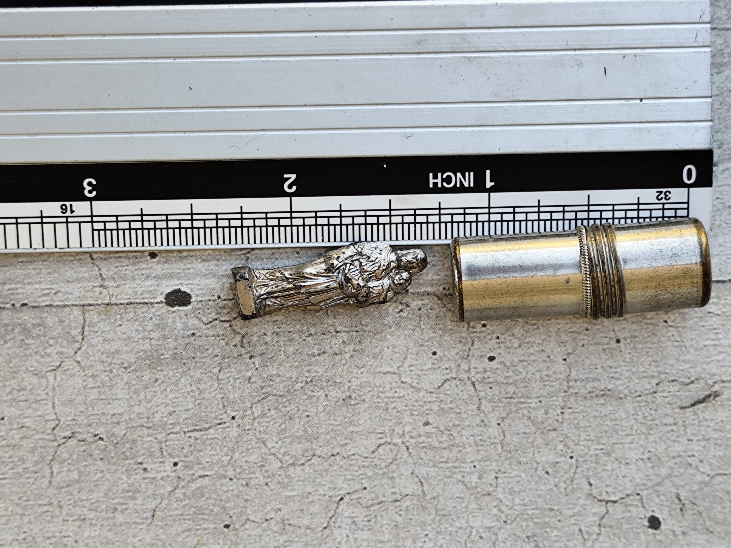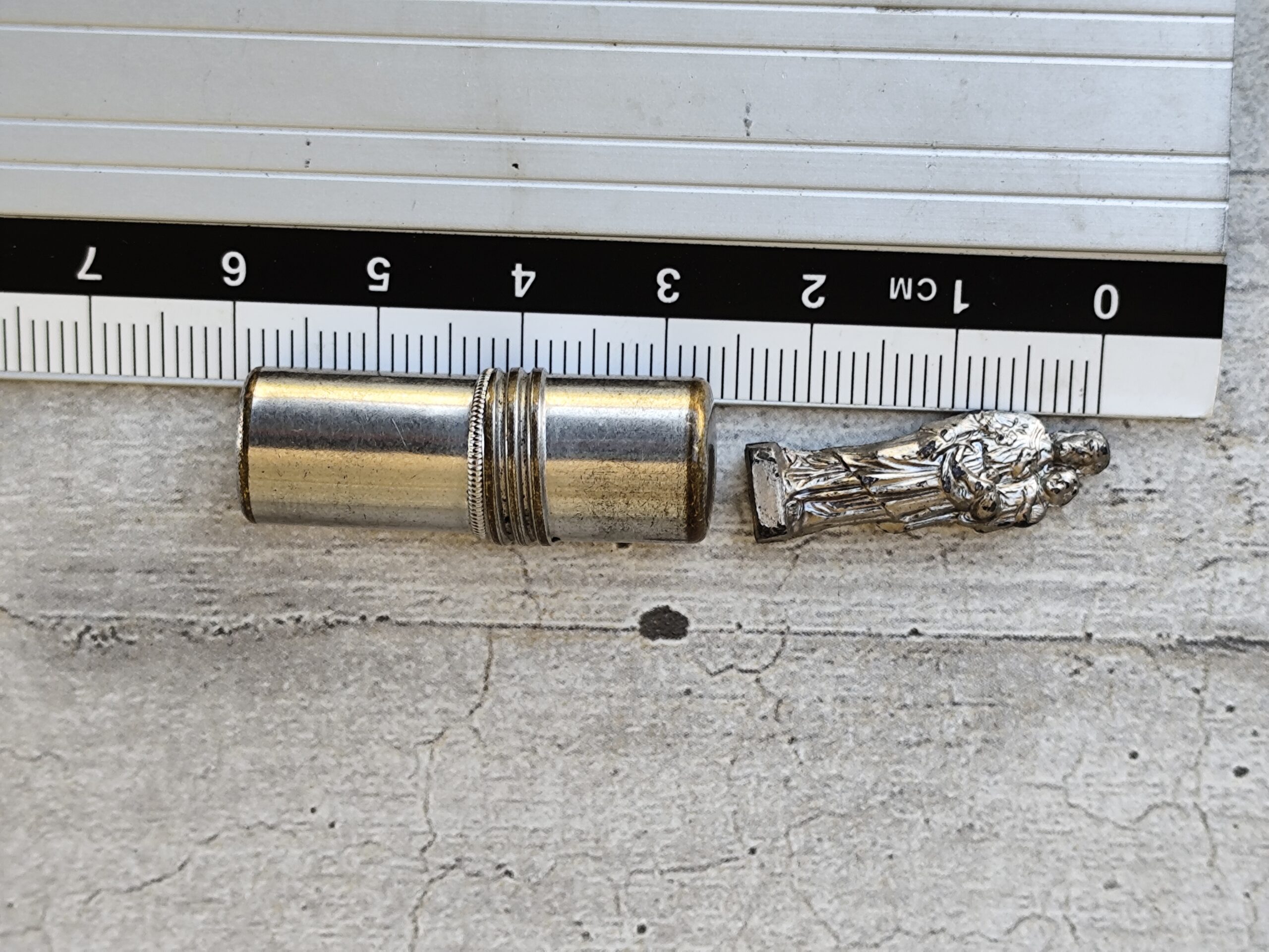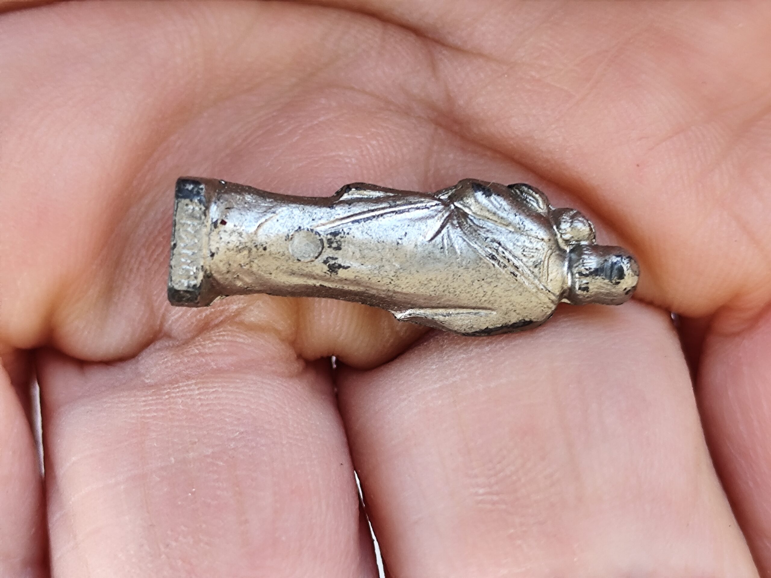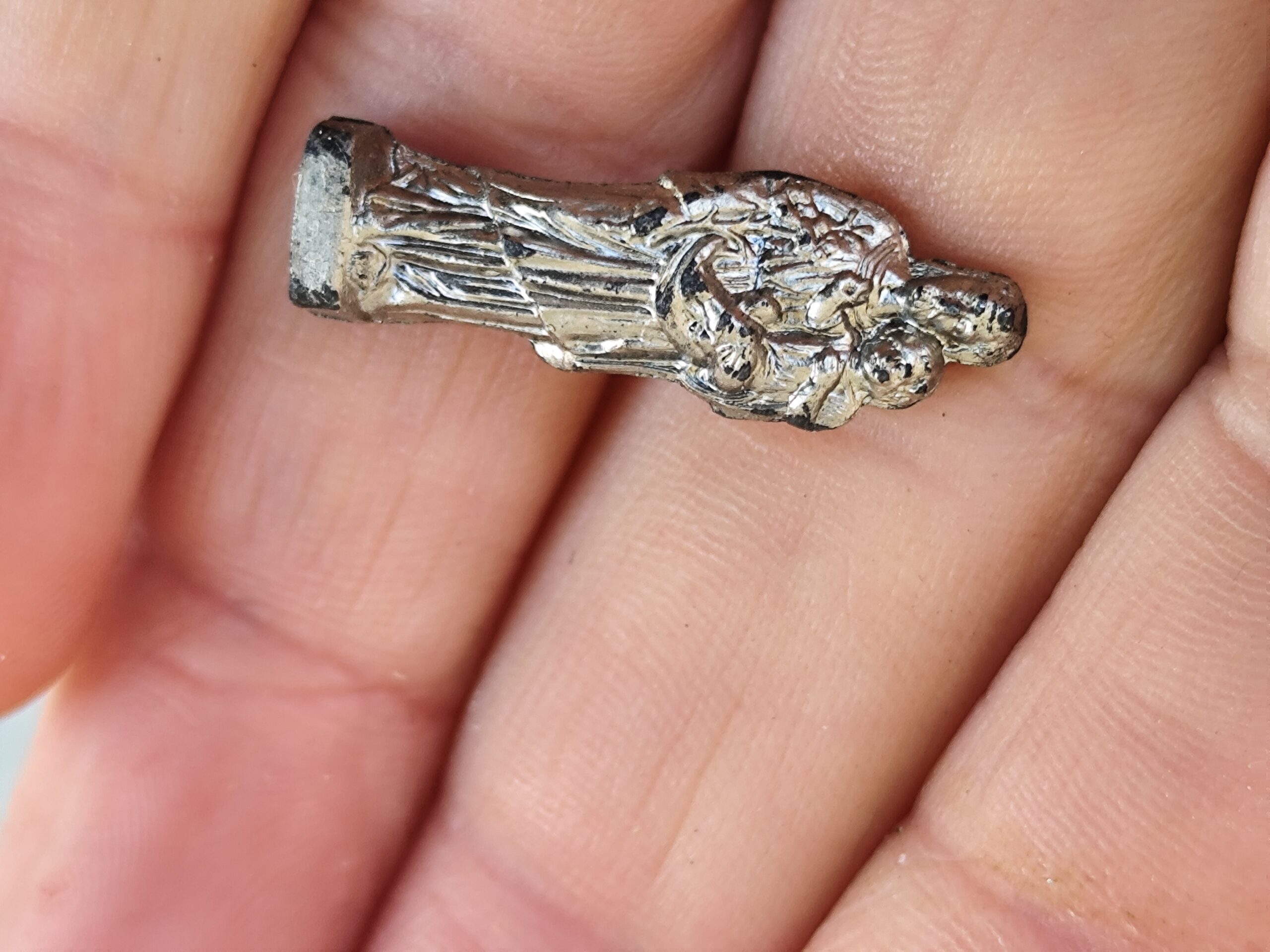 Reliquaire de voyage ancien représentant Saint Joseph portant l’Enfant Jésus, accompagné de son petit étui. Un objet sacré, chargé d’histoire et de douceur, idéal pour la protection, la prière et la dévotion quotidienne.