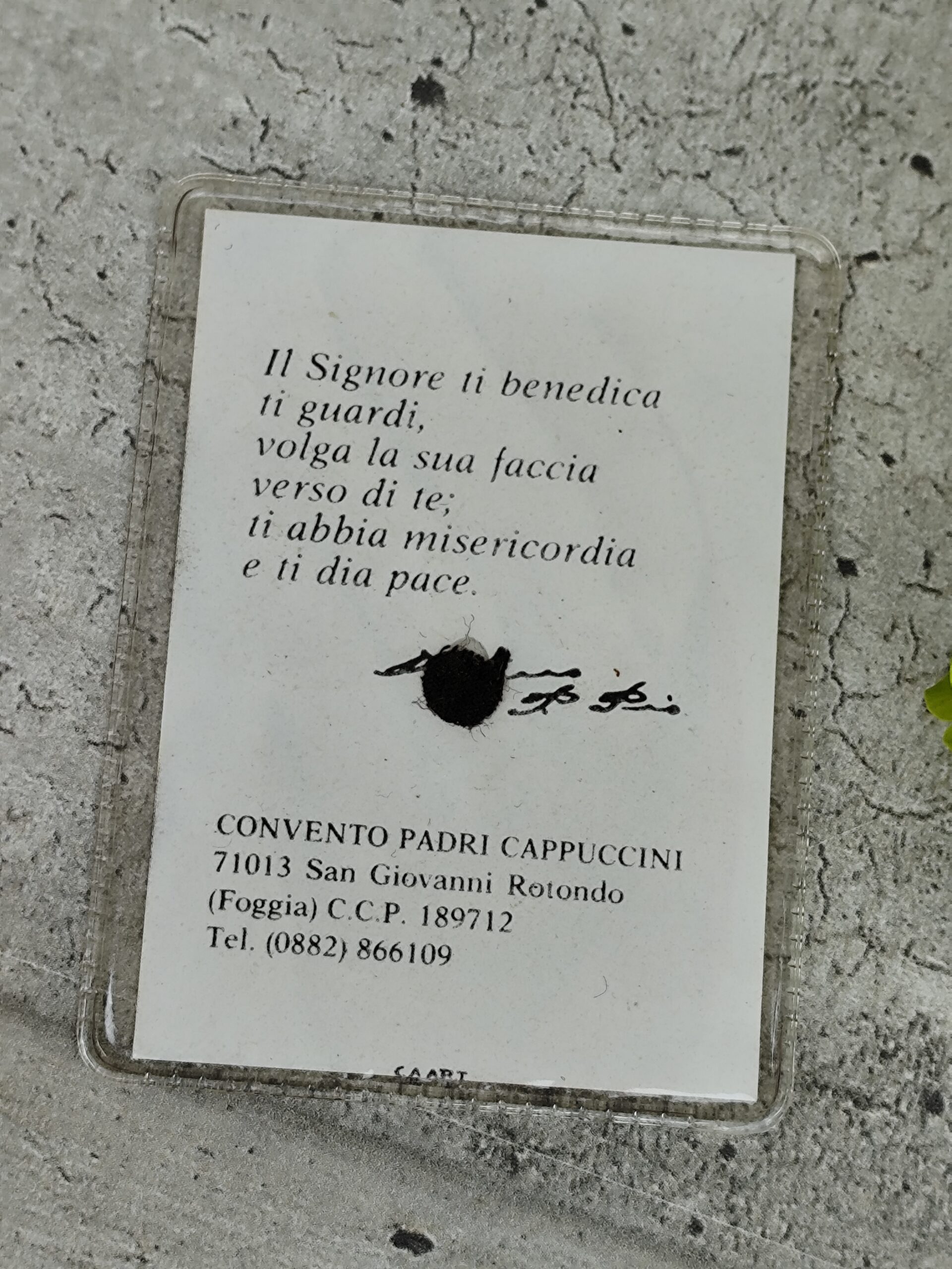 Cette relique porte la bénédiction traditionnelle du lieu, un texte ancien transmis par les frères capucins.