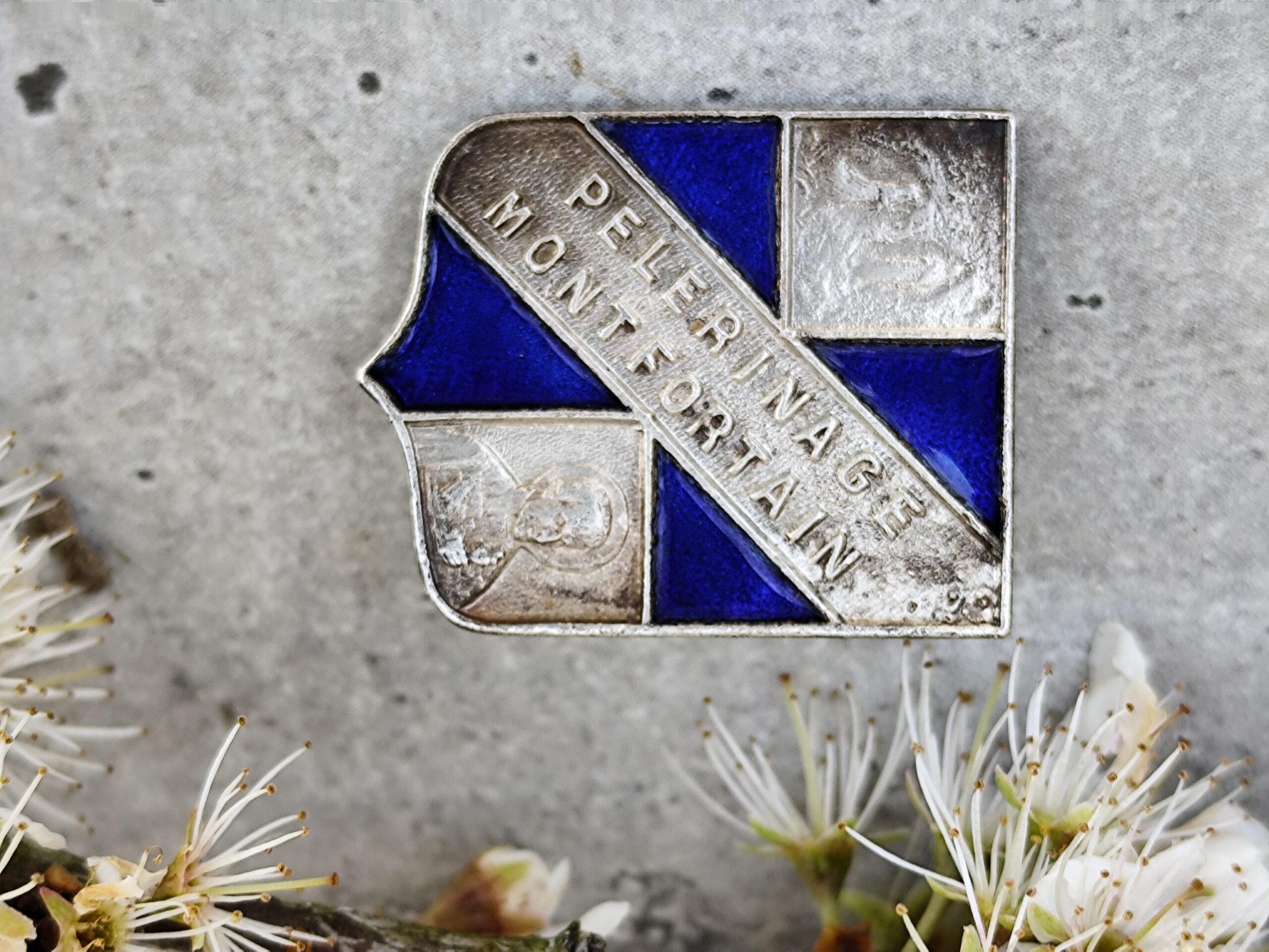 Broche ancienne Pèlerinage Montfortain – badge religieux vintage émaillé – insigne catholique collection – objet de dévotion France.