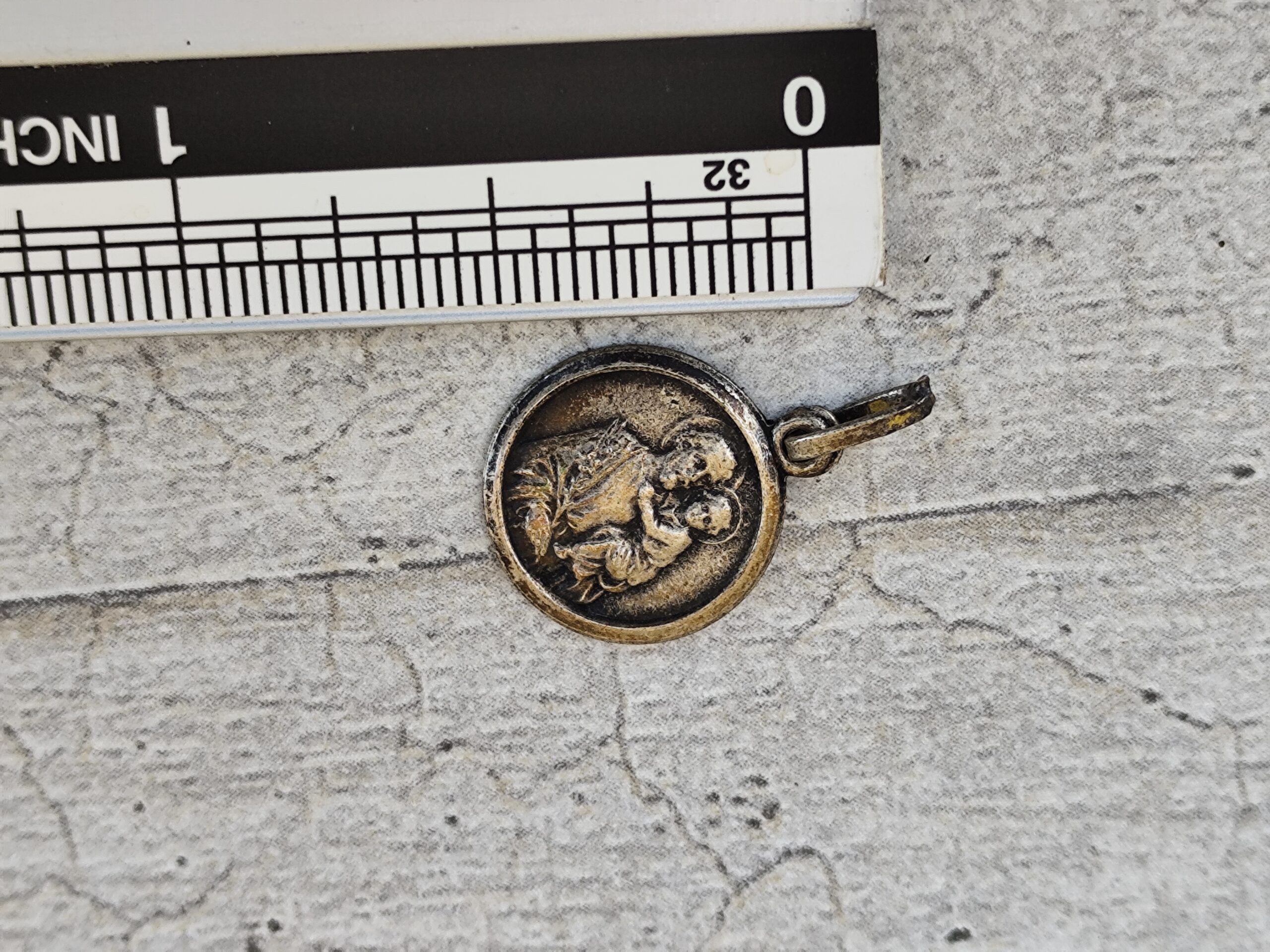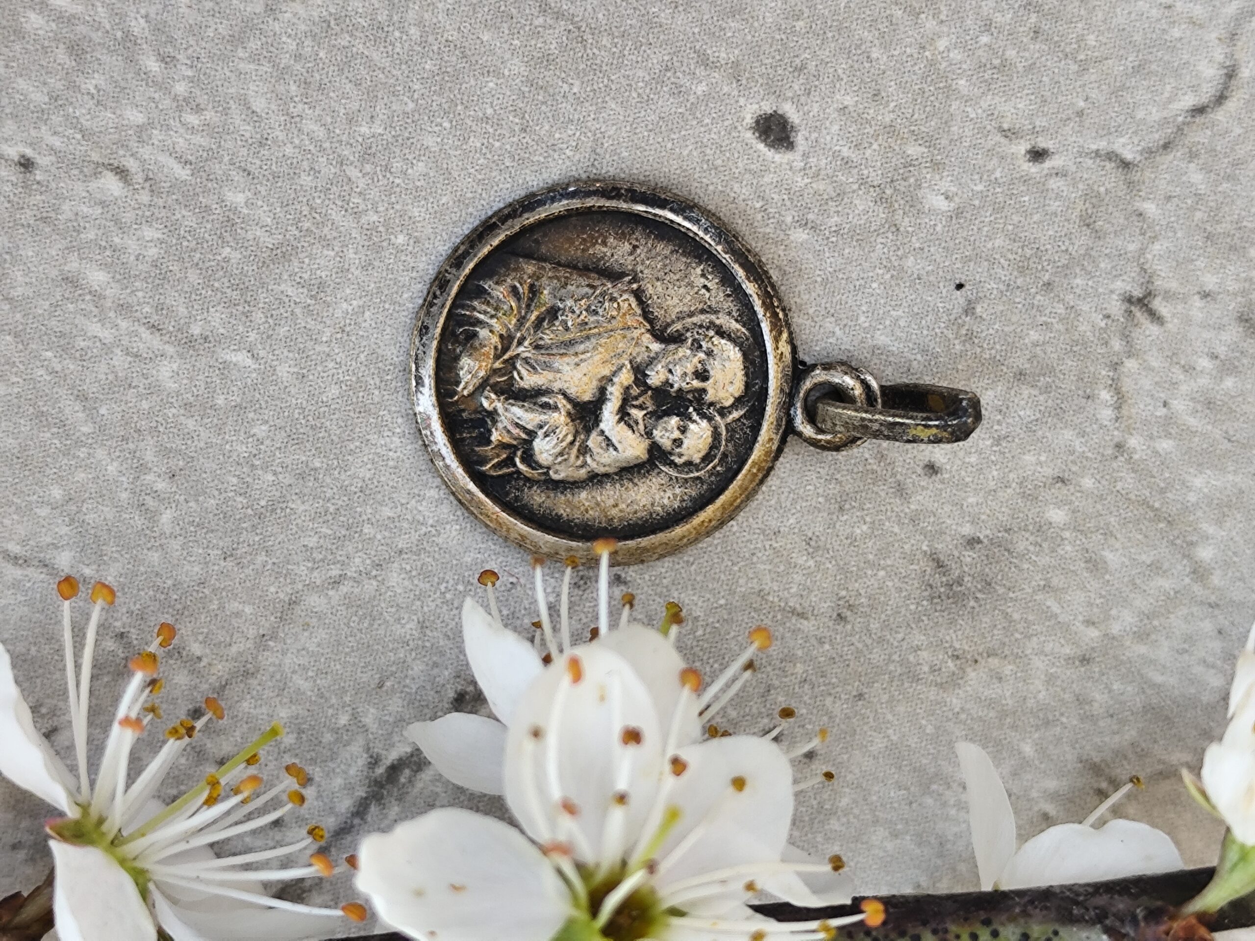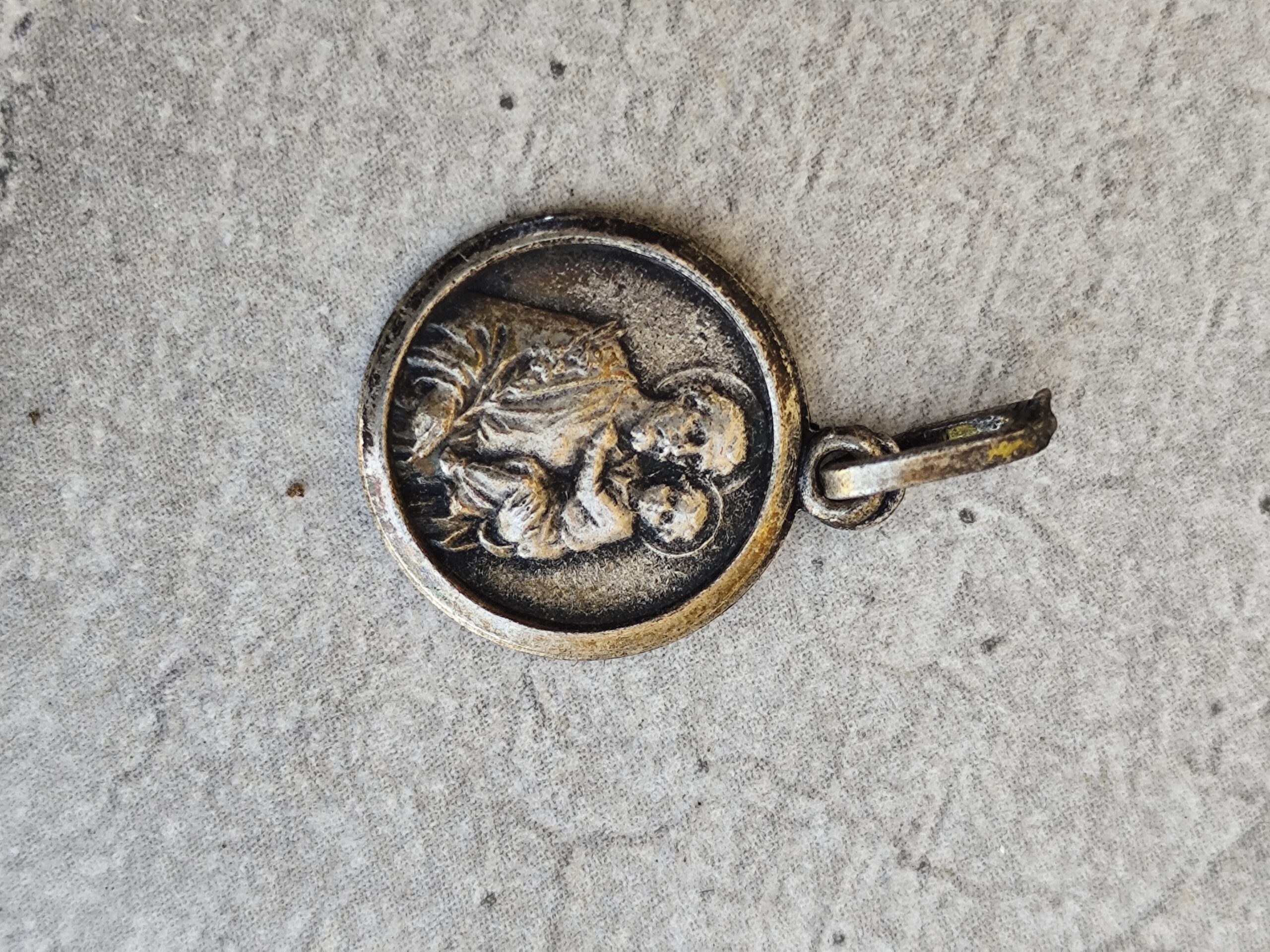 Cette médaille ancienne de Saint Joseph portant l’Enfant Jésus est une pièce rare, empreinte de douceur et de protection. Sculptée en relief, elle porte la patine du temps, signe d’une vie de prières et de transmission.