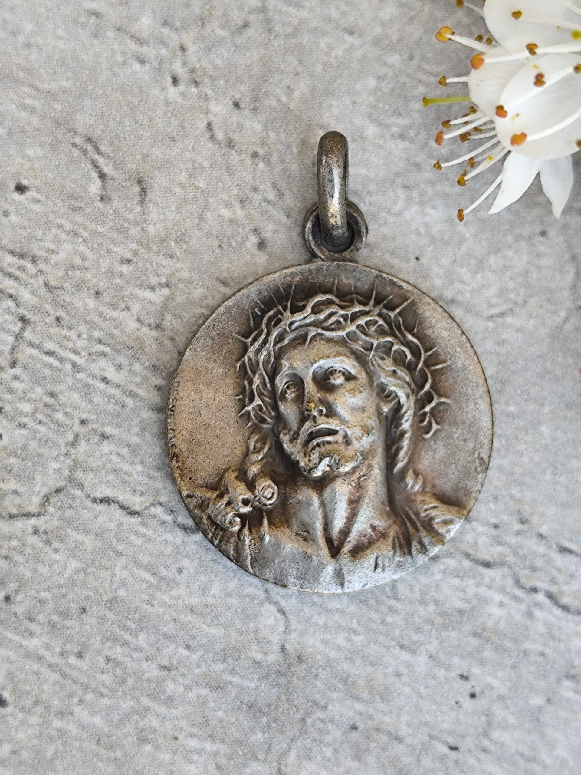 Sur le revers, le Christ couronné d’épines, représenté avec une intensité douce, dans un relief expressif marqué par le temps.