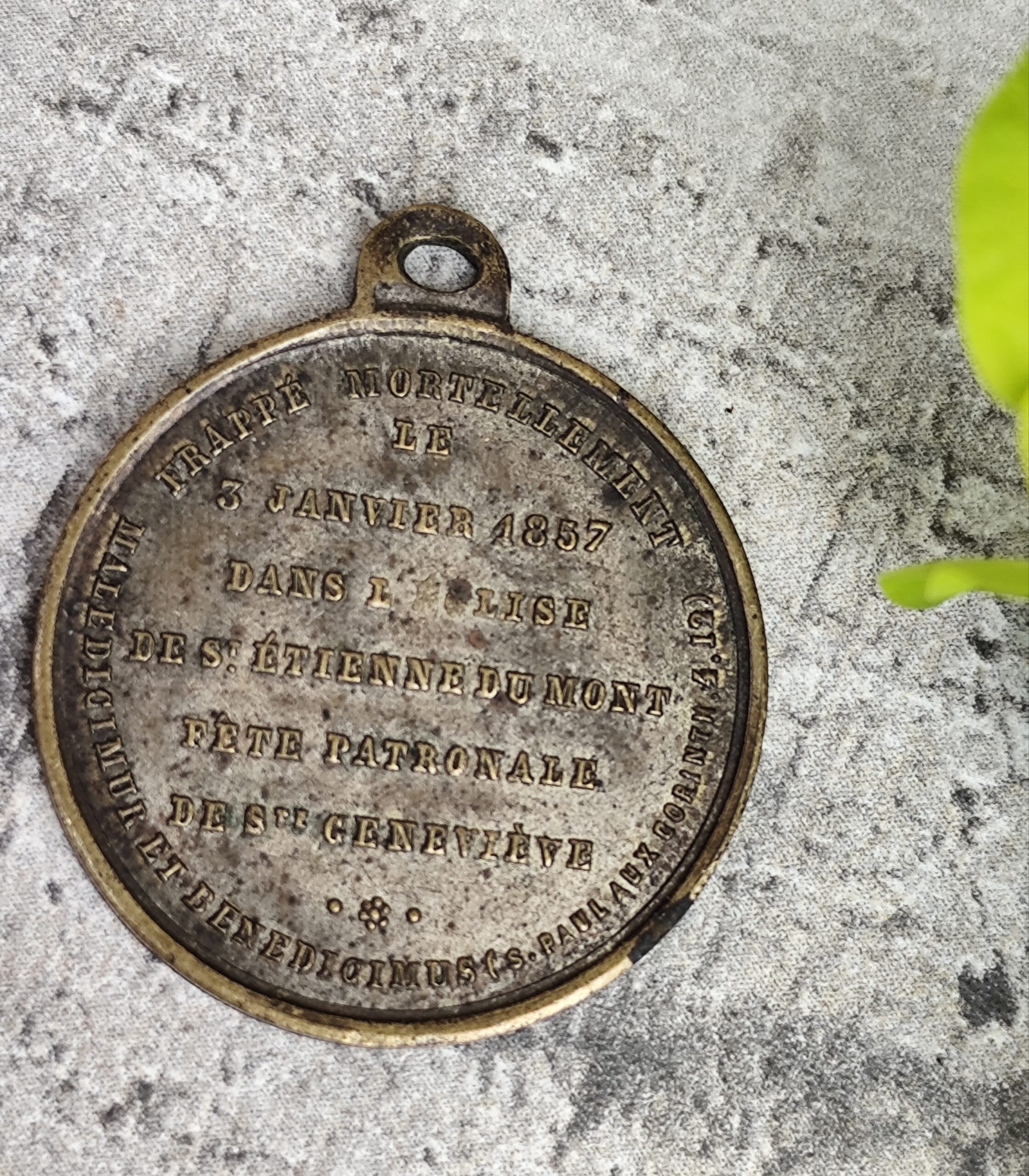 Le revers rappelle l’événement tragique survenu le 3 janvier 1857 dans l’église Saint‑Étienne‑du‑Mont, faisant de cette médaille un témoignage précieux du patrimoine religieux et parisien du XIXᵉ siècle.