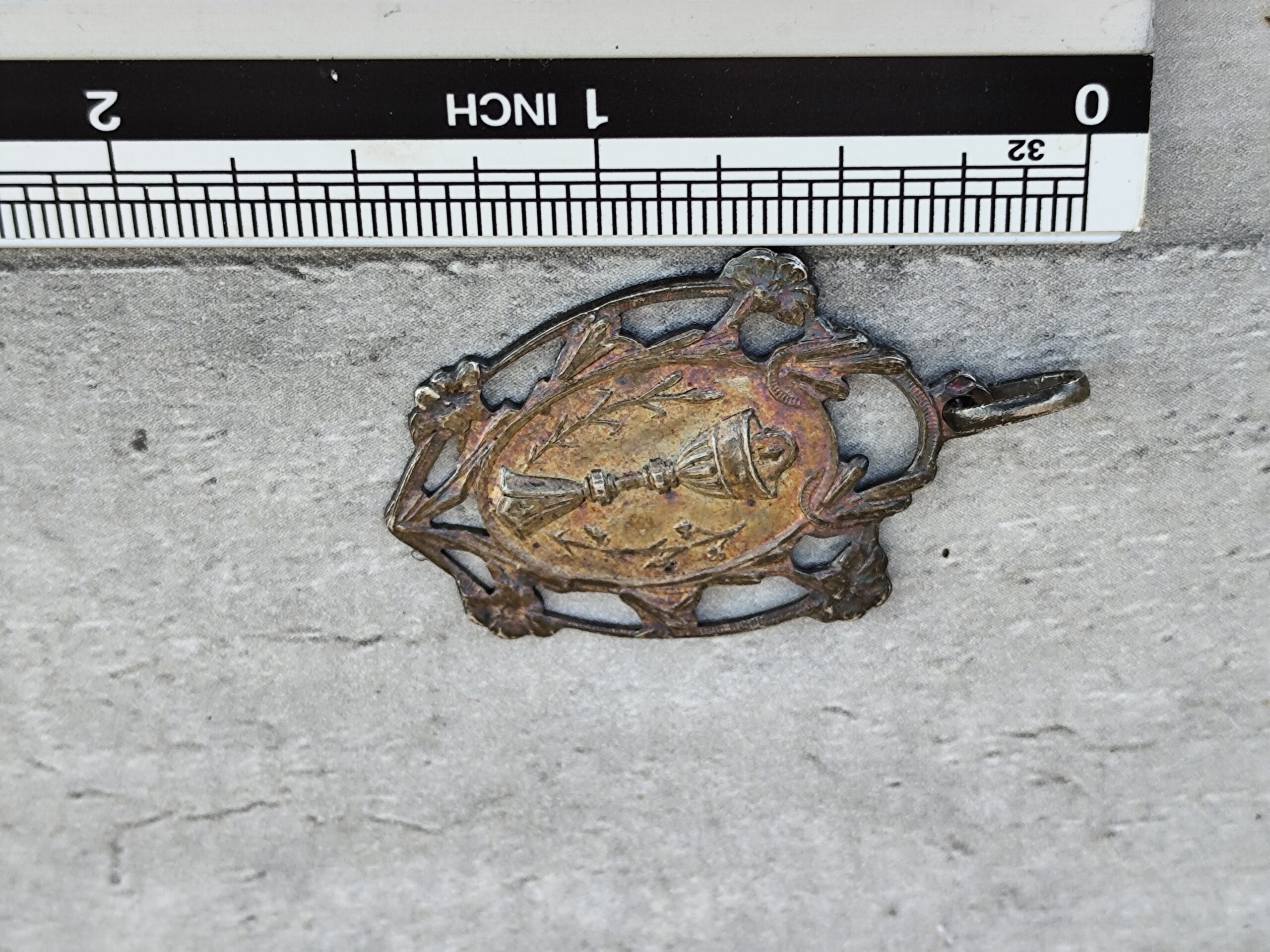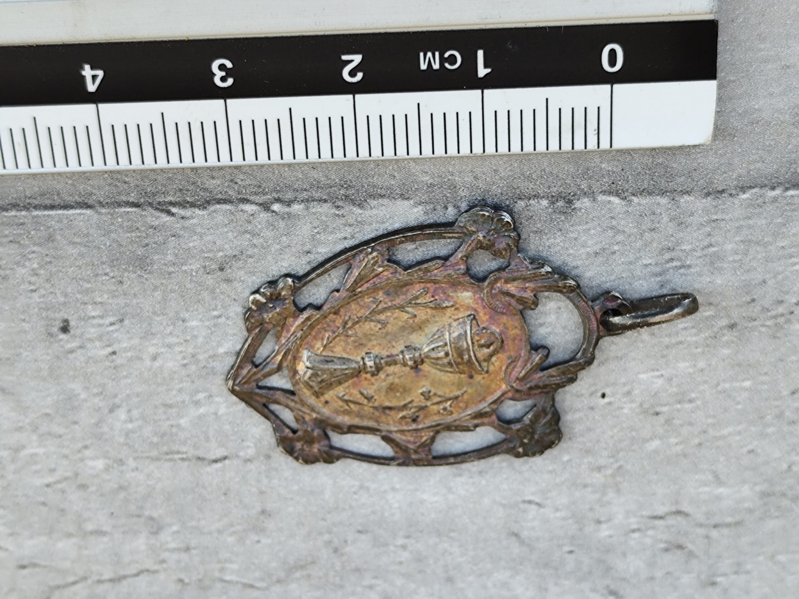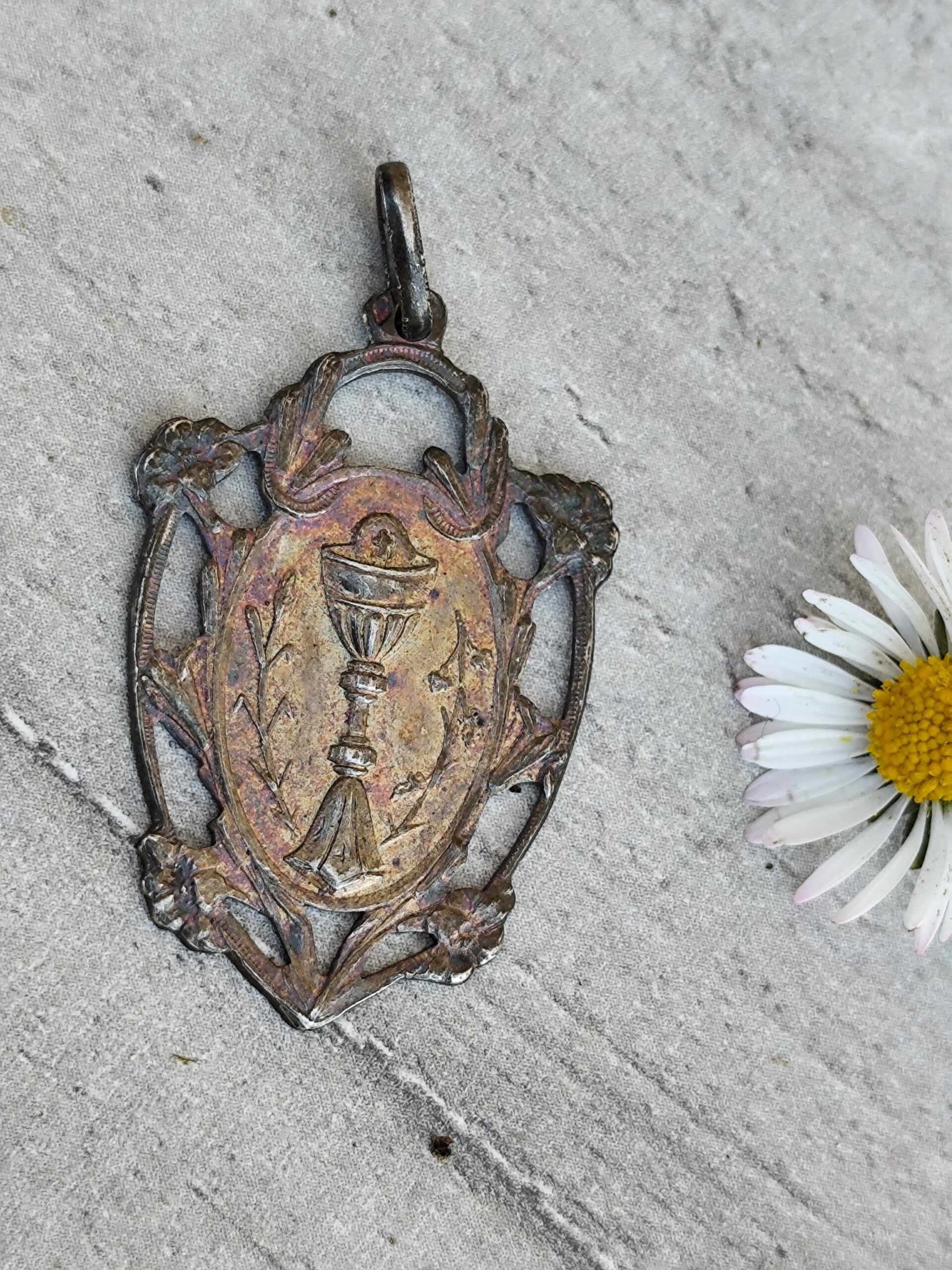 Une médaille de communion délicate, ornée d’un calice finement gravé et accompagnée d’une petite clé symbolique.