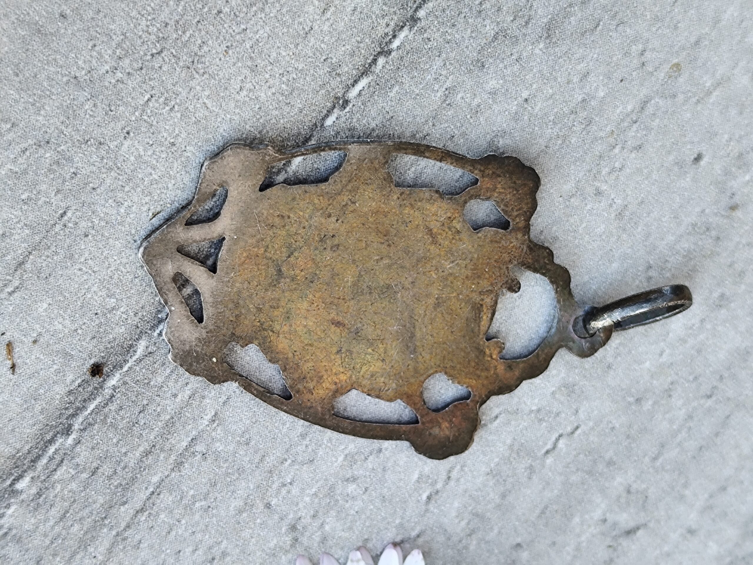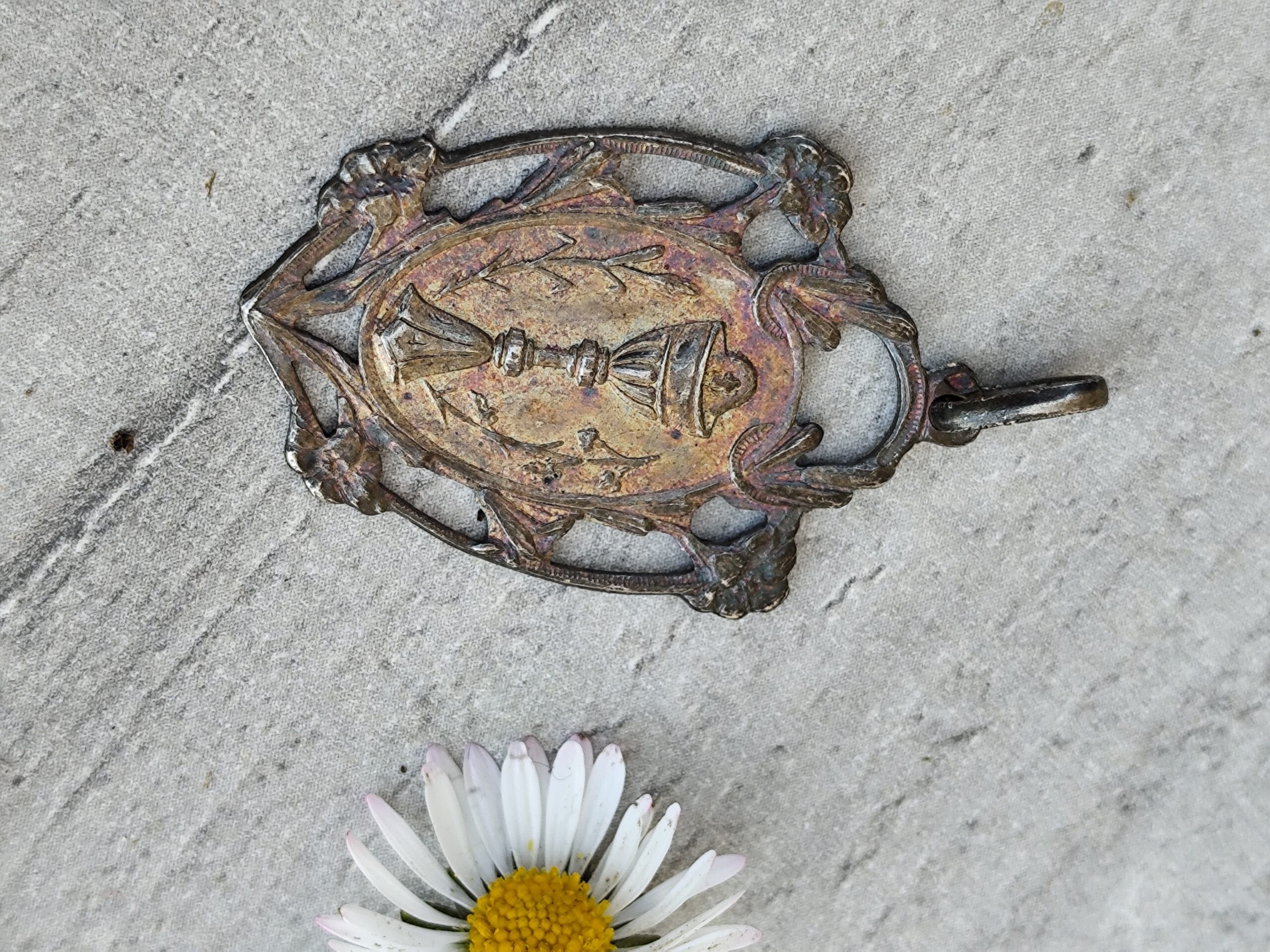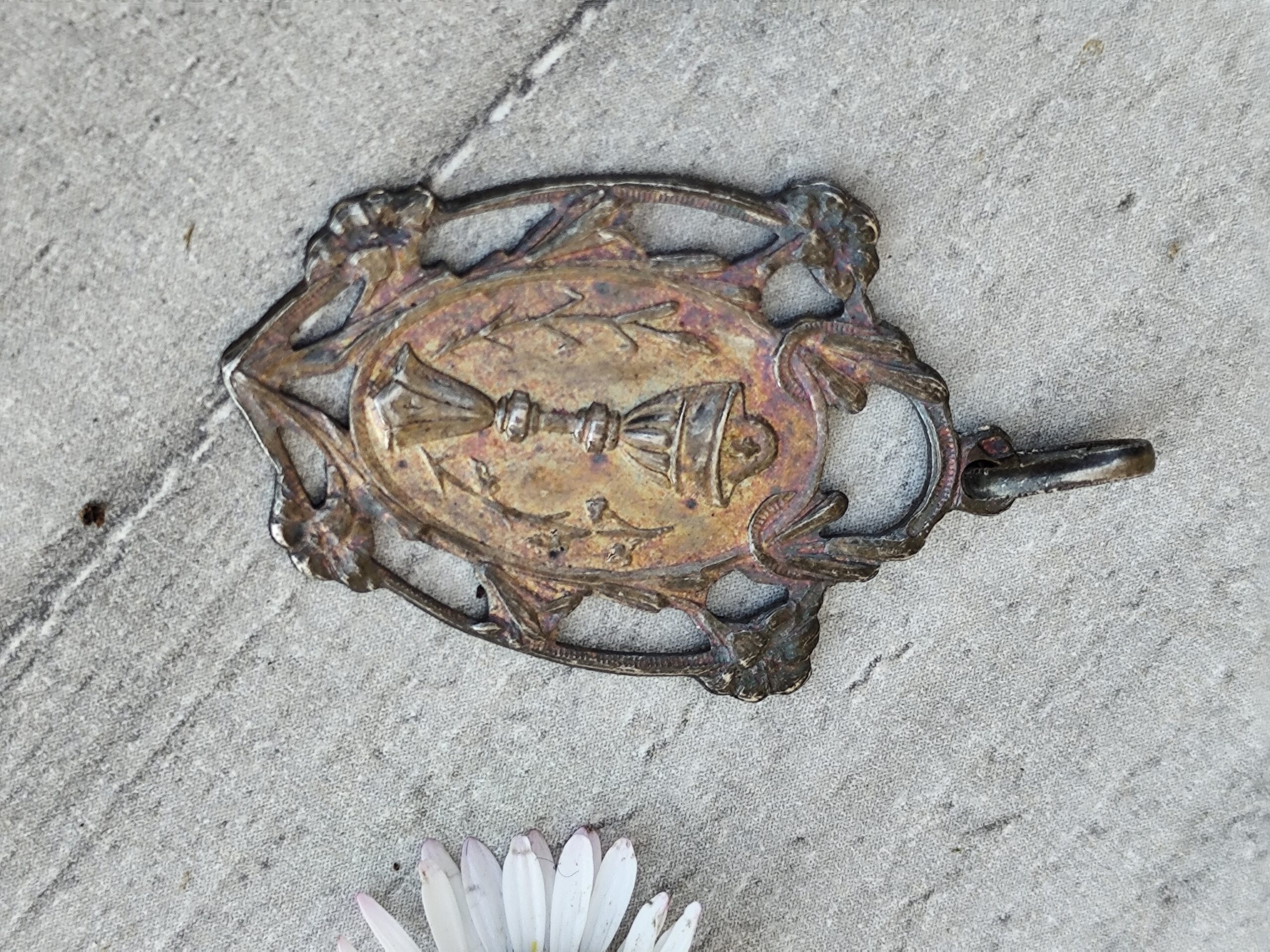 Une médaille de communion délicate, ornée d’un calice finement gravé et accompagnée d’une petite clé symbolique.