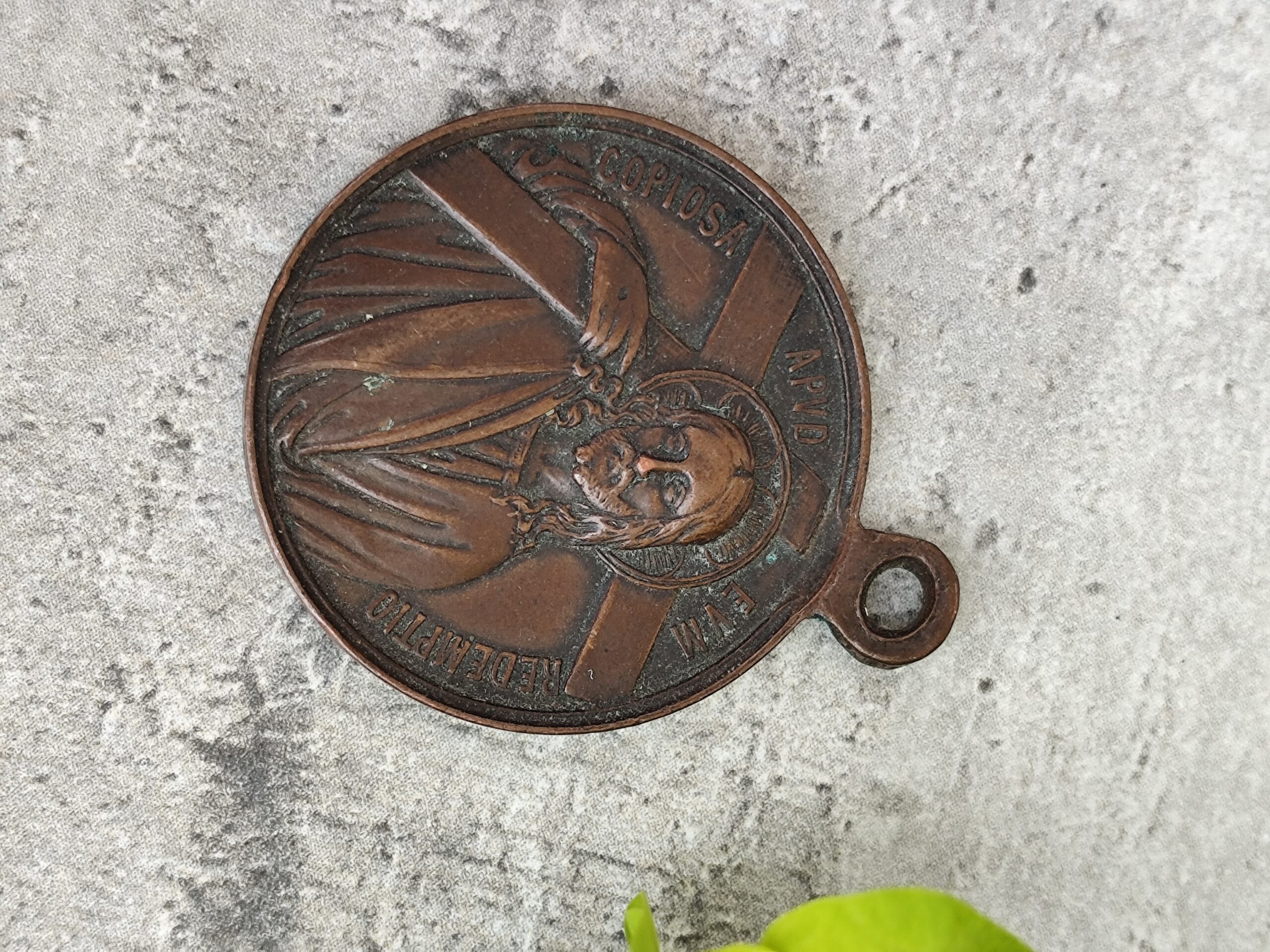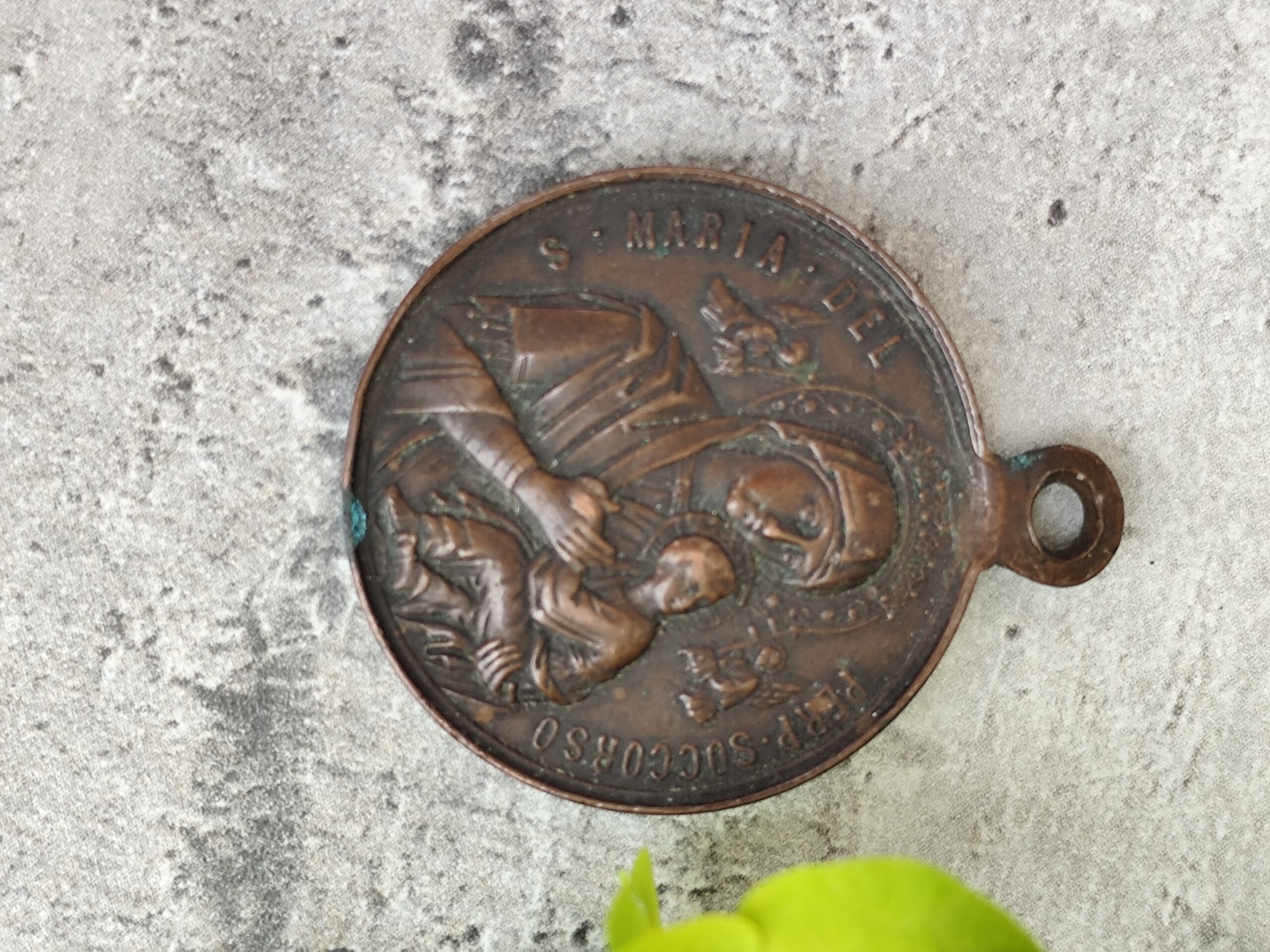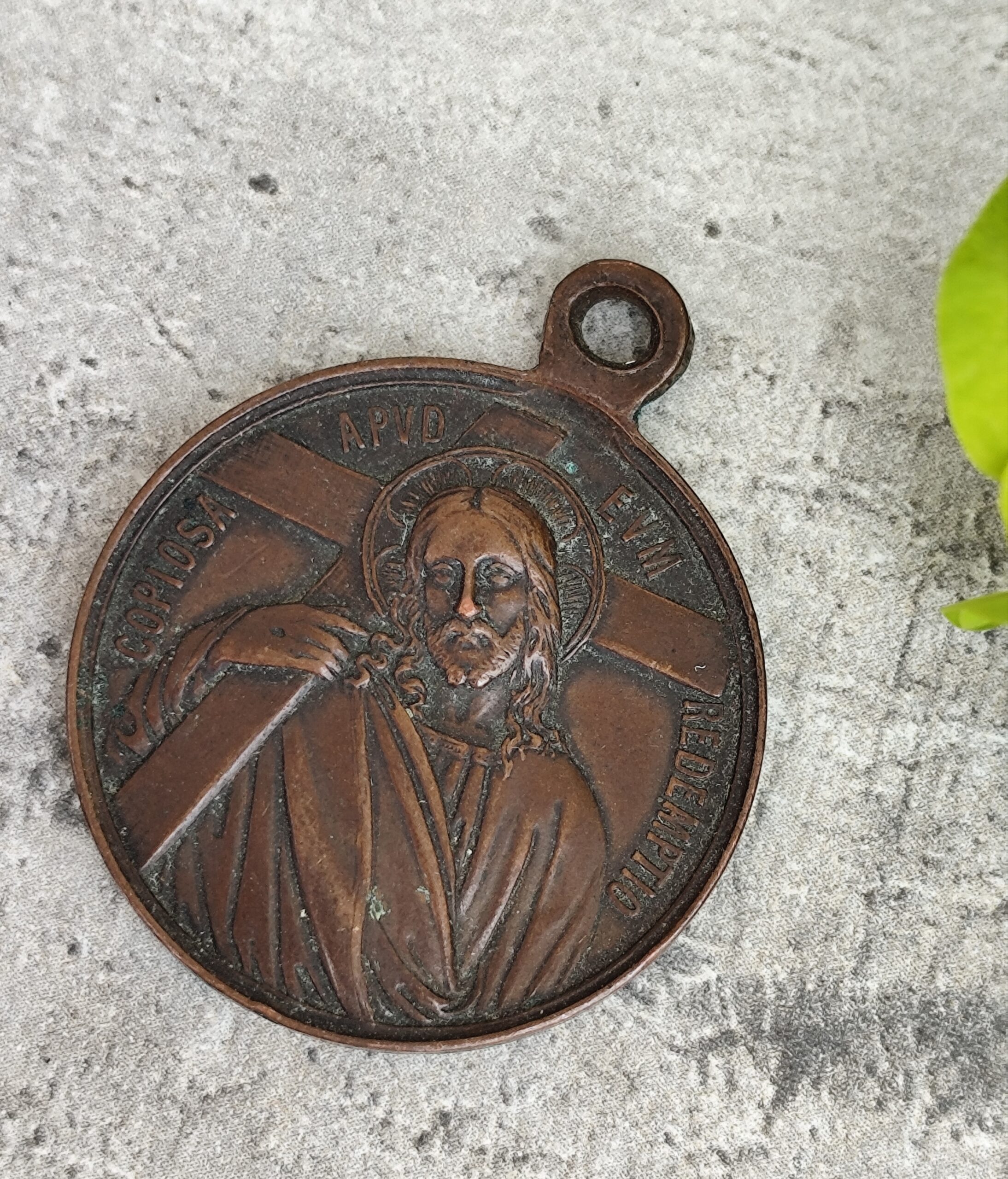 Cette médaille en cuivre réunit deux figures majeures de la tradition chrétienne :