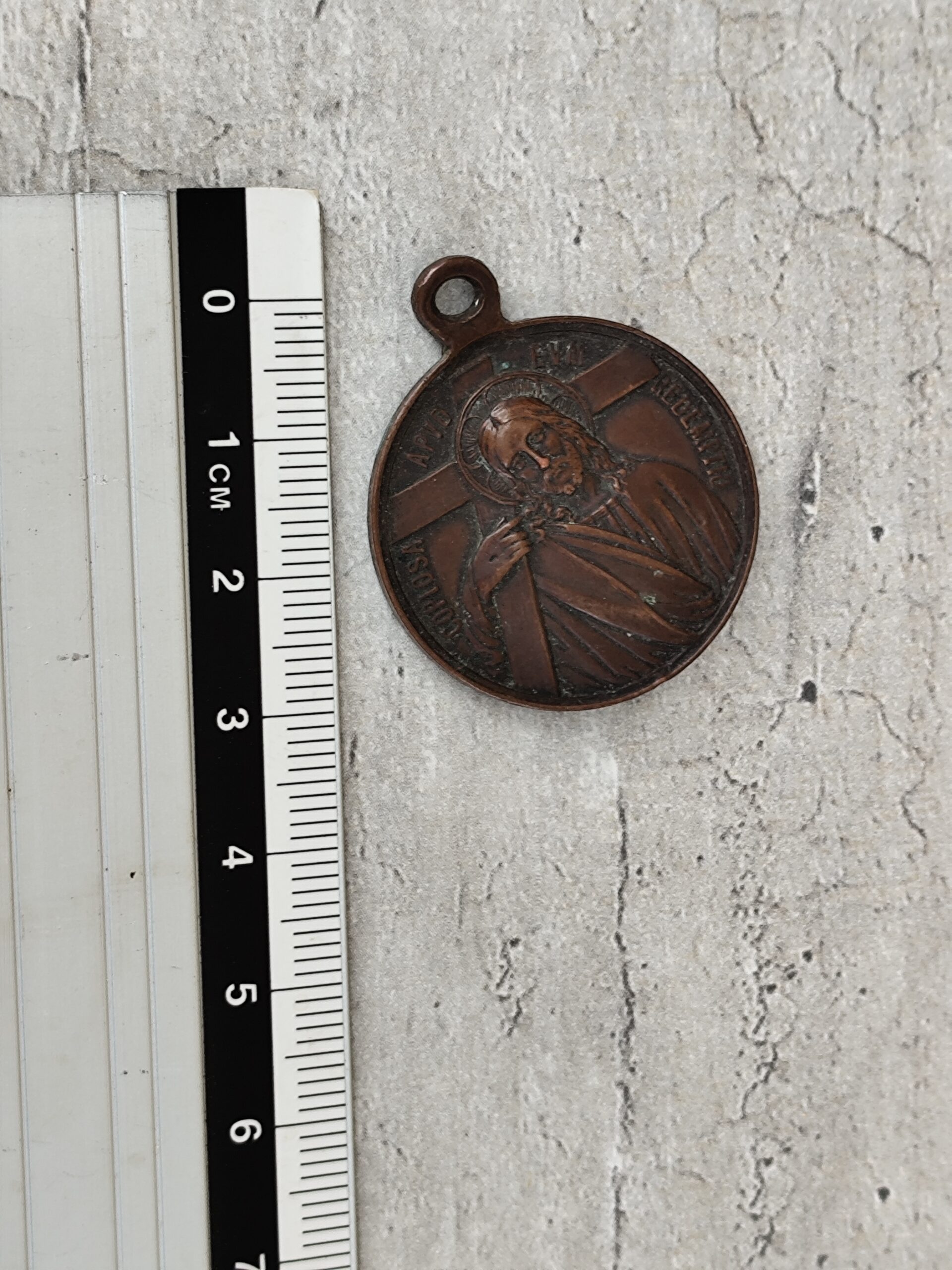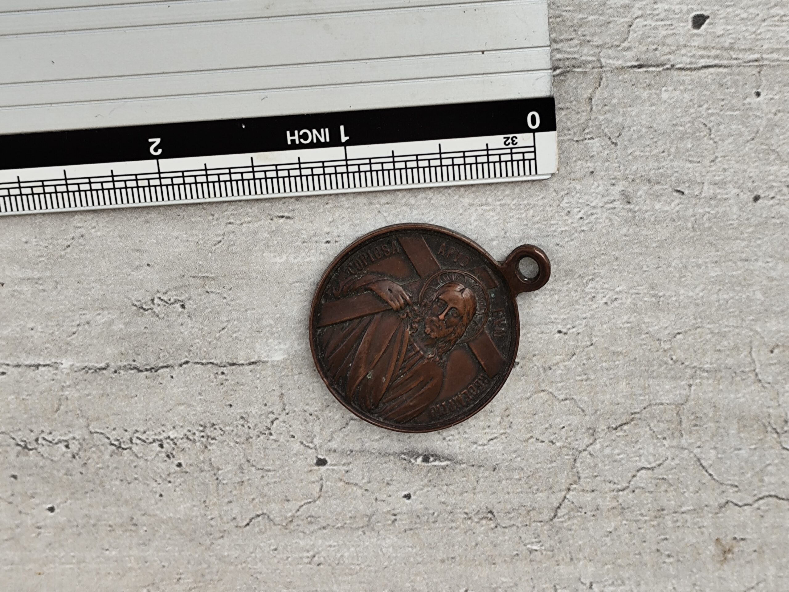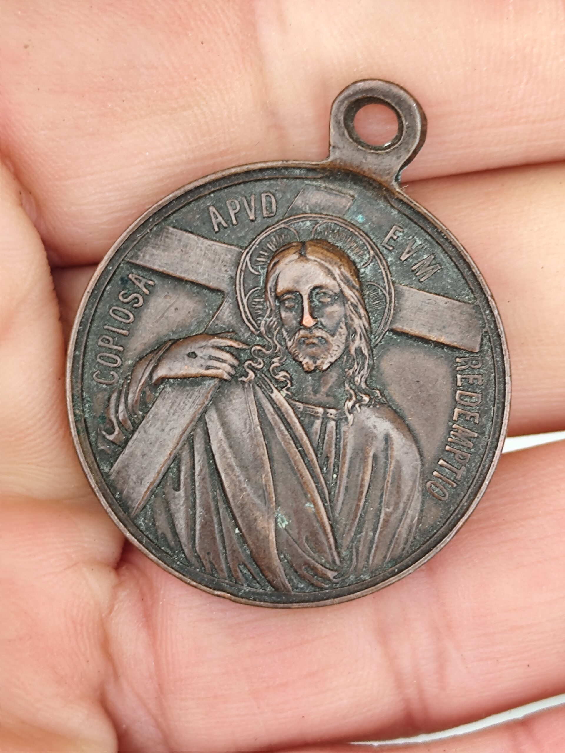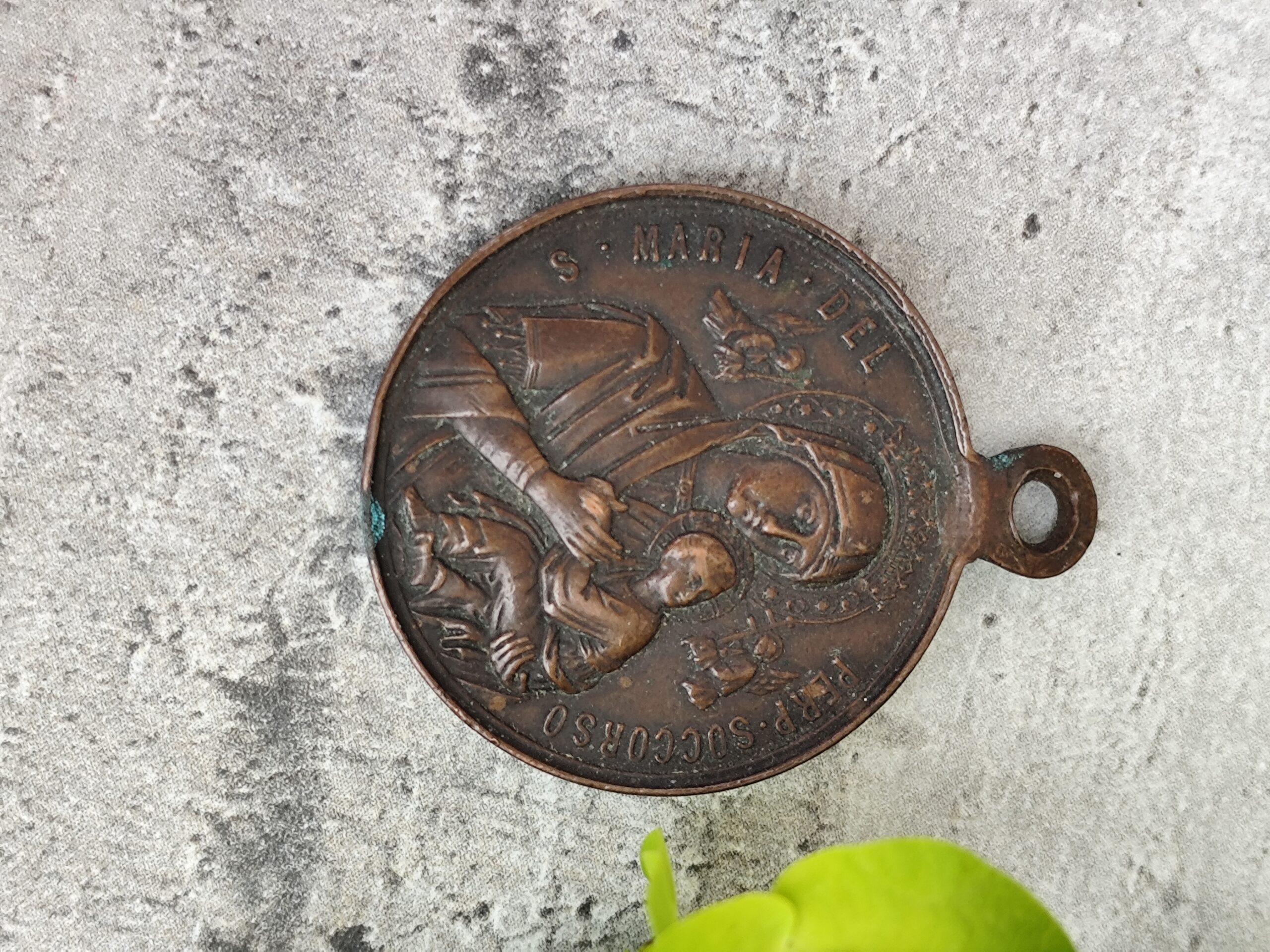 Cette médaille en cuivre réunit deux figures majeures de la tradition chrétienne :