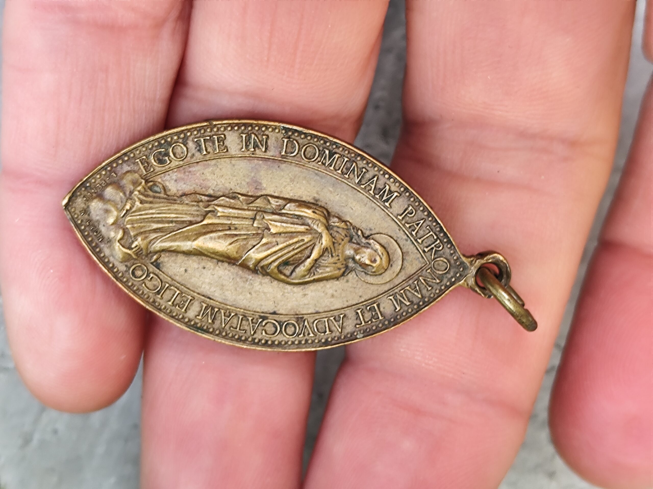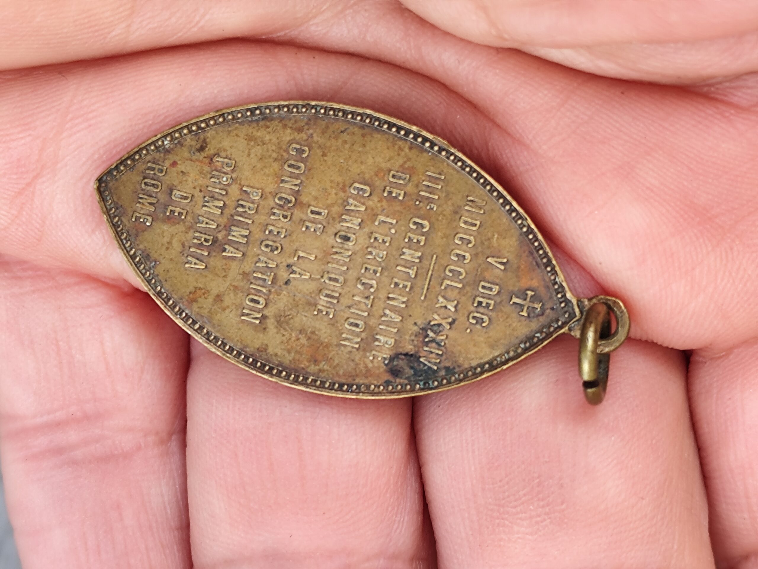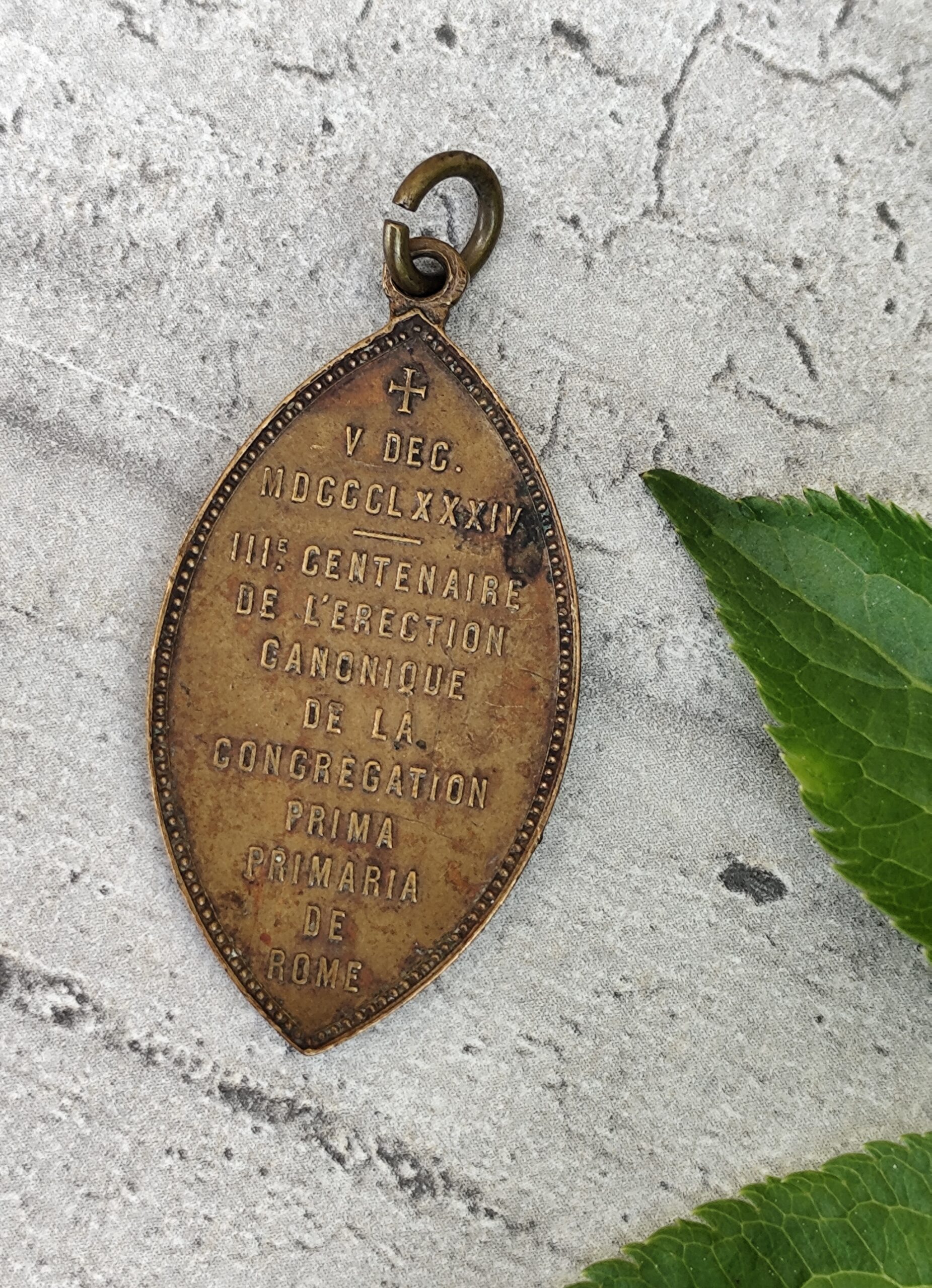 Cette médaille religieuse ancienne, frappée en 1884, commémore le troisième centenaire de l’érection canonique de la Congrégation Prima Primaria de Rome. En cuivre  patiné par le temps, elle porte une inscription précise et solennelle, témoin d’une tradition spirituelle profondément ancrée.
