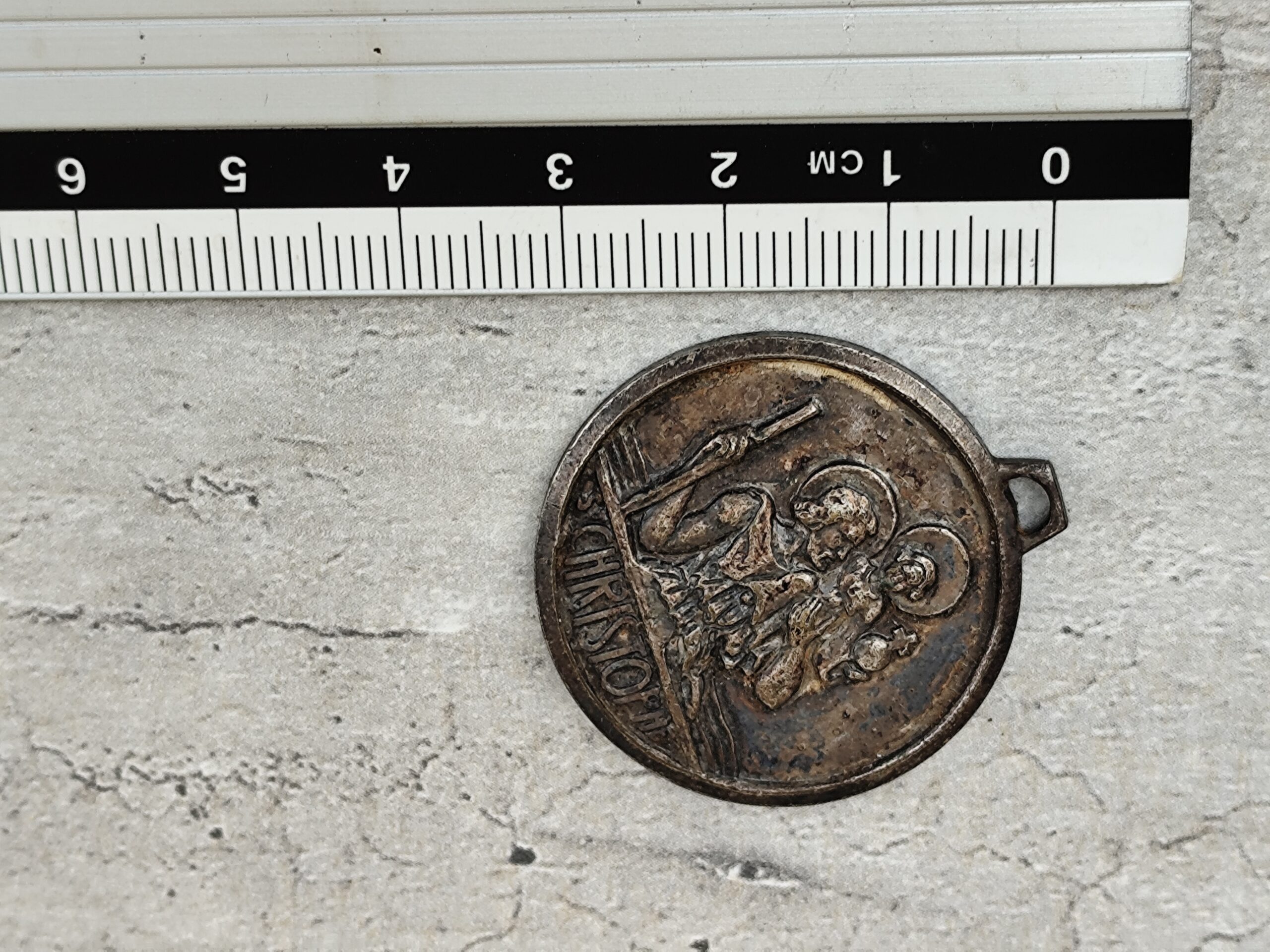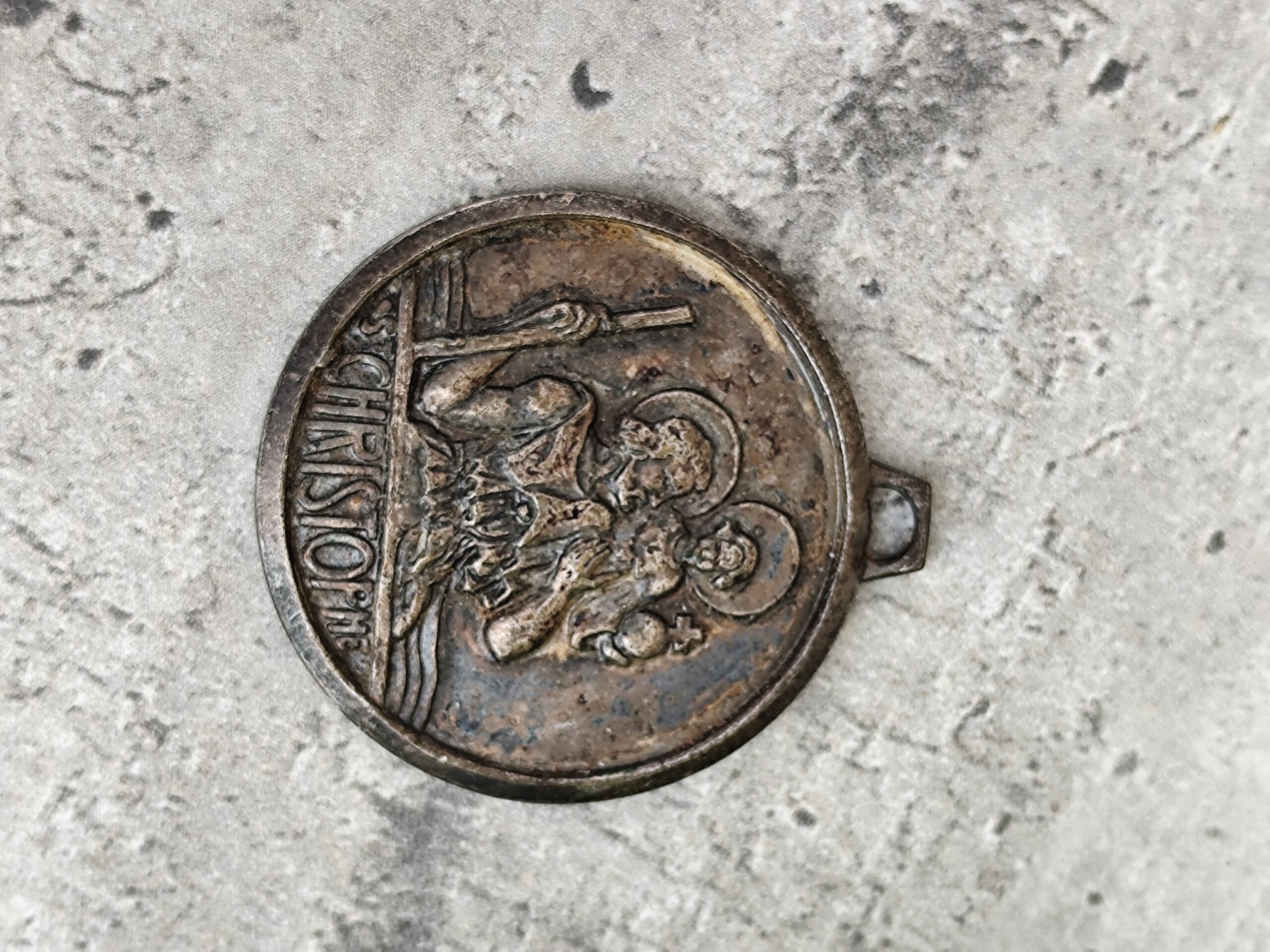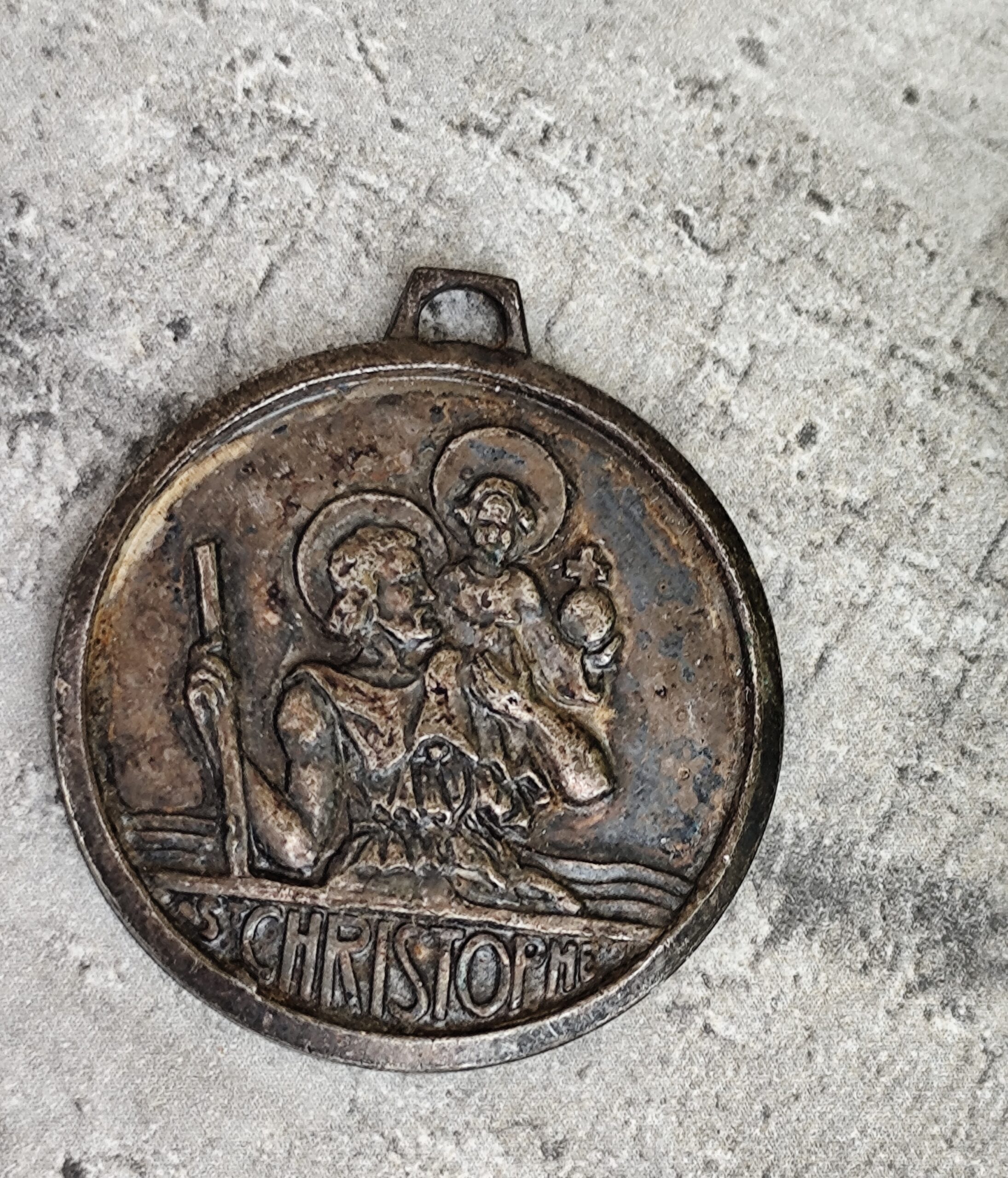 Médaille ancienne en métal représentant Saint Christophe portant l’Enfant Jésus, symbole universel de protection et de guidance.