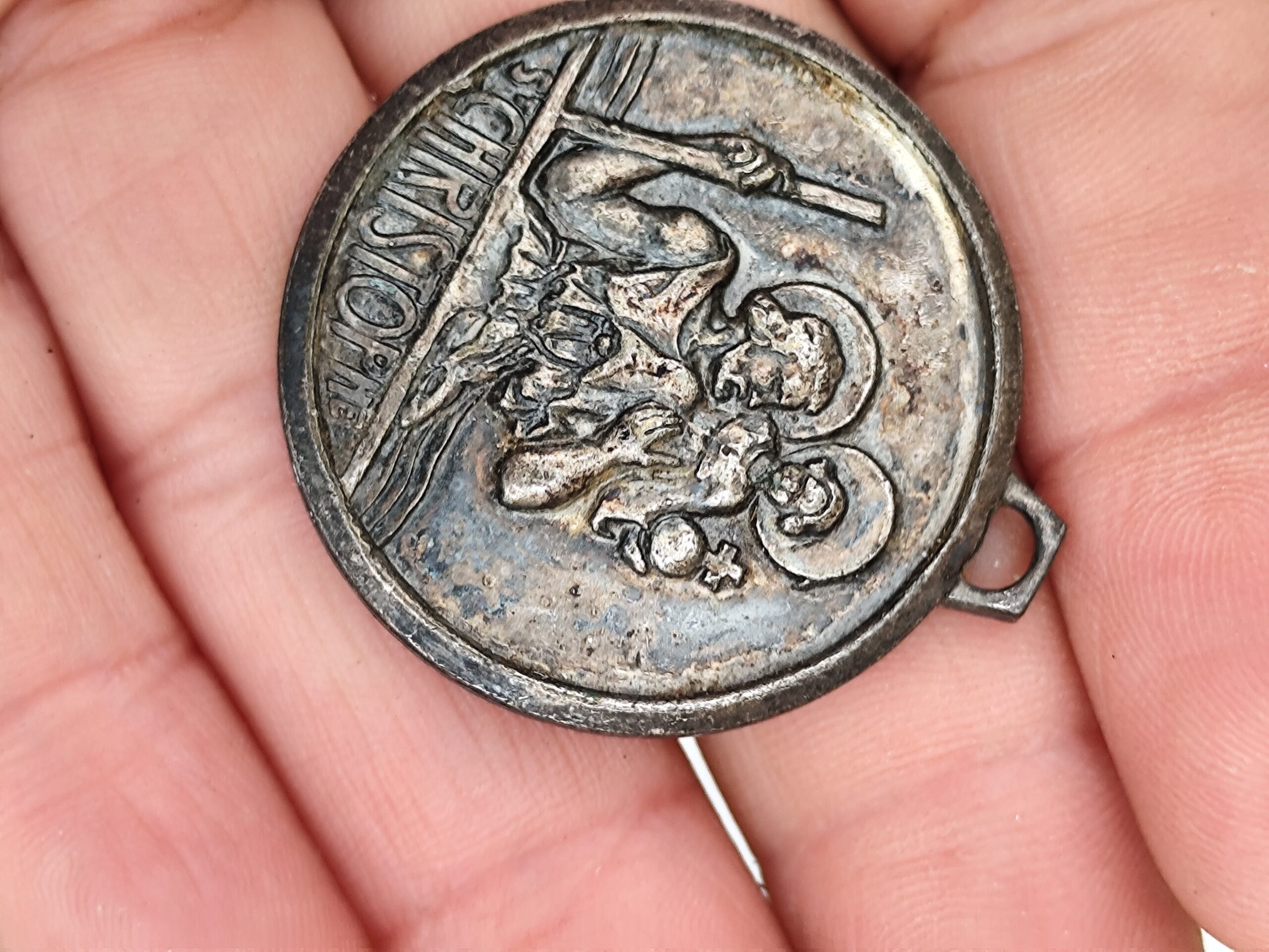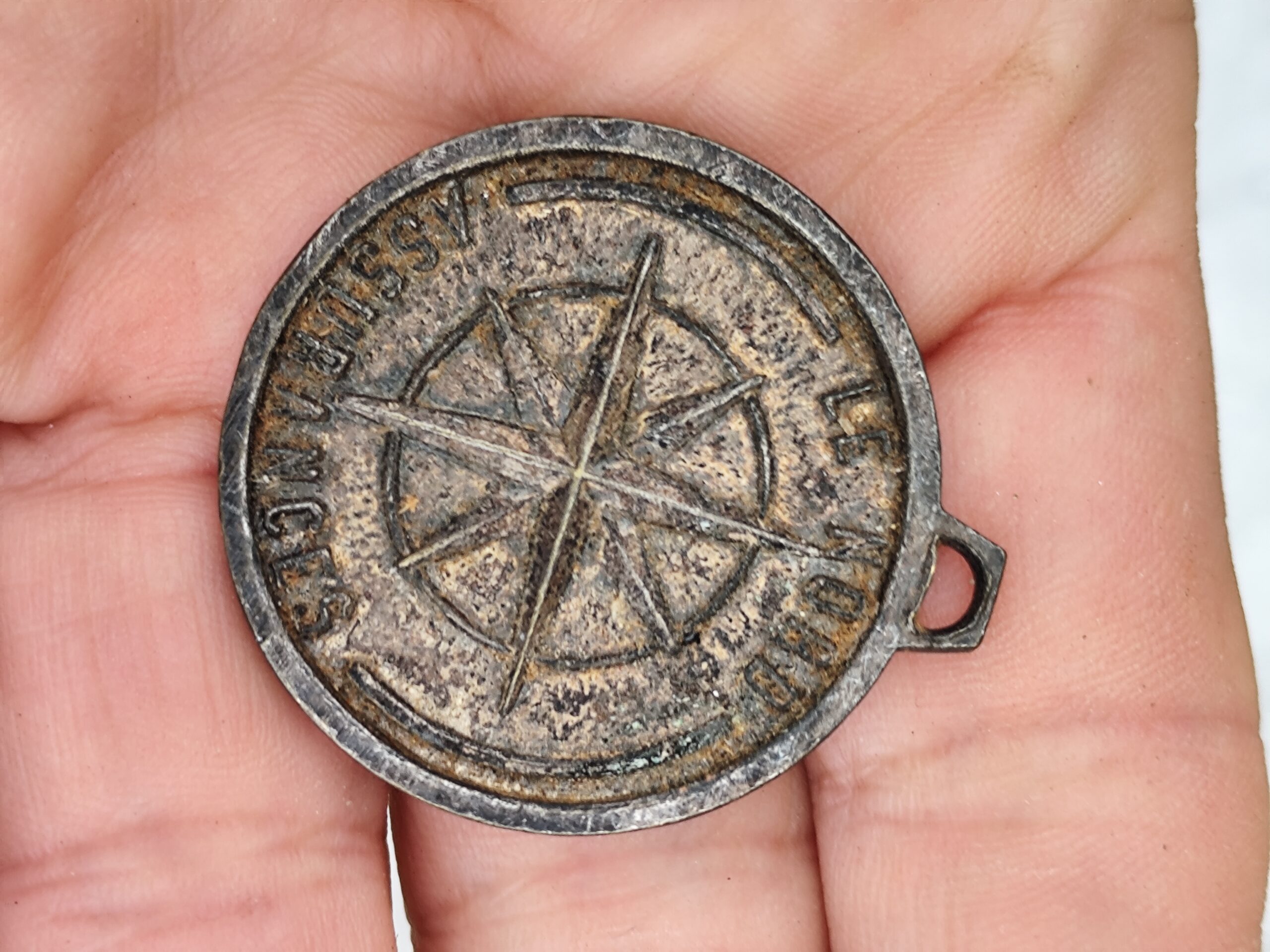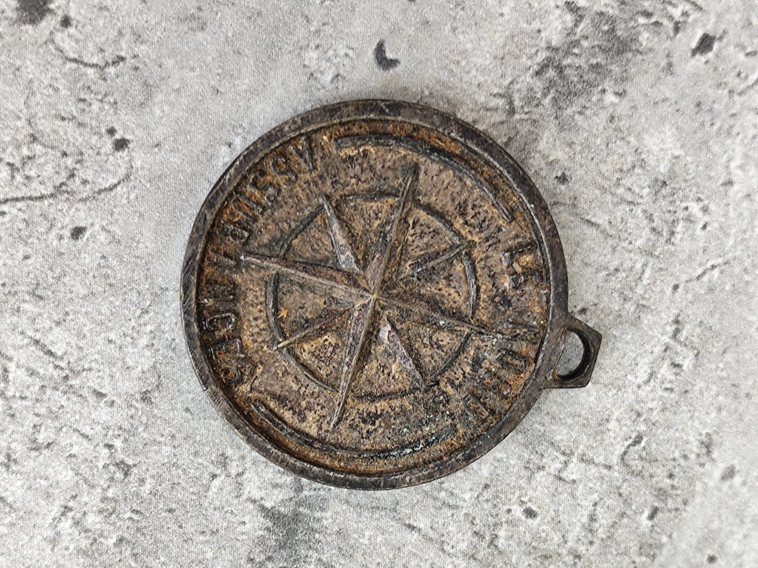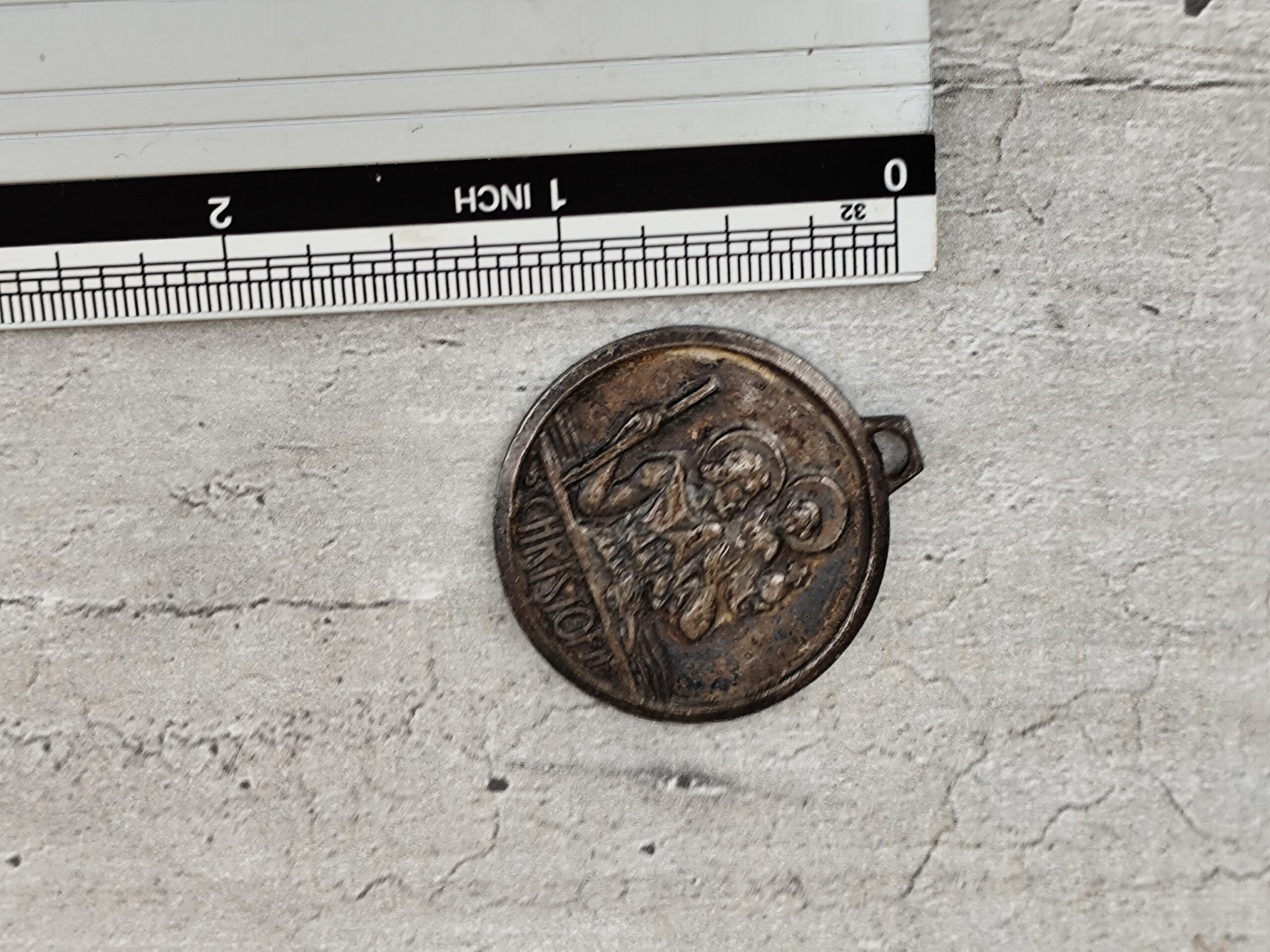 Médaille ancienne en métal représentant Saint Christophe portant l’Enfant Jésus, symbole universel de protection et de guidance.