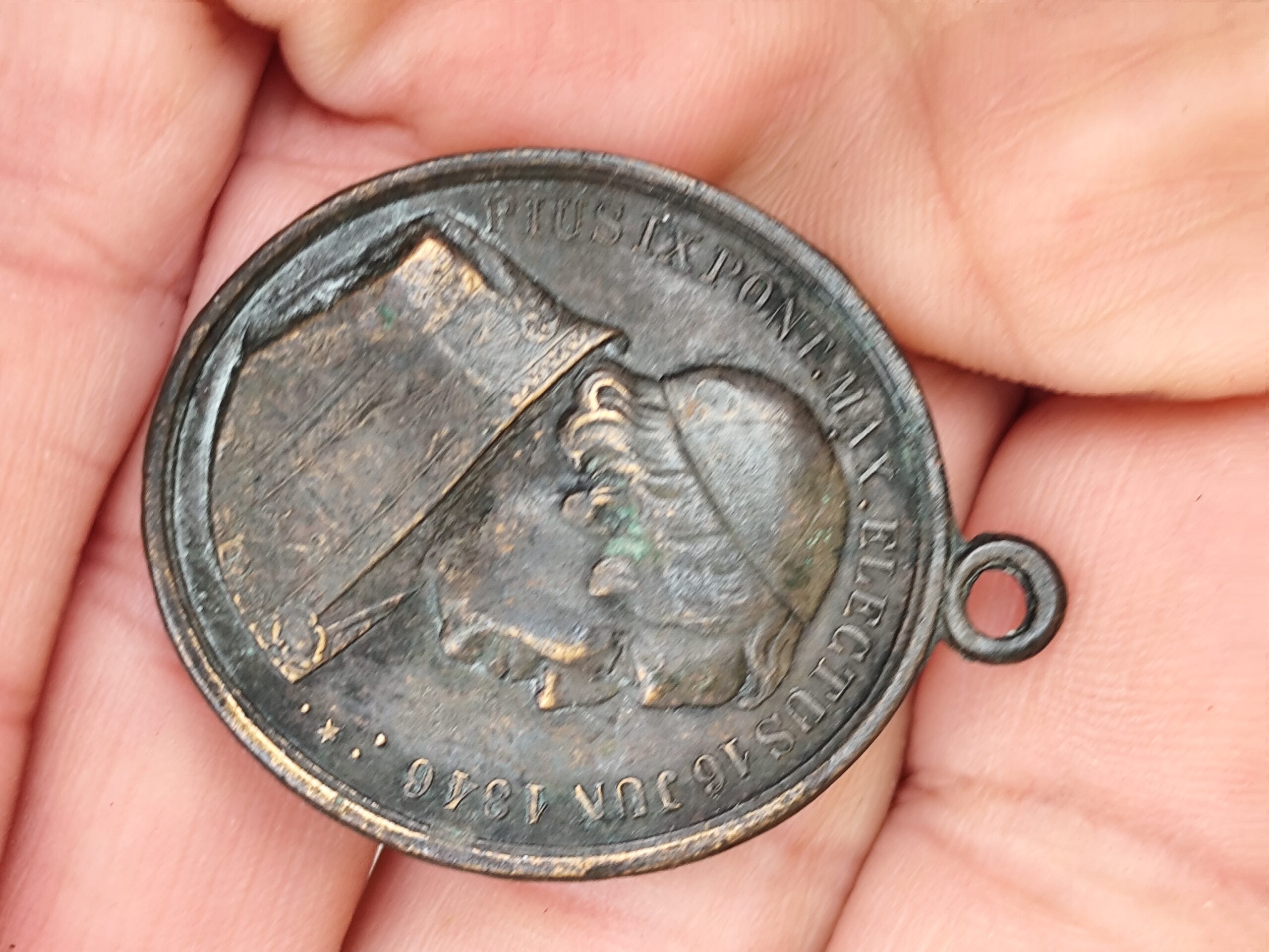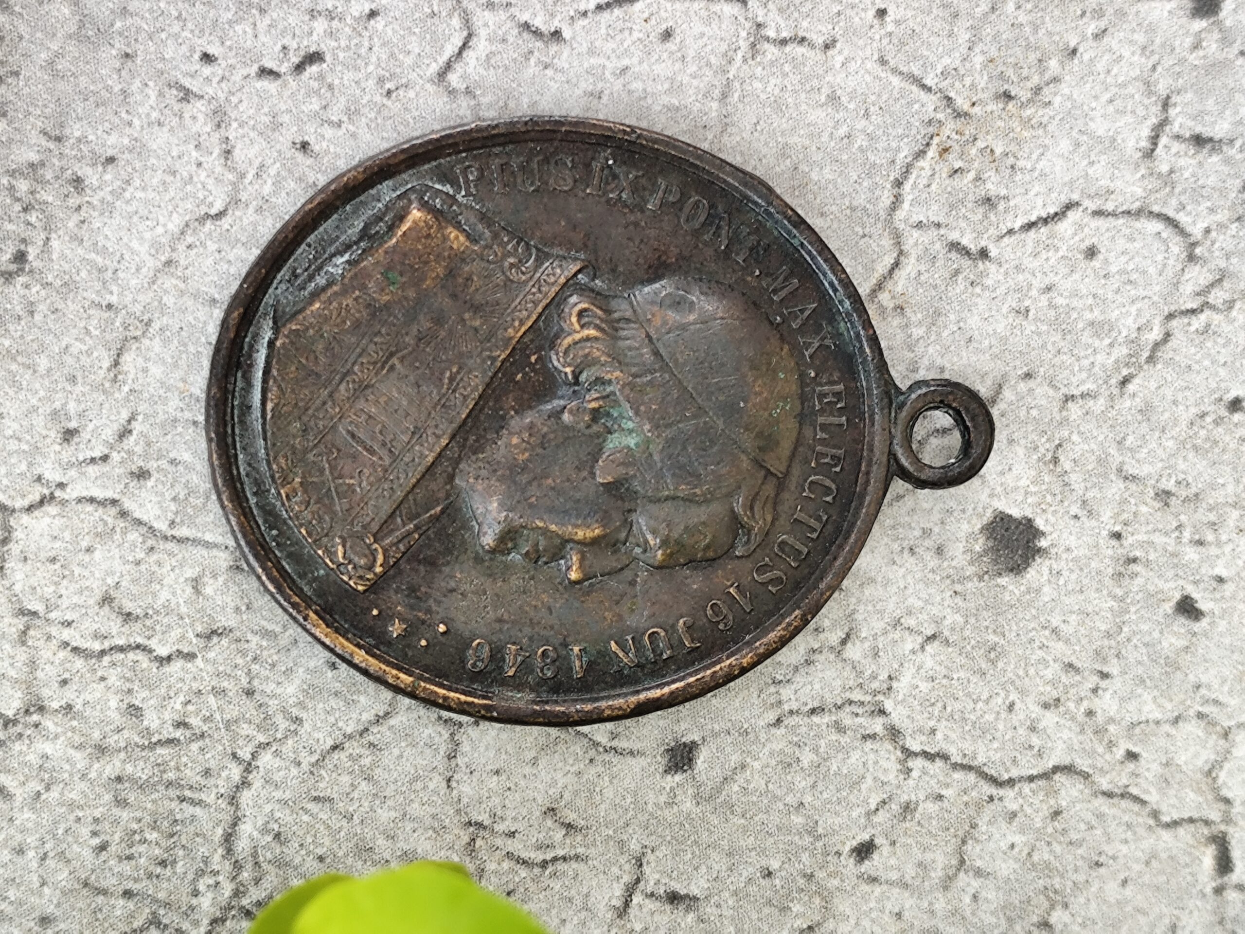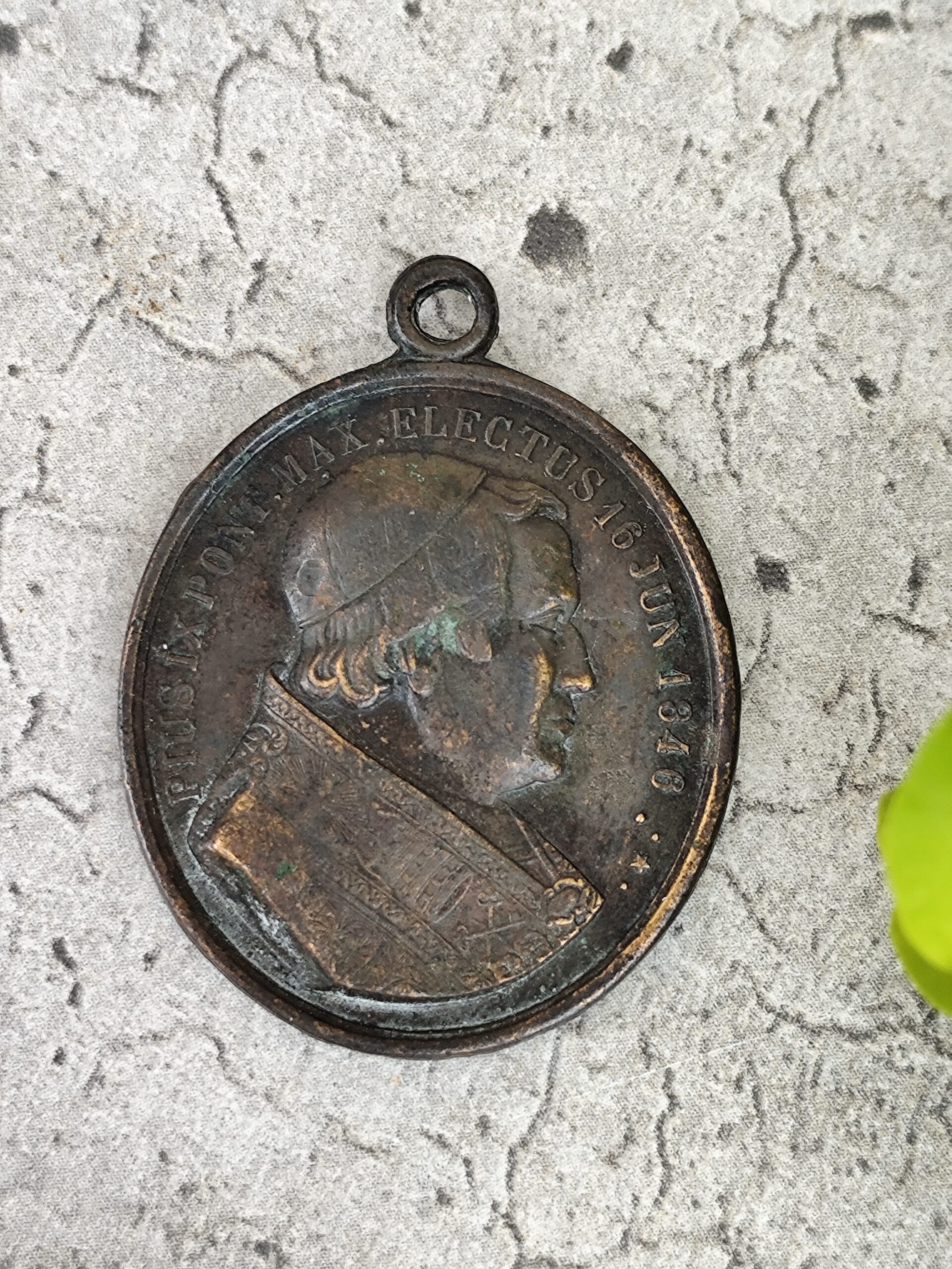 L’avers présente le pape Pie IX, avec la mention de son élection en 1846, ce qui situe la médaille dans la seconde moitié du XIXᵉ siècle.