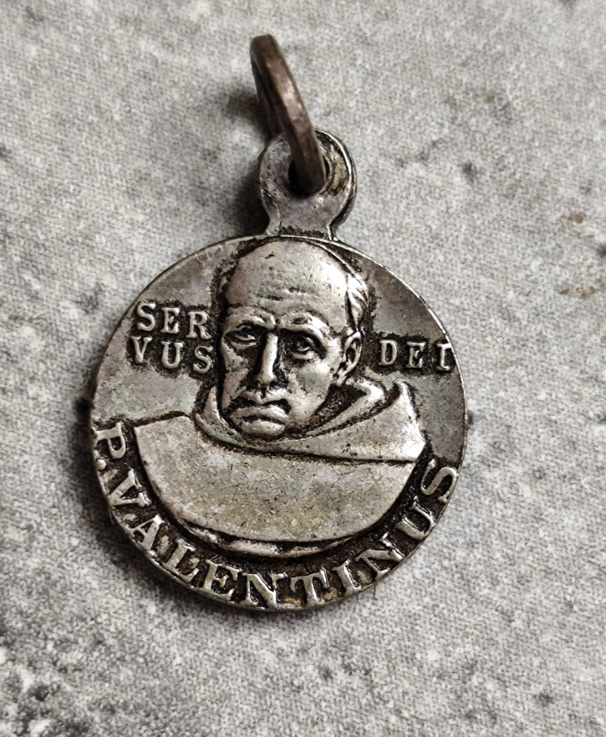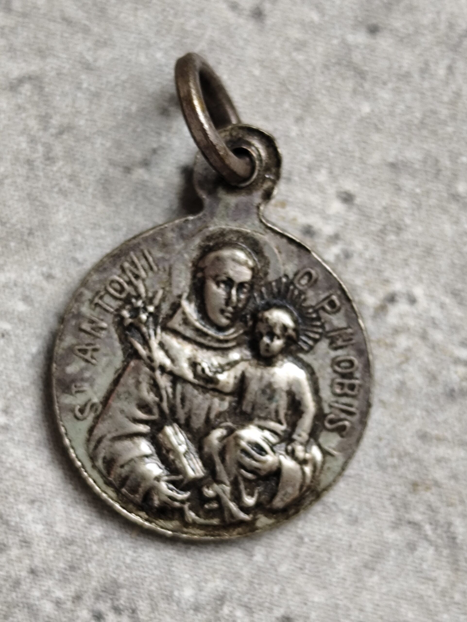 Ancienne médaille religieuse Saint Antoine de Padoue et Saint Valentin, pendentif vintage en métal argenté, bijou de dévotion catholique.