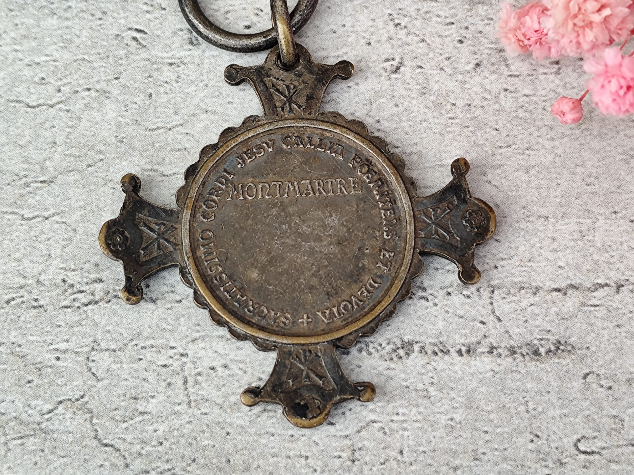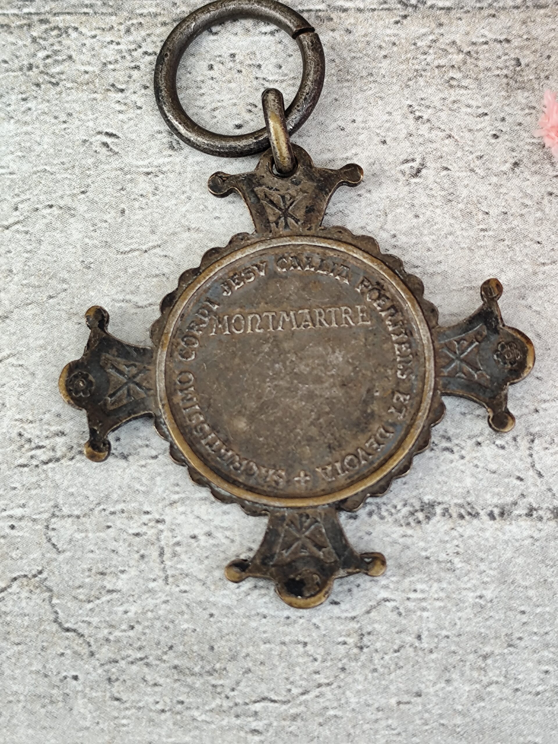 Médaillon religieux vintage – Croix Sacré-Cœur de Jésus Montmartre – Art sacré ancien.