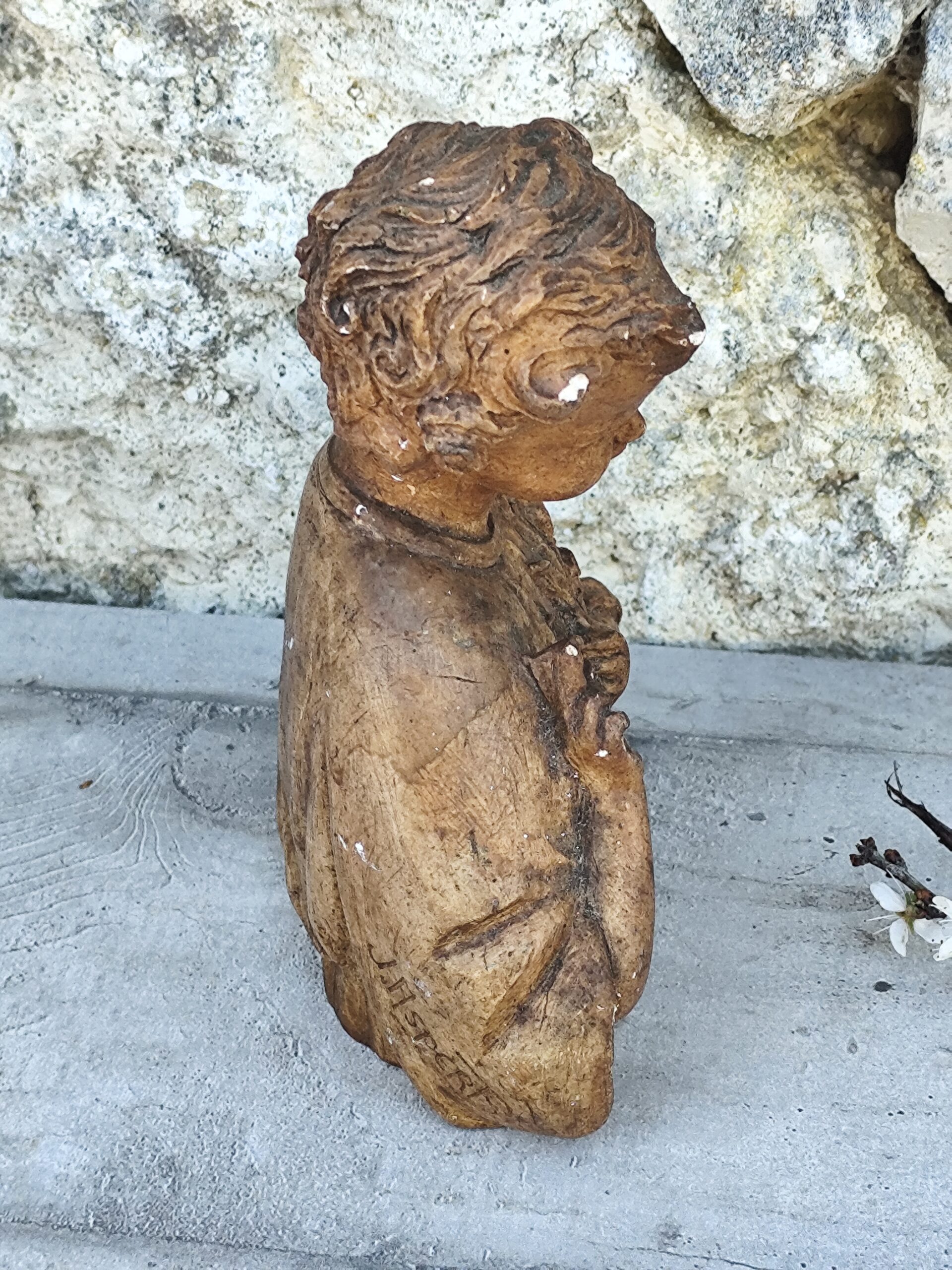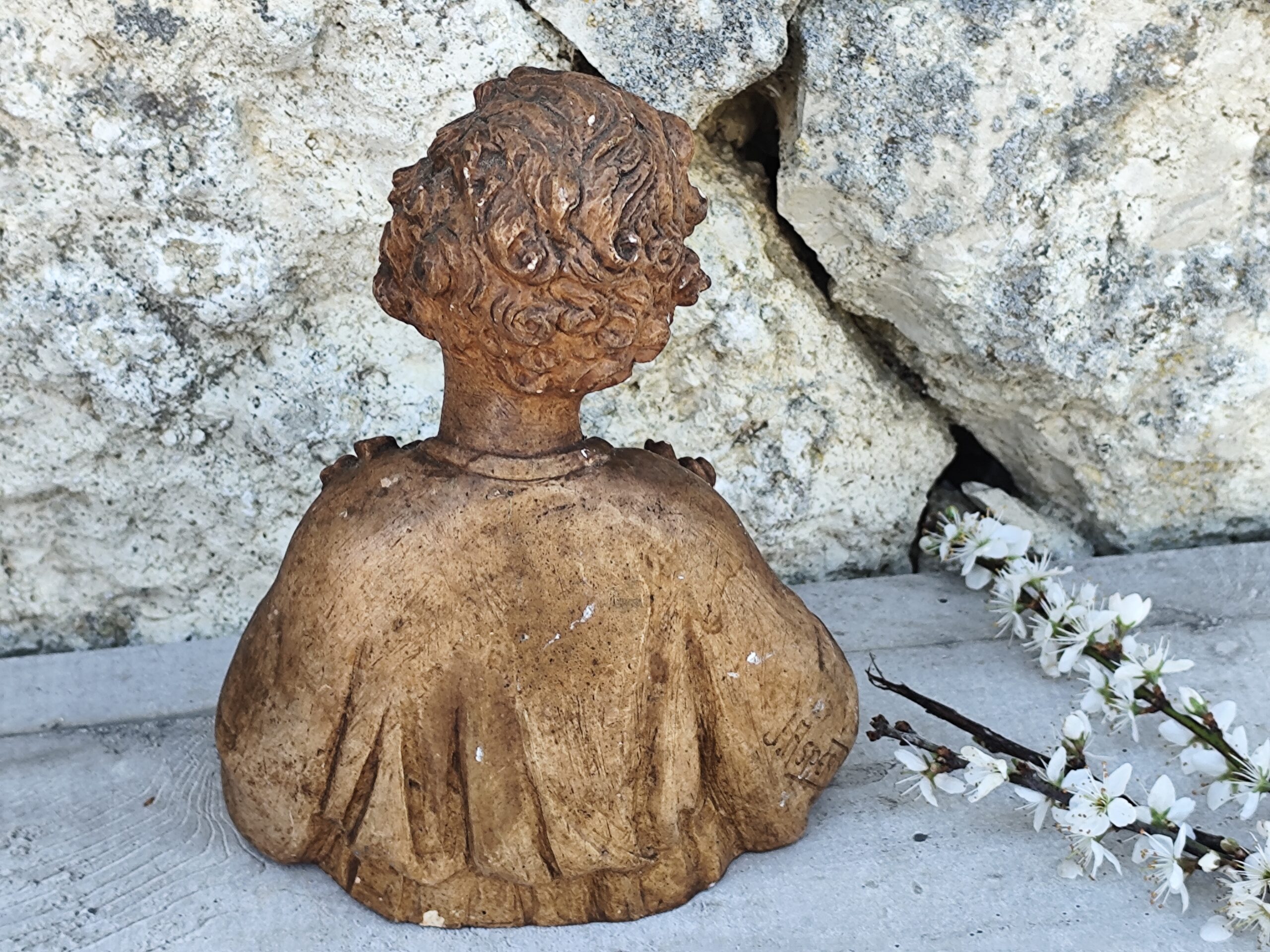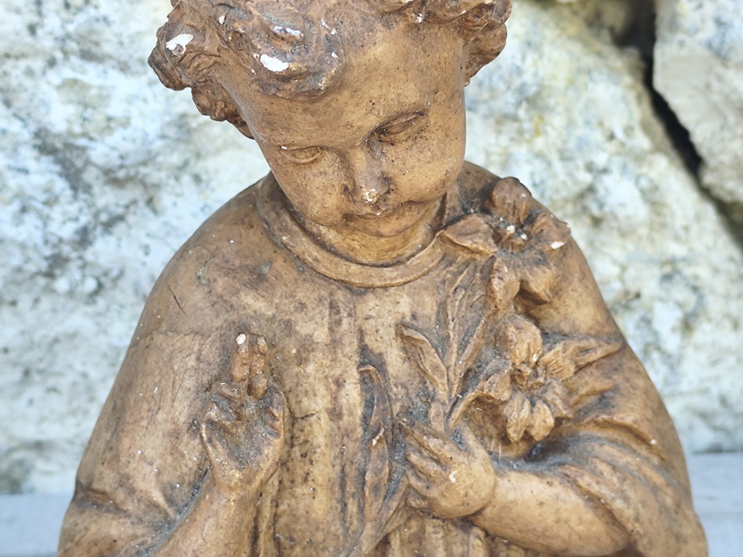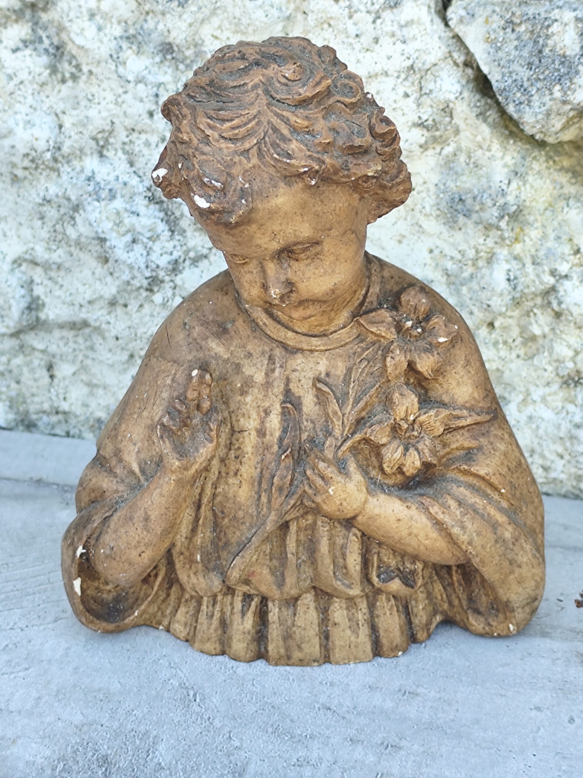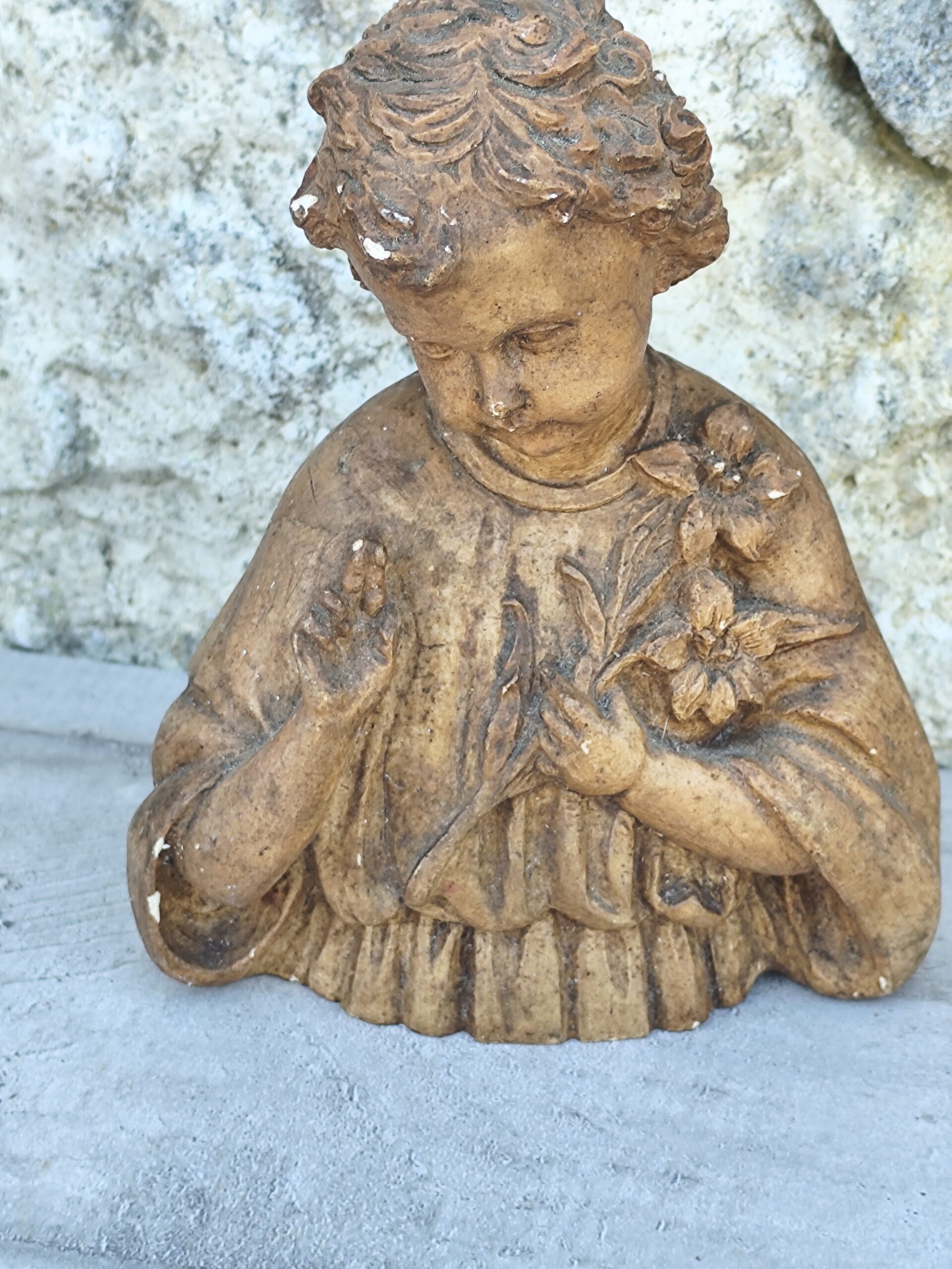 Buste religieux ancien représentant l’enfant Jésus, en plâtre patiné couleur pierre, tenant un bouquet de fleurs et bénissant de la main droite. Jolie pièce de dévotion ou de décoration, à poser sur un autel, une cheminée ou dans un coin prière. Traces d’usure et petits éclats de peinture qui ajoutent au charme vintage.