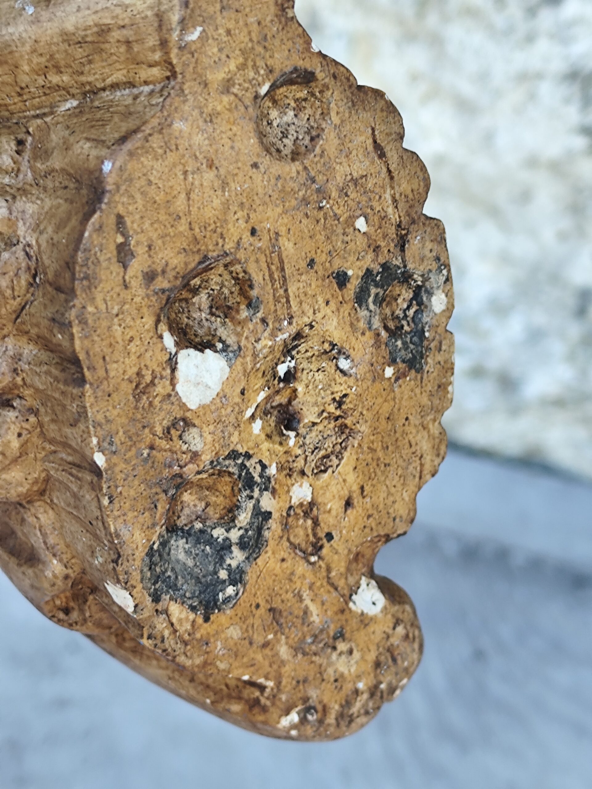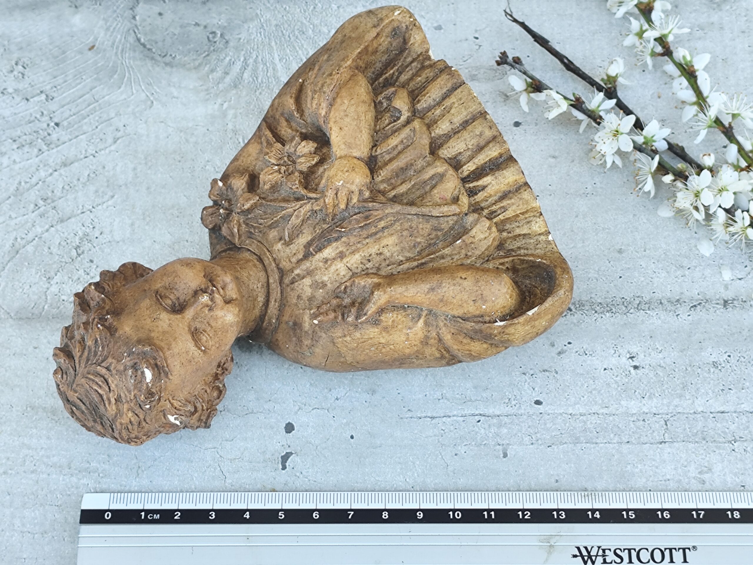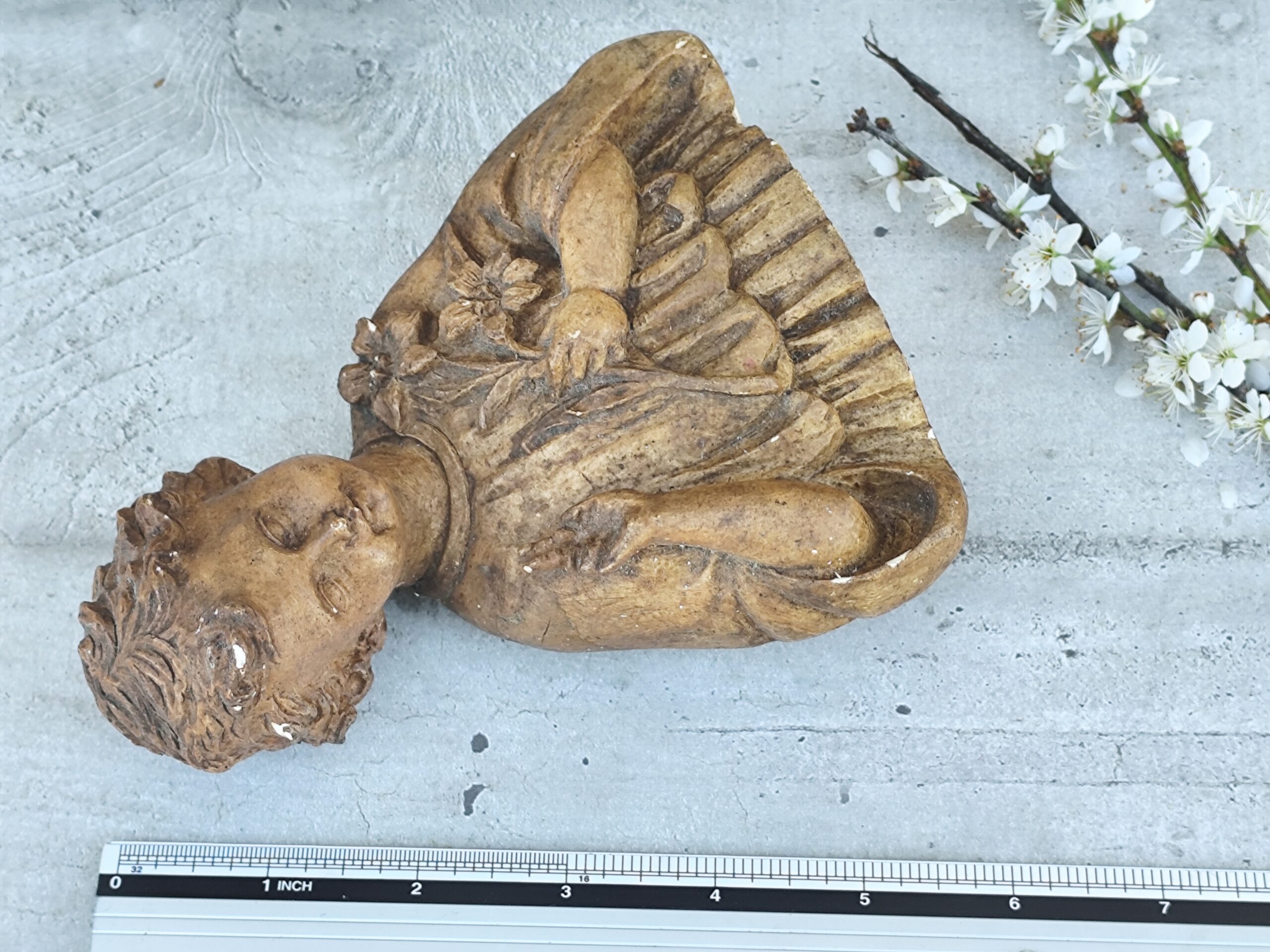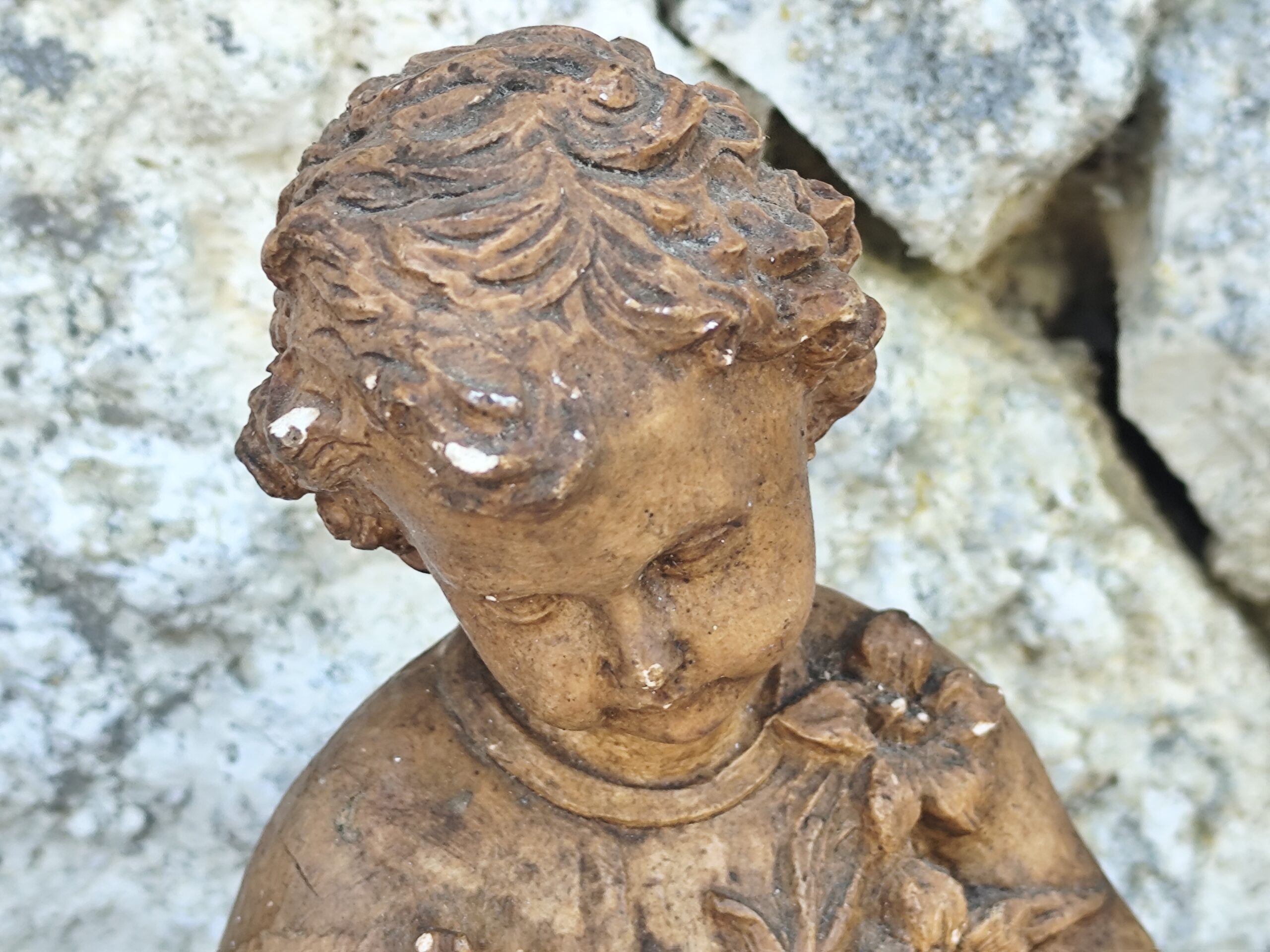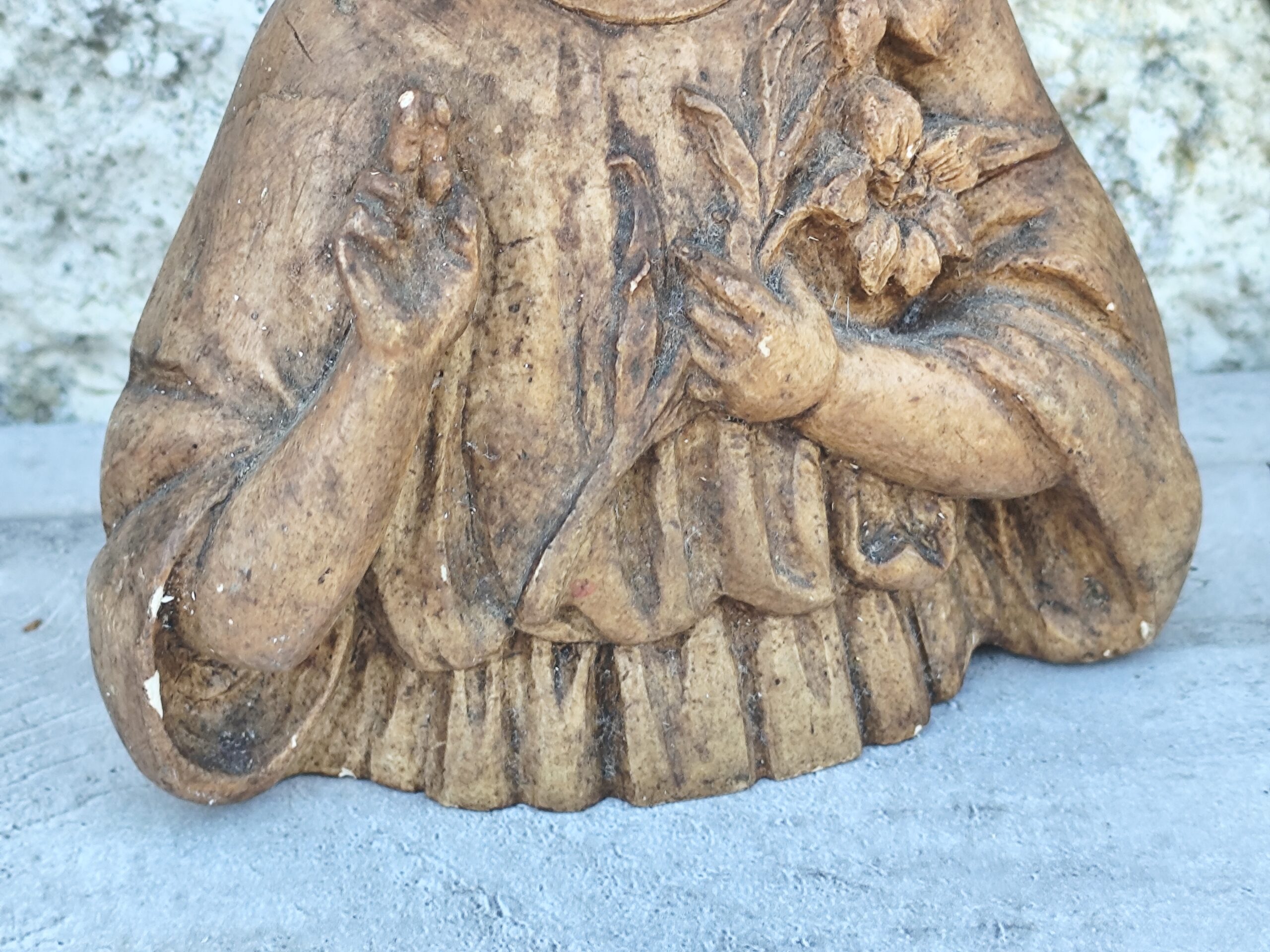 Buste religieux ancien représentant l’enfant Jésus, en plâtre patiné couleur pierre, tenant un bouquet de fleurs et bénissant de la main droite. Jolie pièce de dévotion ou de décoration, à poser sur un autel, une cheminée ou dans un coin prière. Traces d’usure et petits éclats de peinture qui ajoutent au charme vintage.